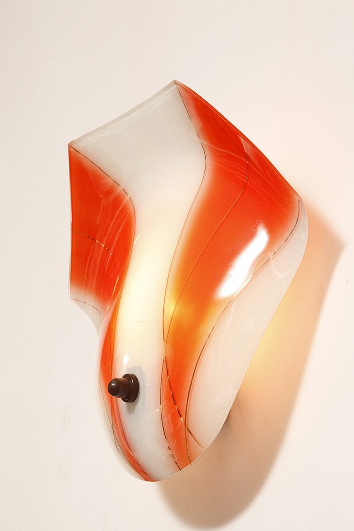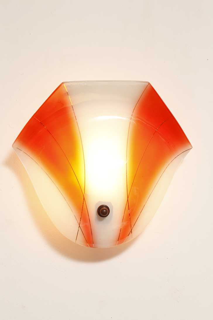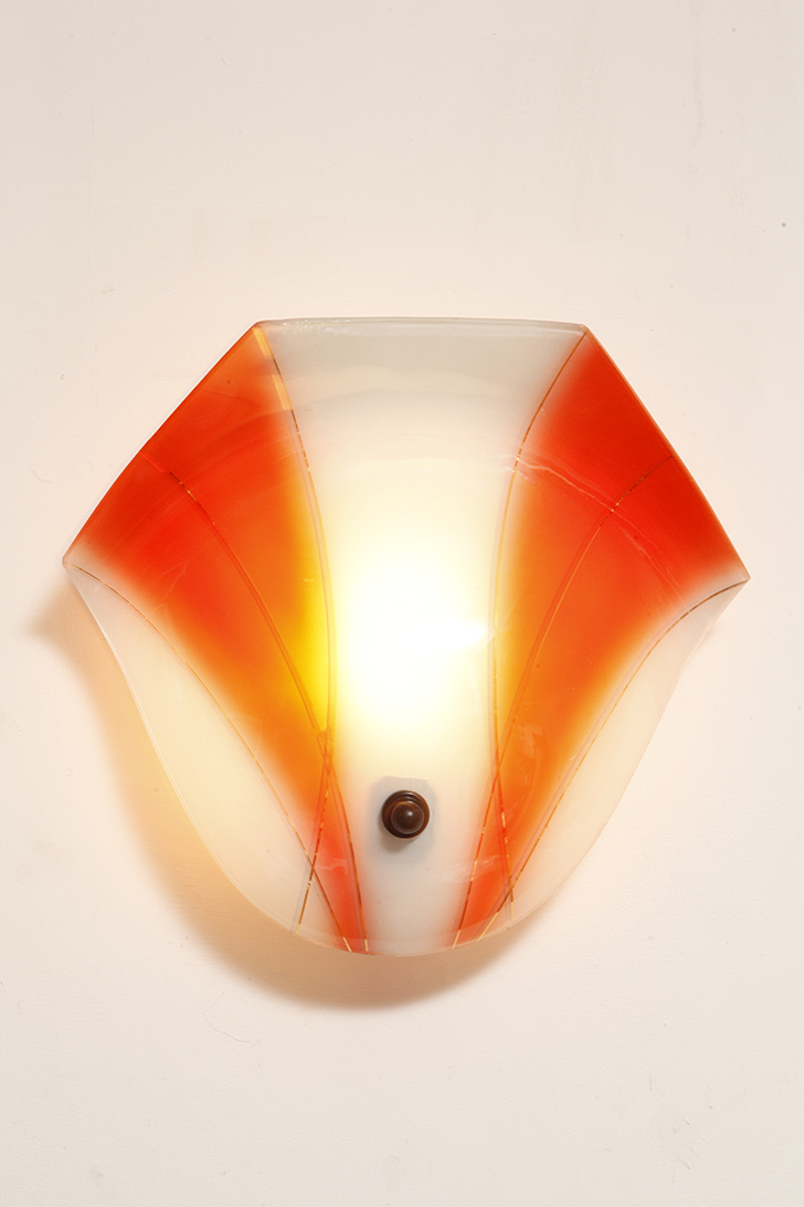 Efektowny mleczno czerwony szklany polski kinkiet. Falujący niczym kwiatowy kielich klosz będący główną i właściwie jedyną oprócz mocowania do ściany częścią.