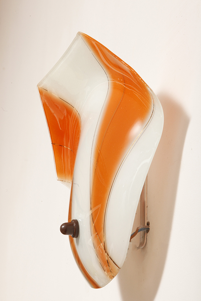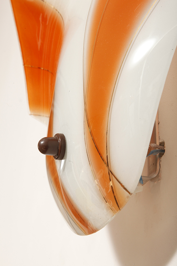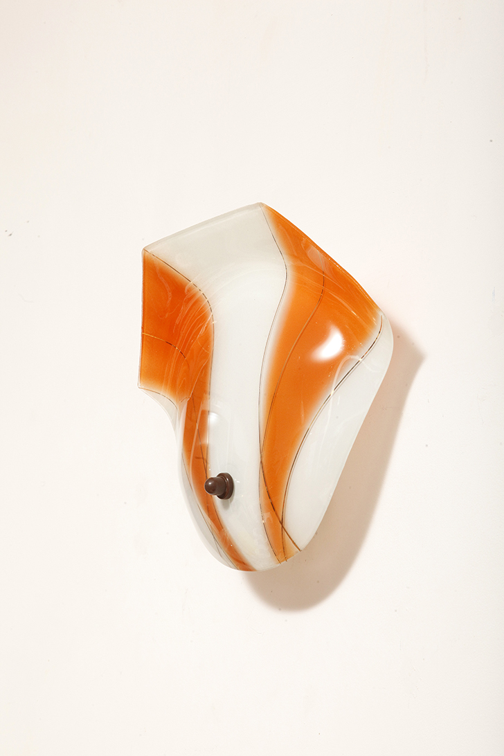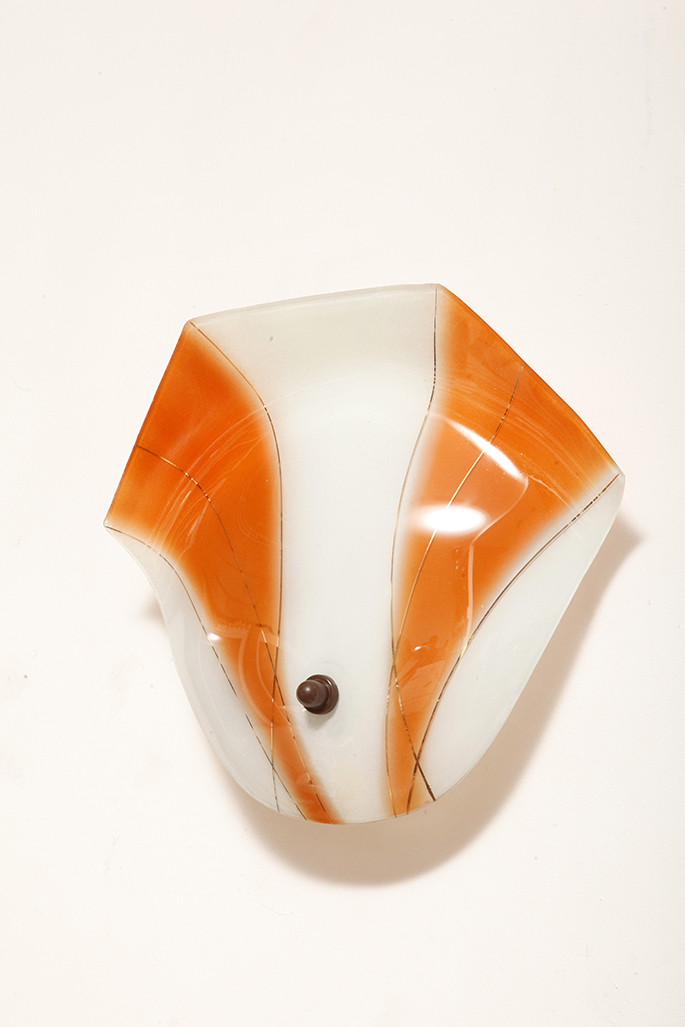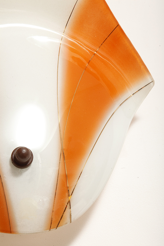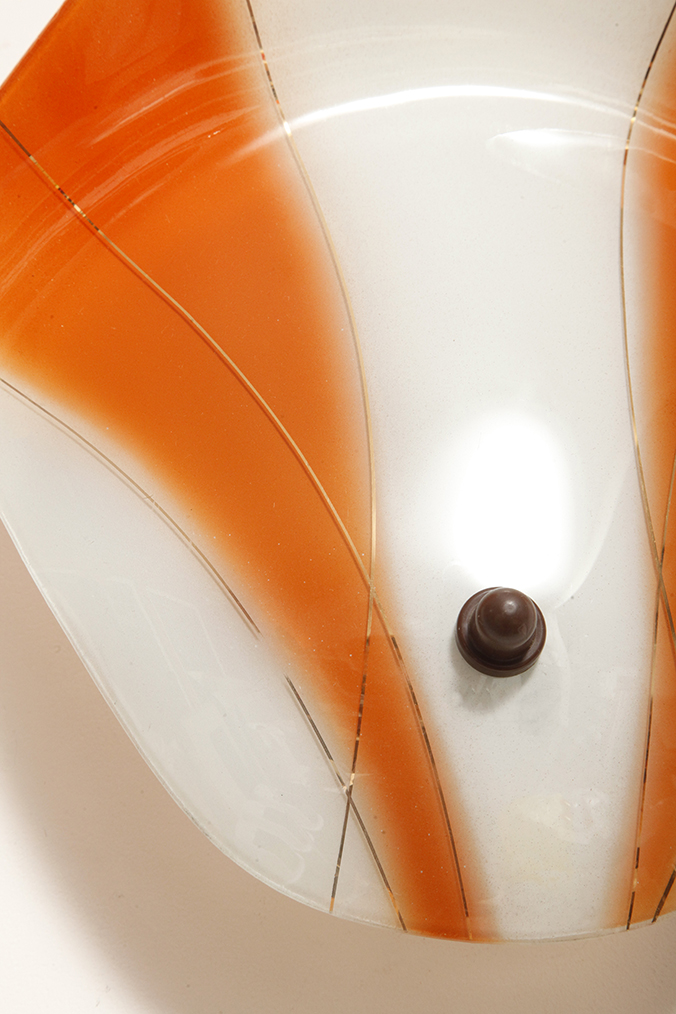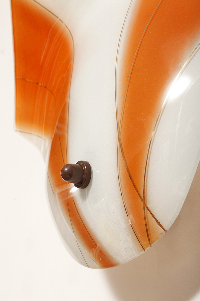 Duża mlecznobiało-pomarańczowa jednopunktowa szklana lampa ścienna/kinkiet ze złoceniami w kształcie rozłożystego liścia, Polska, lata 60.