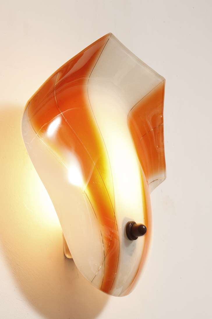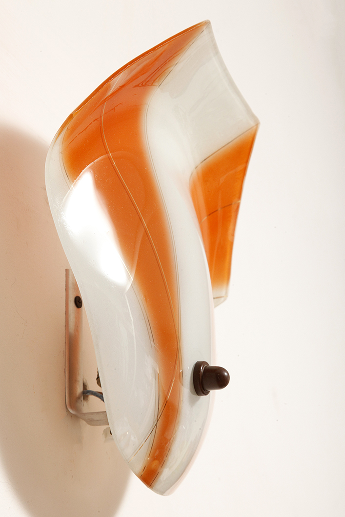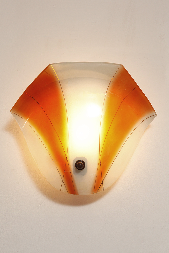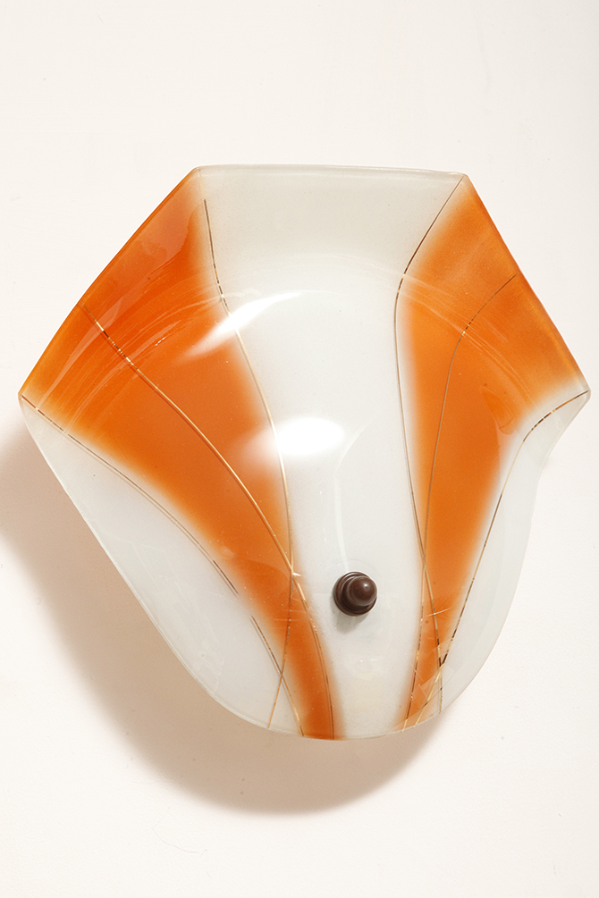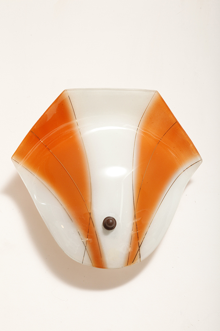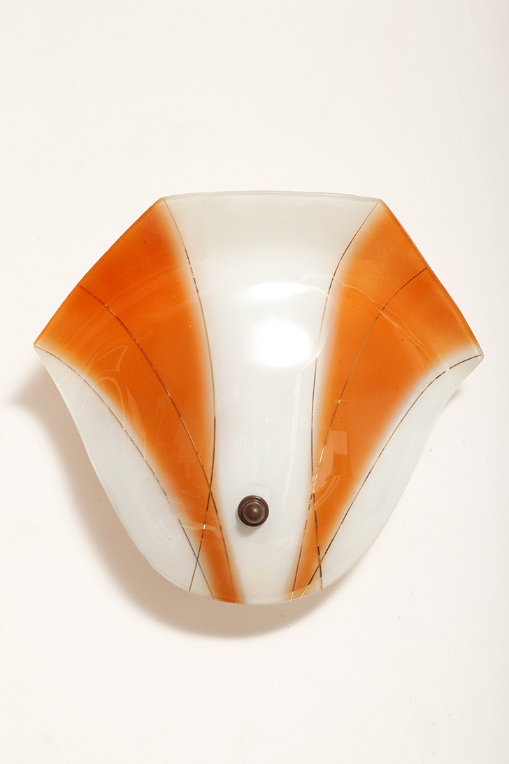 Efektowny mleczno pomarańczowy szklany polski kinkiet. Falujący niczym kwiatowy kielich klosz będący główną i właściwie jedyną oprócz mocowania do ściany częścią.