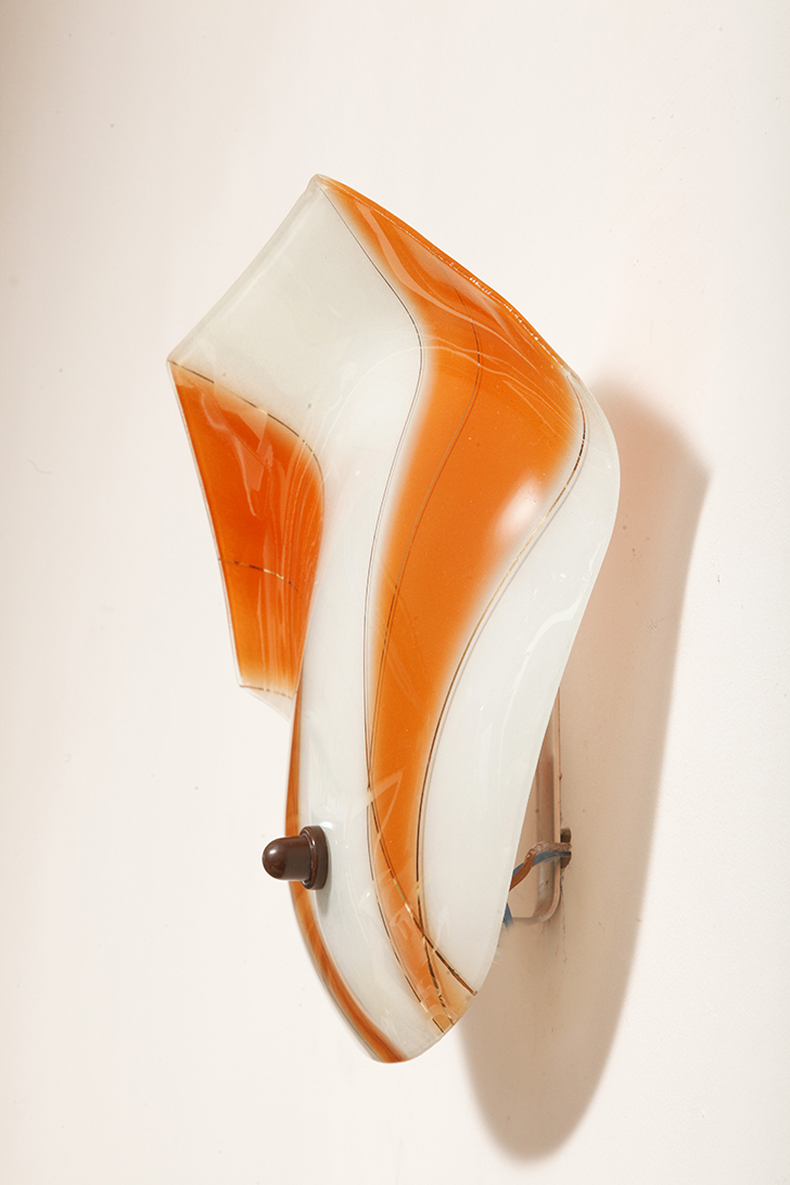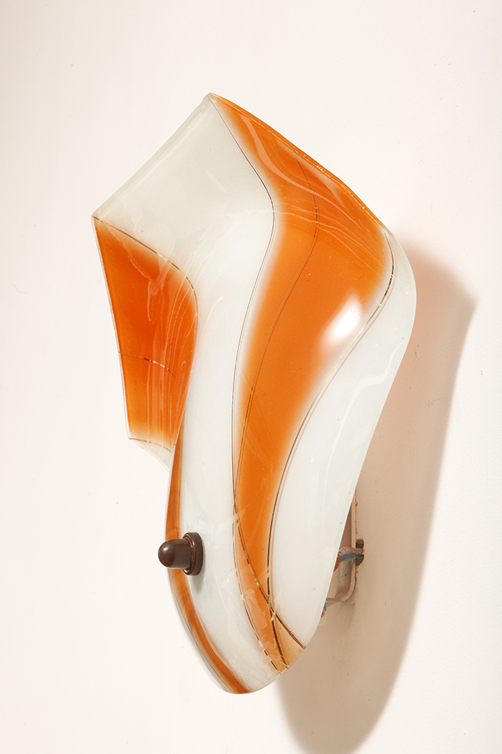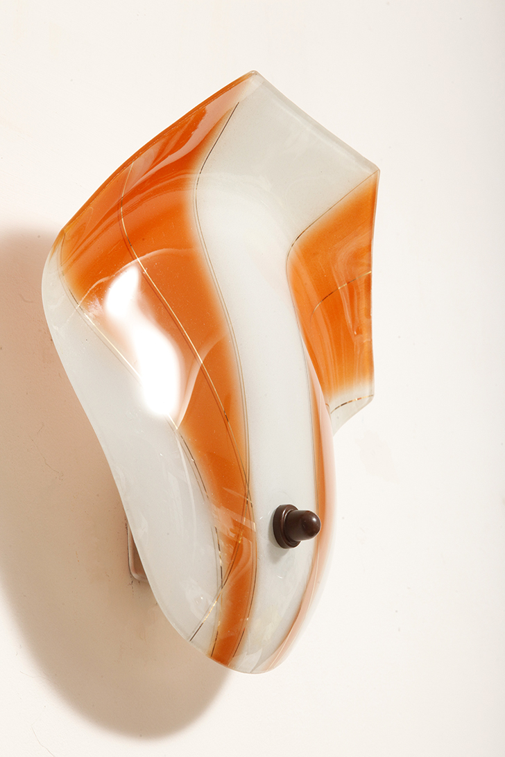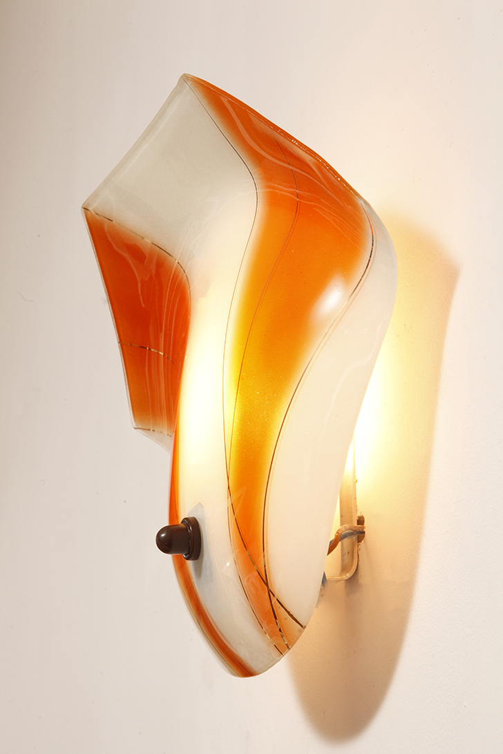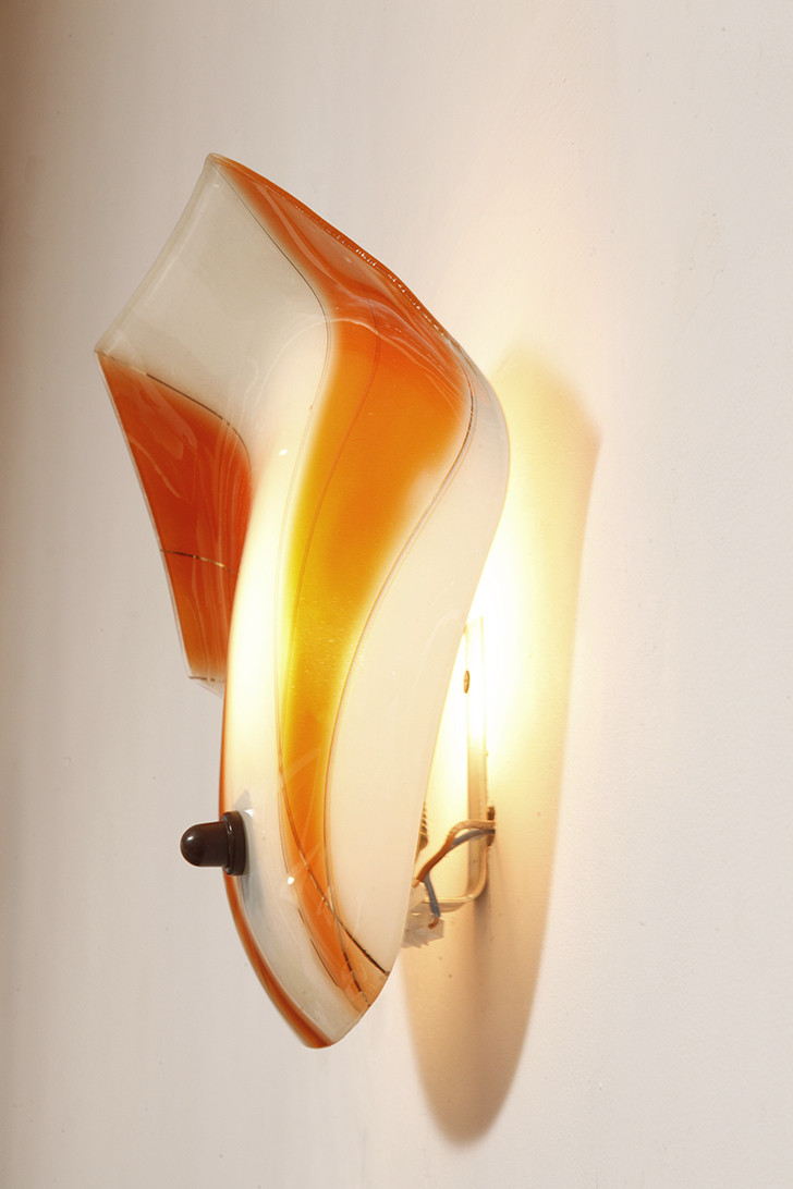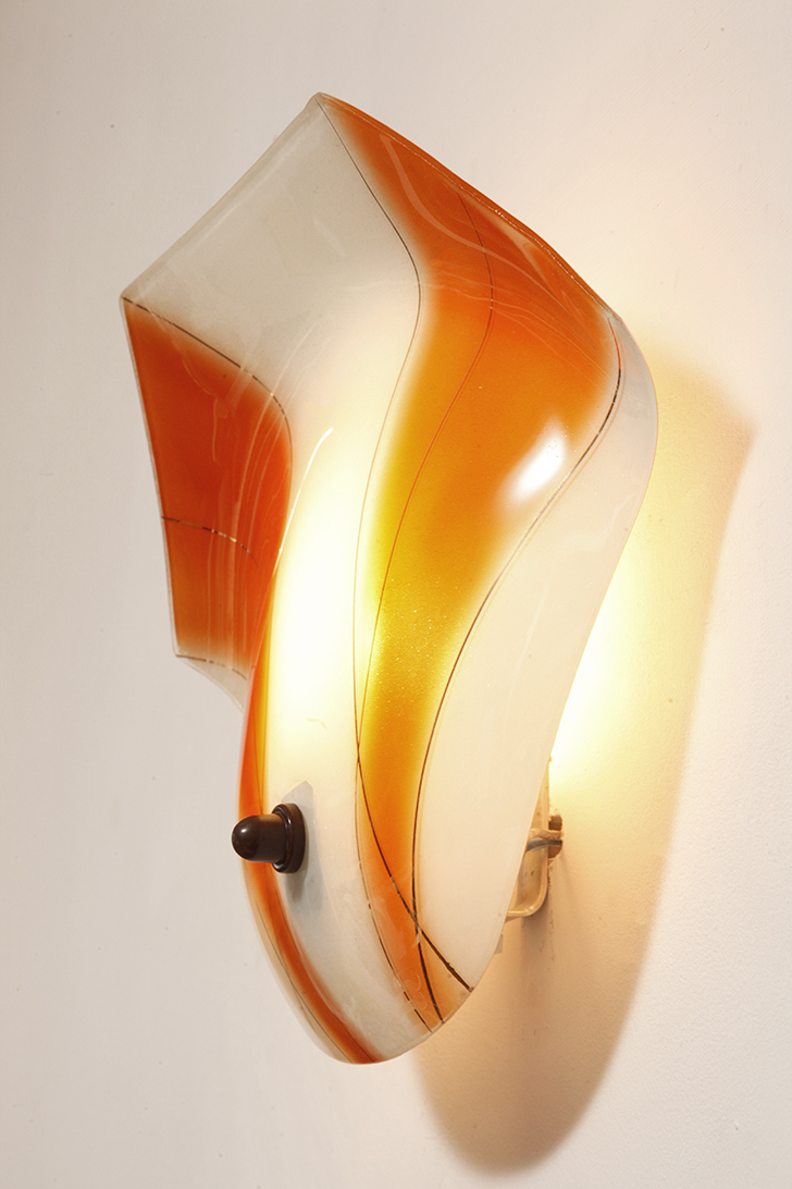 Efektowny mleczno pomarańczowy szklany polski kinkiet. Falujący niczym kwiatowy kielich klosz będący główną i właściwie jedyną oprócz mocowania do ściany częścią.