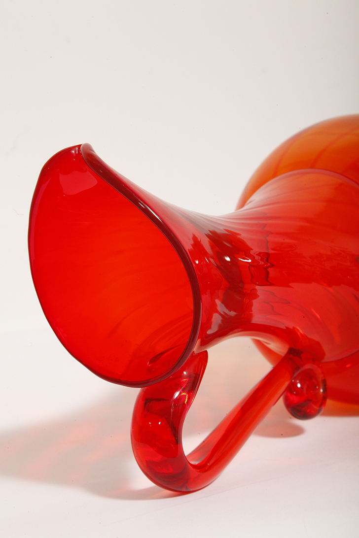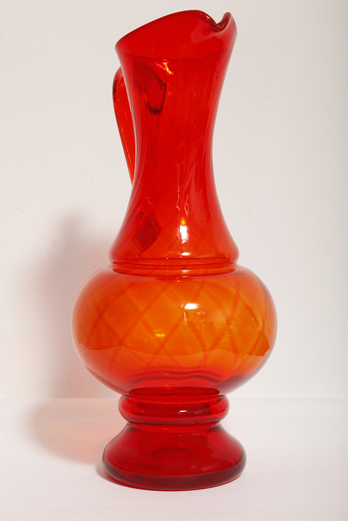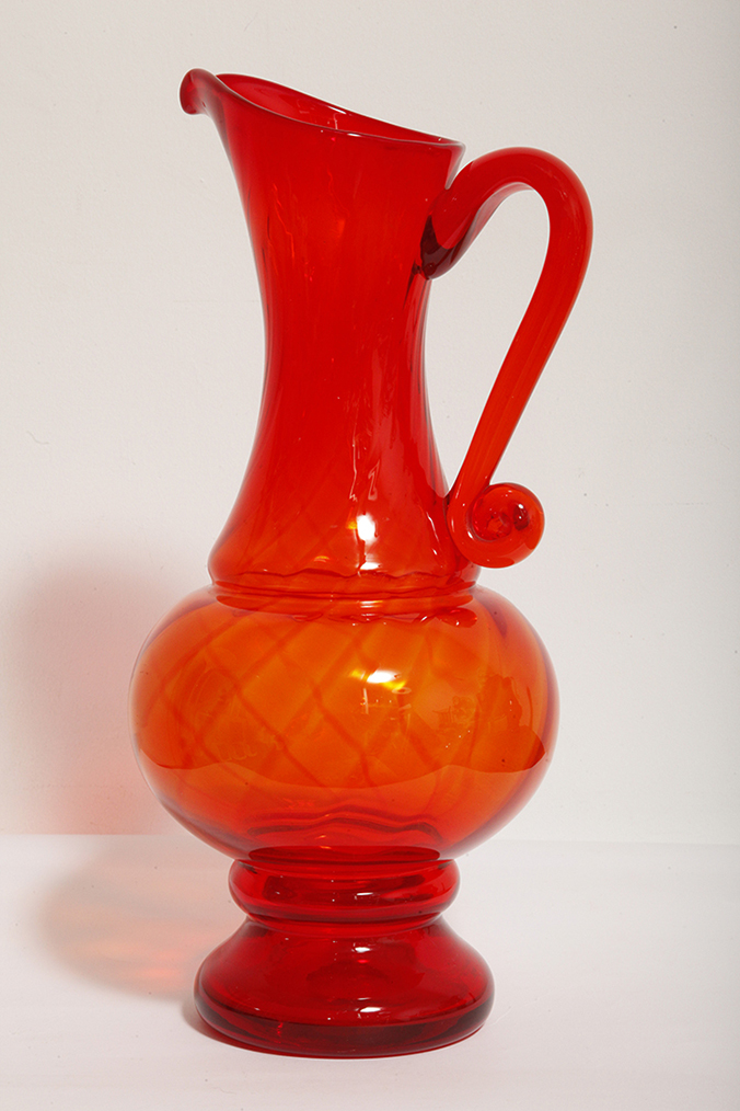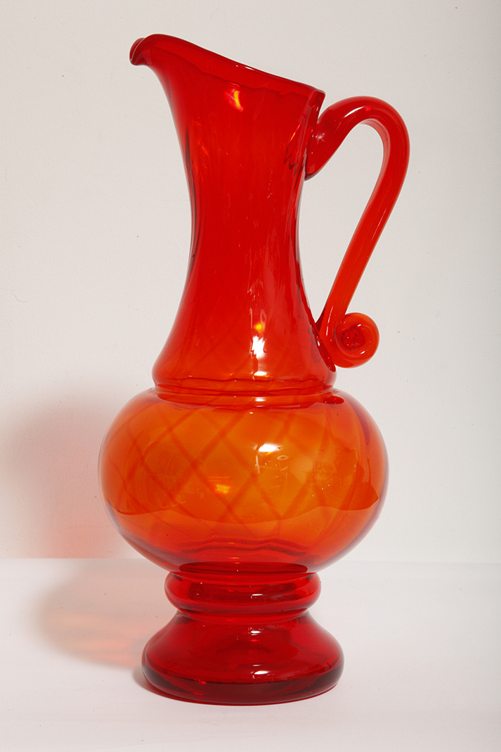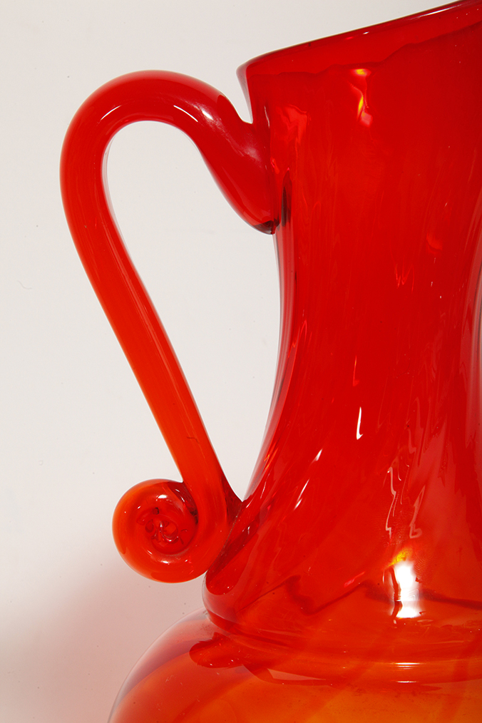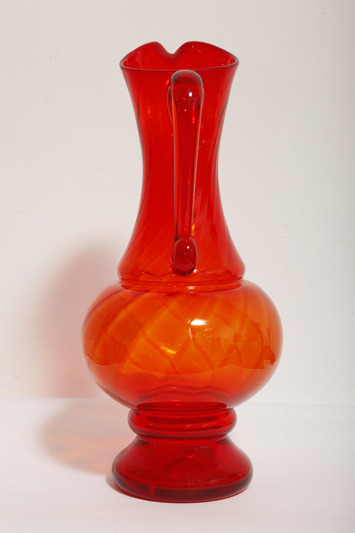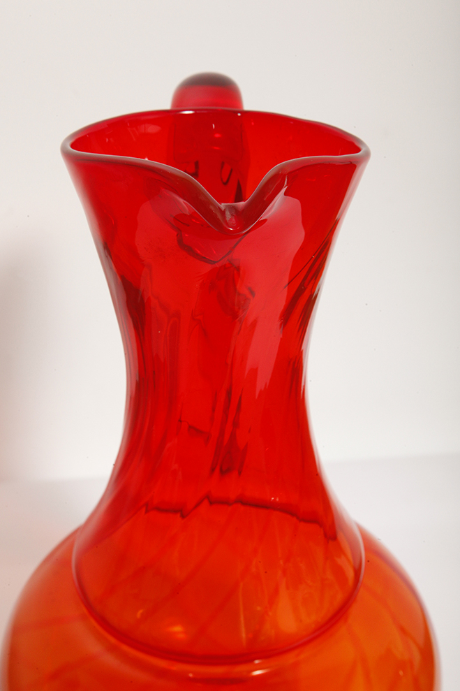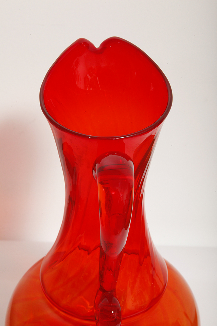 Duży szklany czerwony dzbanek „Verona”, projekt Ludwik Fiedorowicz, Huta Szkła Gospodarczego „Ząbkowice” w Dąbrowie Górniczej, Polska, wzór z 1982 roku
