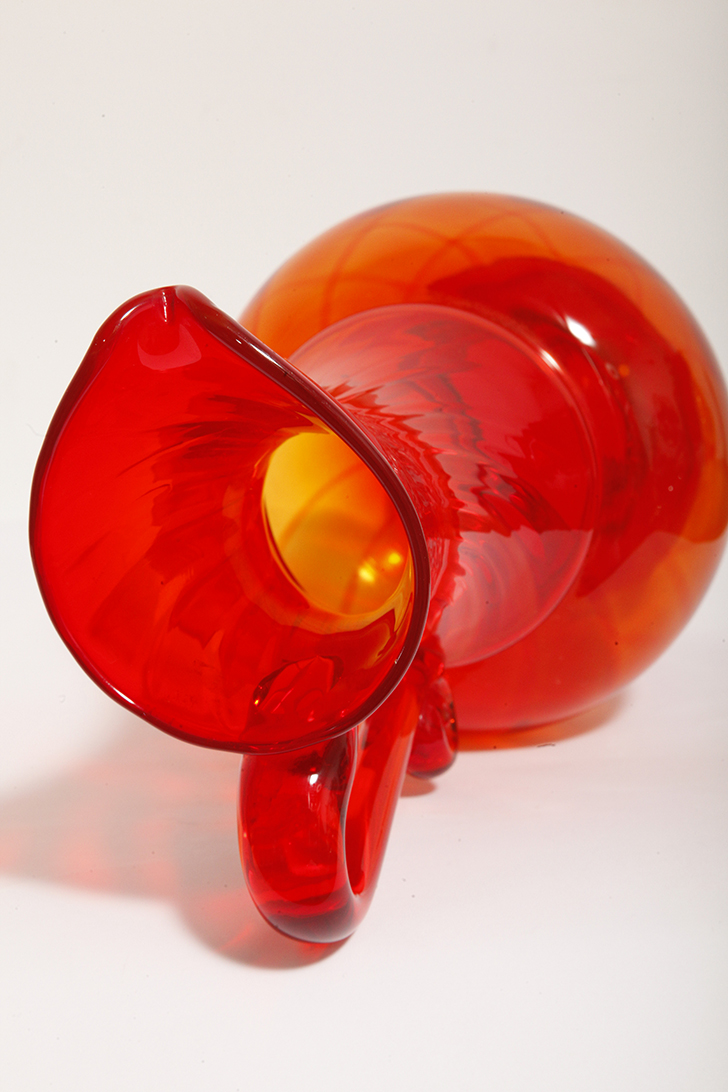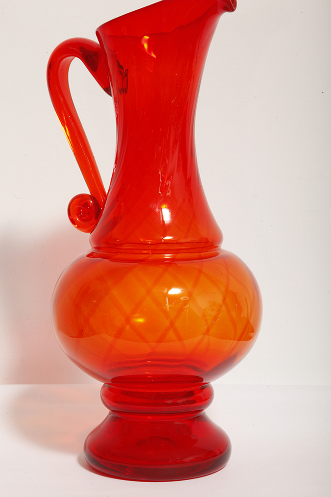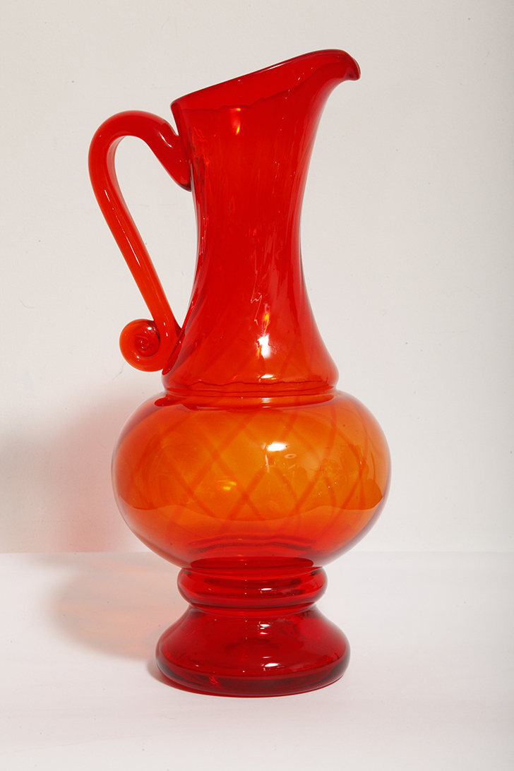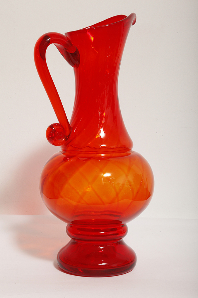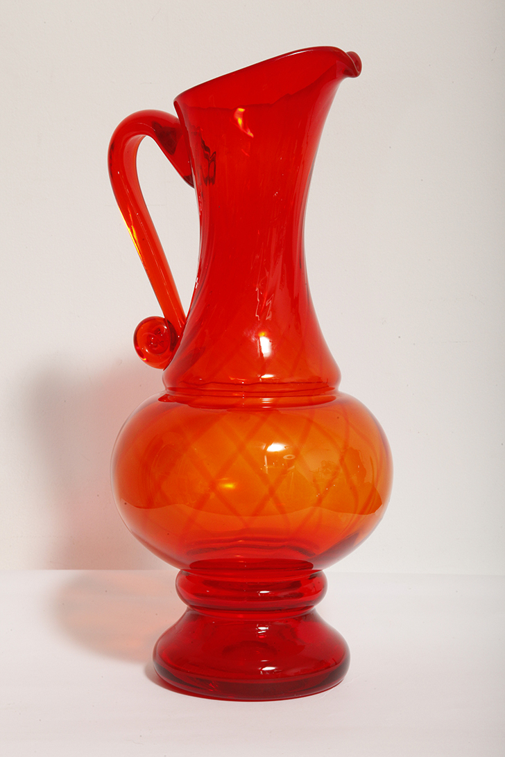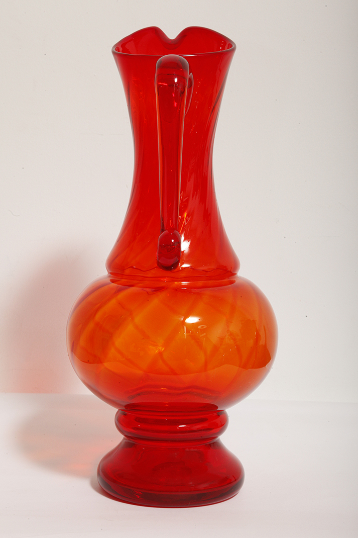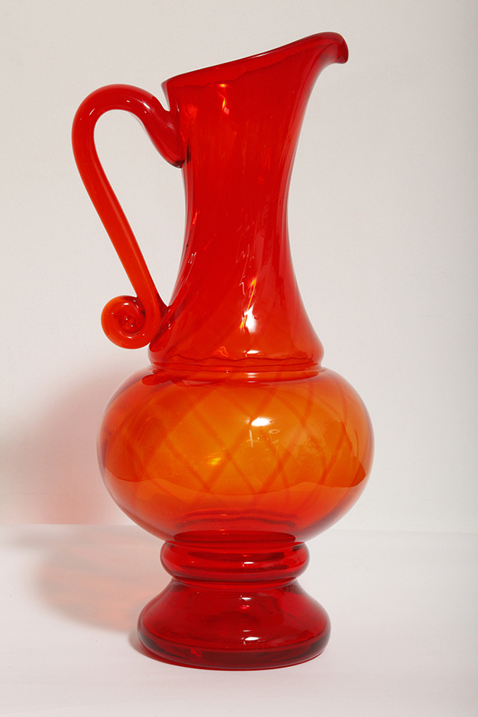 Duży szklany czerwony dzbanek „Verona”, projekt Ludwik Fiedorowicz, Huta Szkła Gospodarczego „Ząbkowice” w Dąbrowie Górniczej, Polska, wzór z 1982 roku