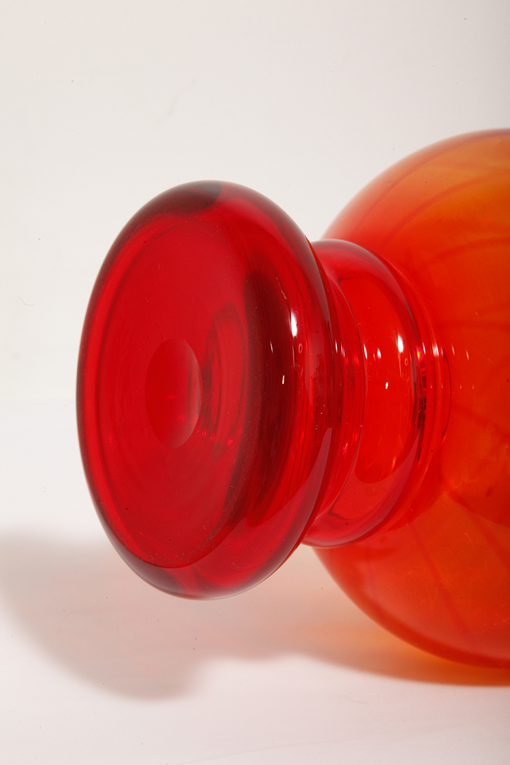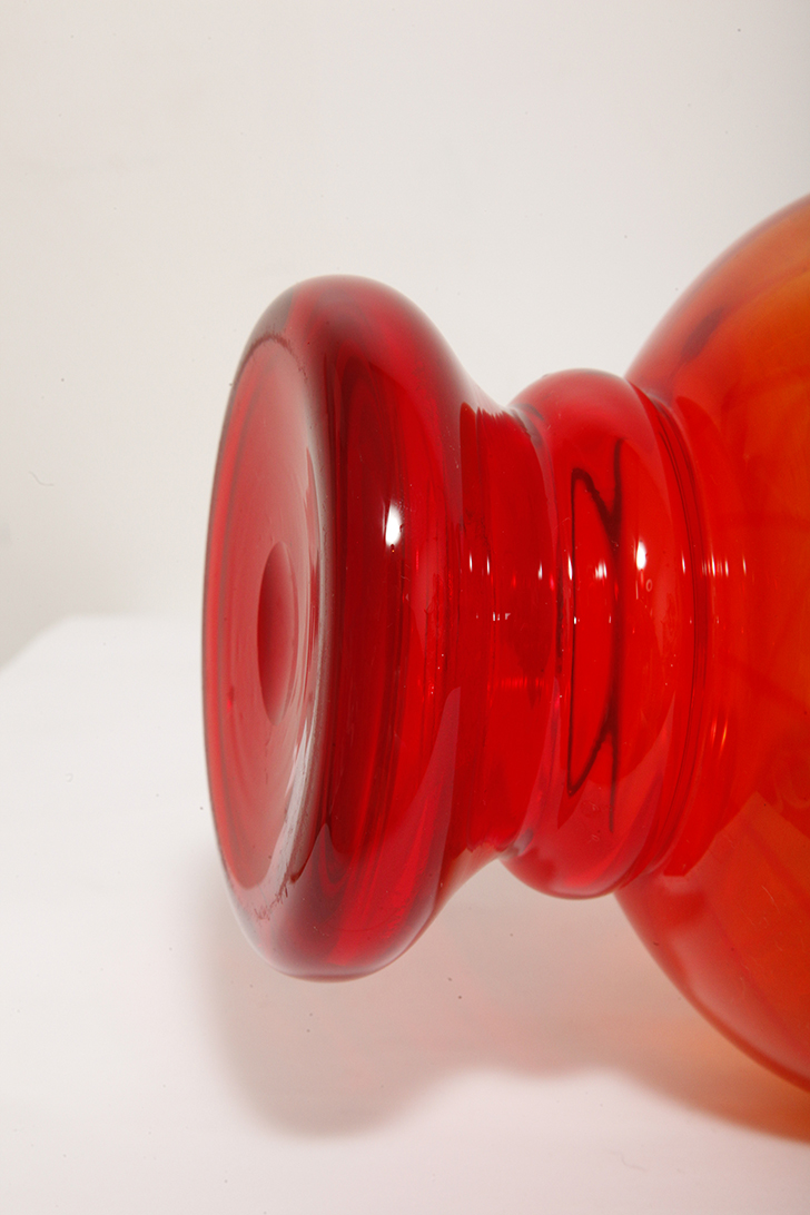 Struktura jest niejednolita, na całej powierzchni ma podłużne linie biegnące wokół wazonu. Spód wazonu wraz z podstawą delikatnie wpada w kolor pomarańczowy. Widać to dobrze pod światło.
