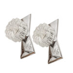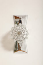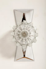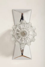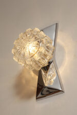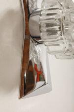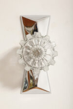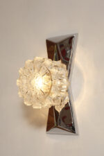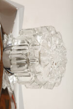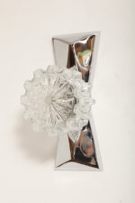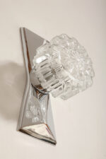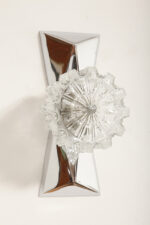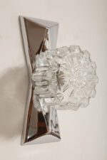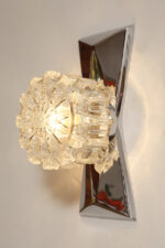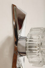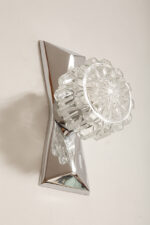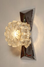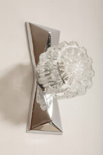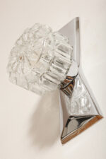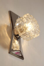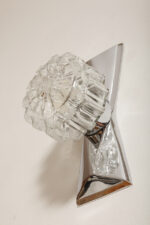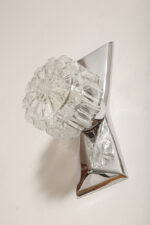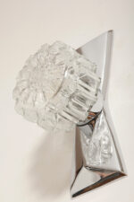 Dwa jednopunktowe kinkiety „Kokardka” ze szklanym fakturowym okrągłym kloszem i żeliwnymi masywnymi chromowanymi plecami, Richard Essig, Niemcy, lata 80.