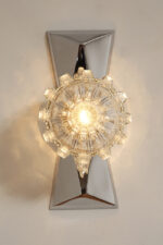 Mocno fakturowe kinkiety ze szkła prasowanego zostawiają na ścianie za sobą ładny wzorek gdy lamp się świeci. Zasilane są lampy te bezpośrednio ze ściany, a do ich odpalenia każda potrzebuj jednej żarówki z małym gwintem, czyli E14.