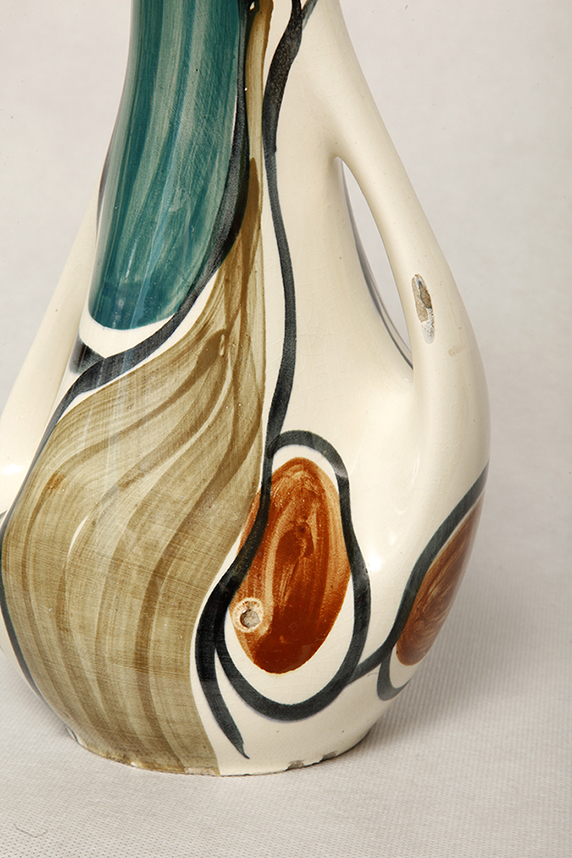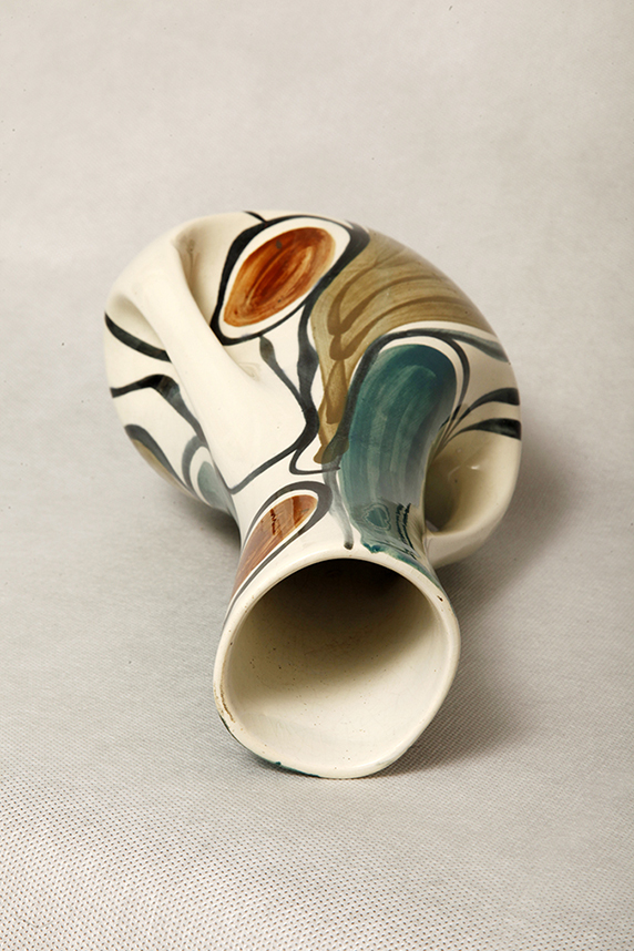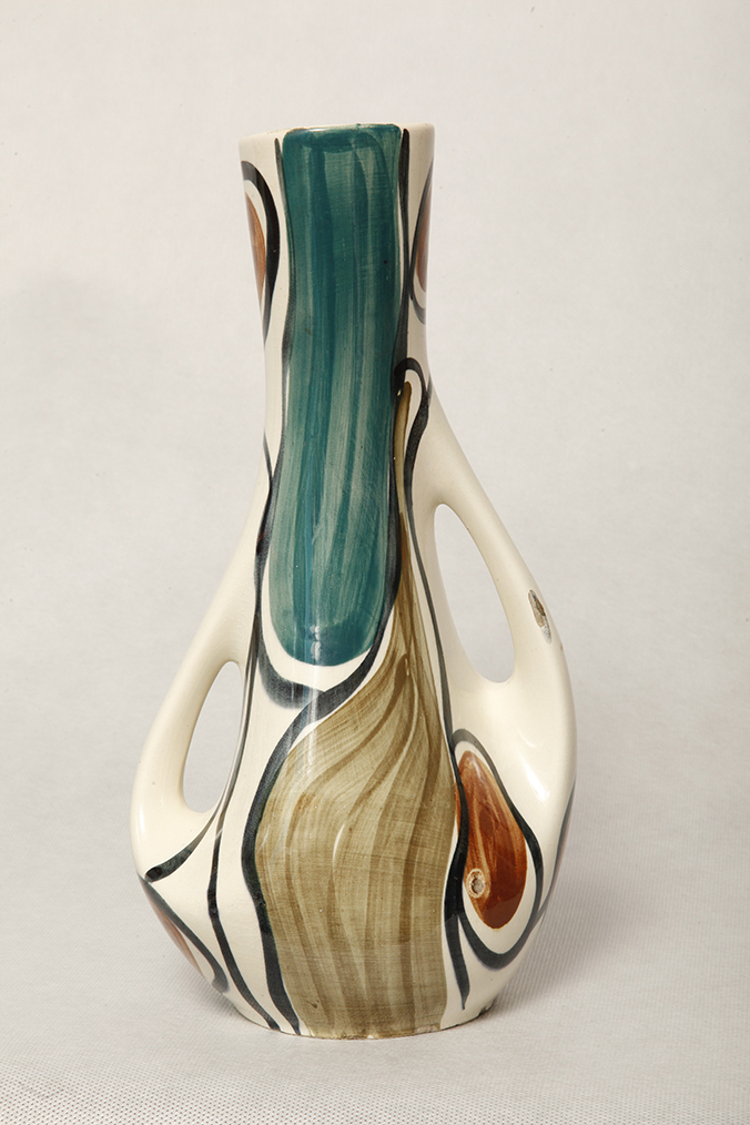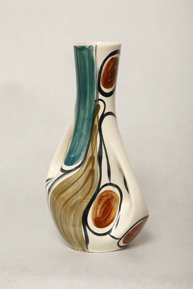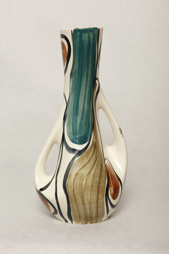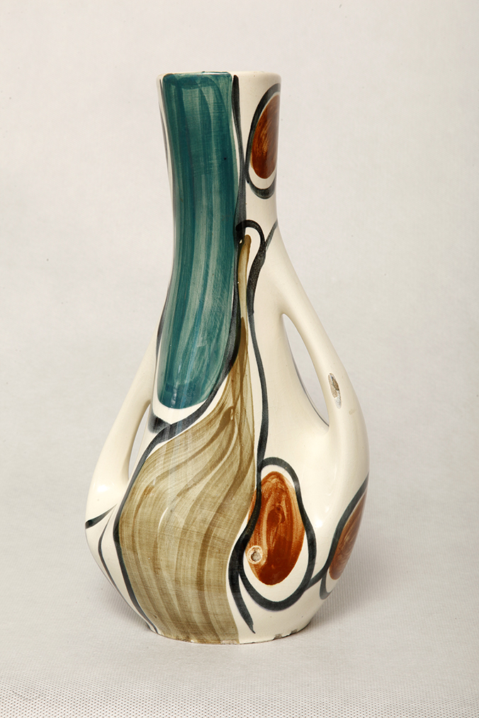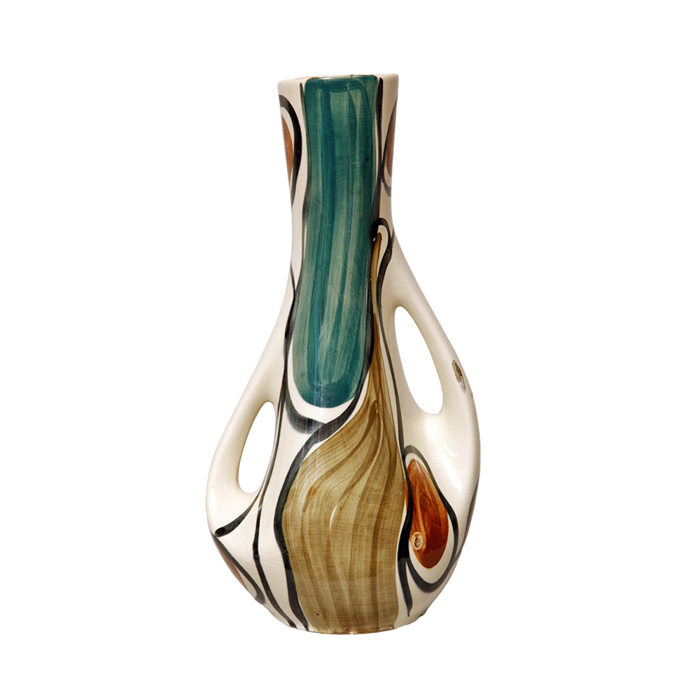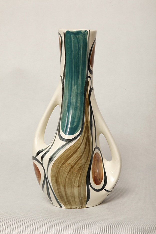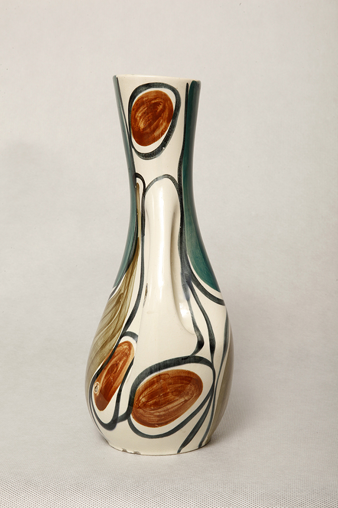 Fajansowy wazon ręcznie malowany podszkliwnie w pomarańczowe, zielone (morskie) i brązowe wzory, projekt Jan Sowiński, Włocławskie Zakłady Ceramiki Stołowej we Włocławku, wzór 284 z 1958 roku