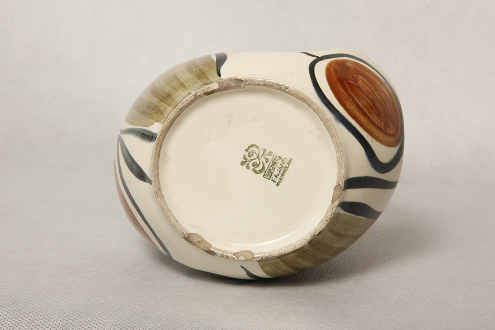 Przedmiot zachowany w bardzo dobrym stanie, bez ubytków, ukruszeń. Odbarwień wzoru brak. Klakerura typowa dla fajansu, czyli siatka spękanego szkliwienia.