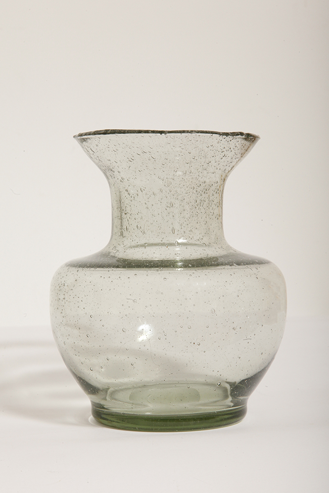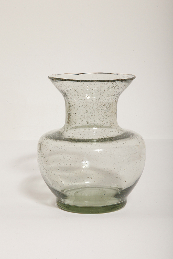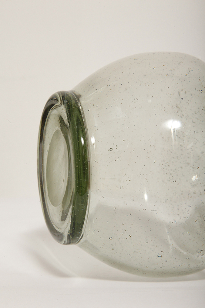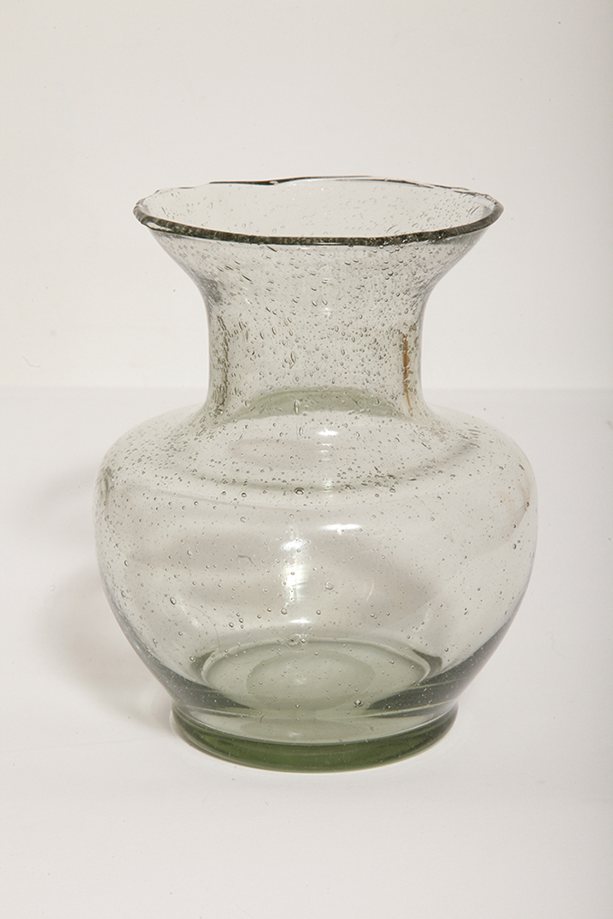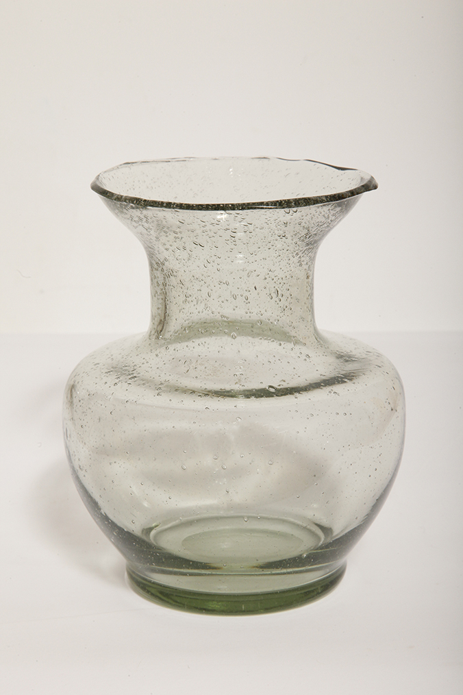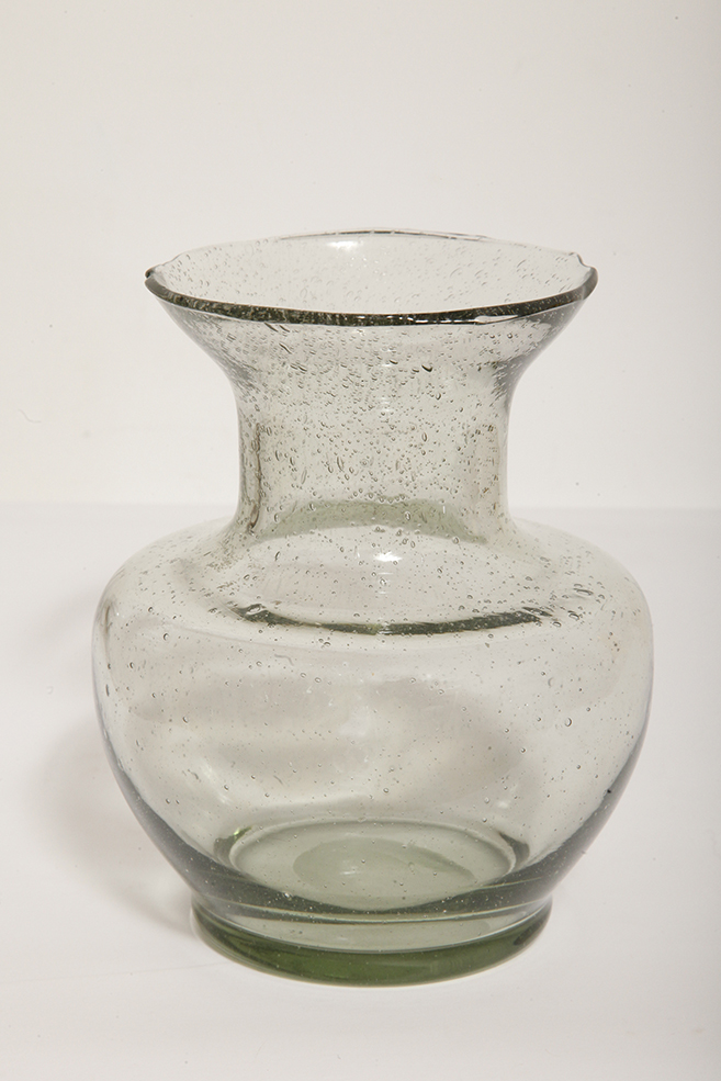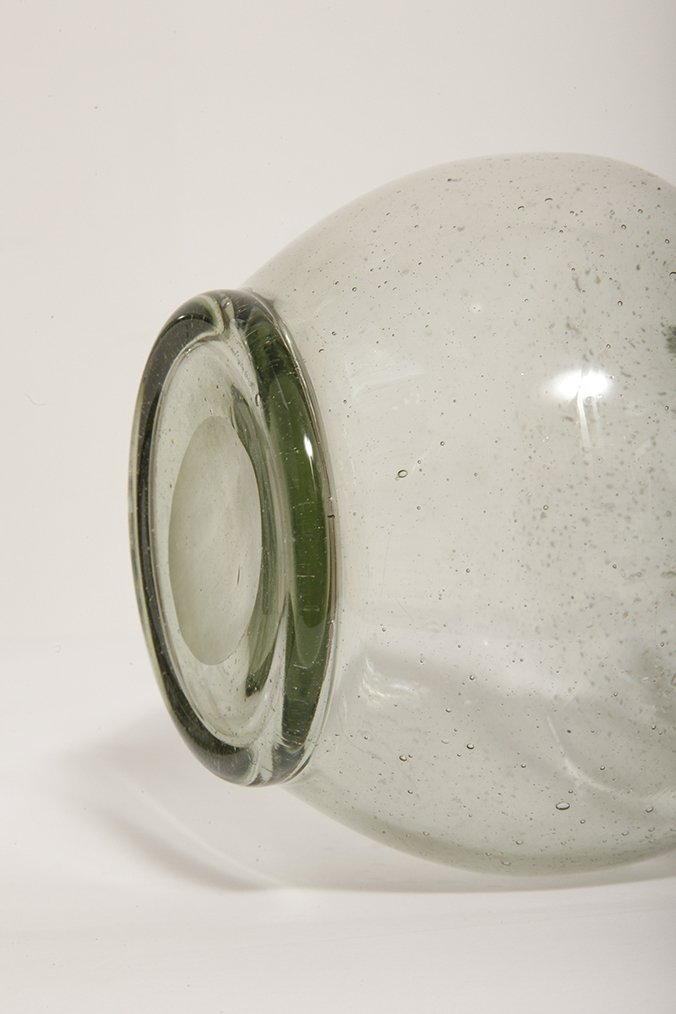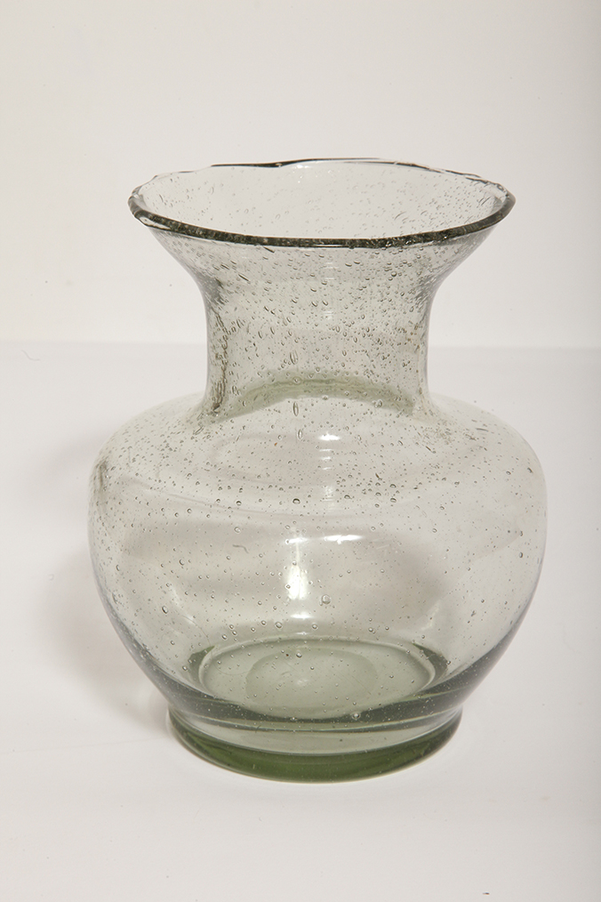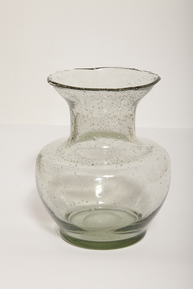 Strona główna » Sklep » Szkło » Jasno szary niski pękaty mocno napowietrzony półprzezroczysty szklany wazon z falbanką na rancie wlotu, Polska, lata 70.
