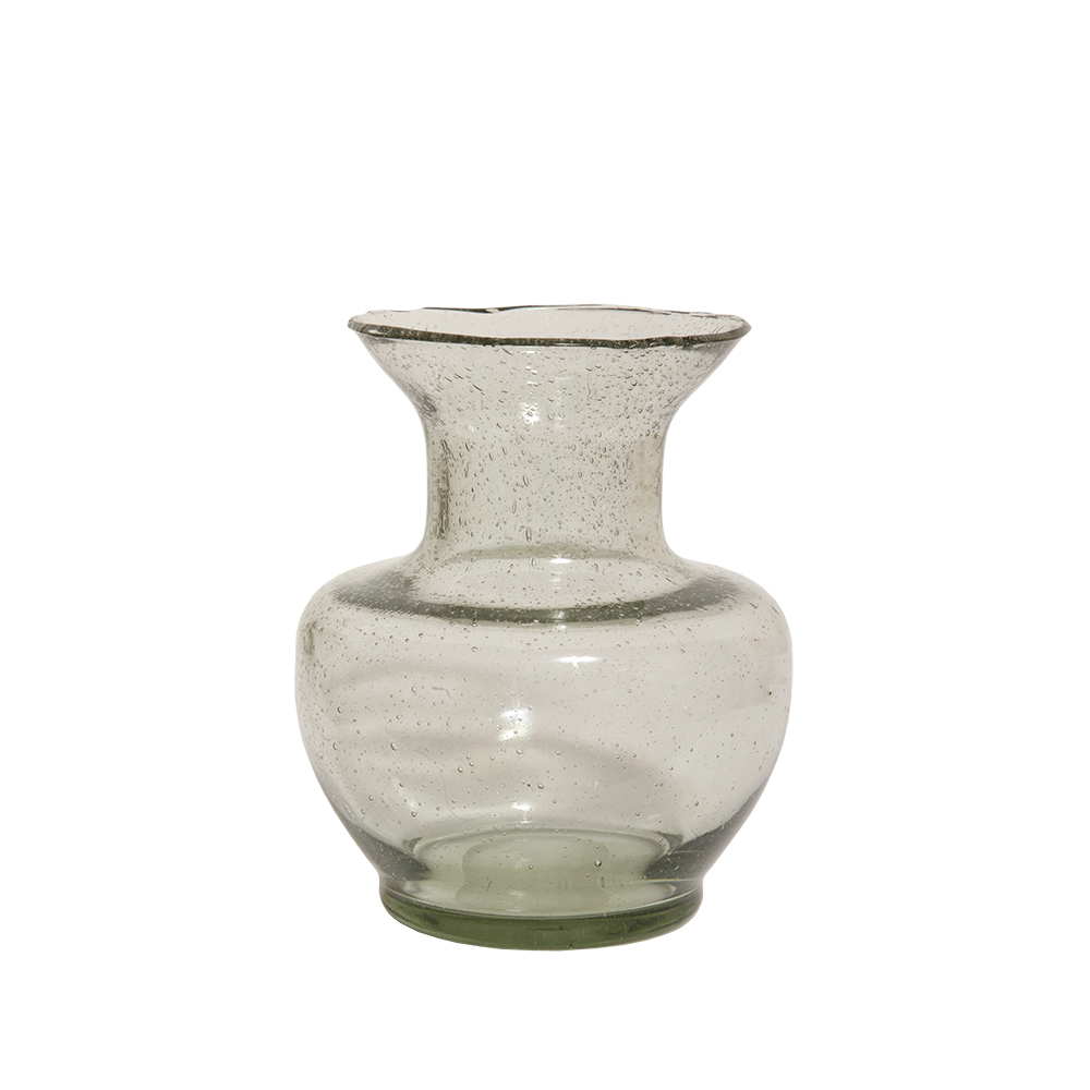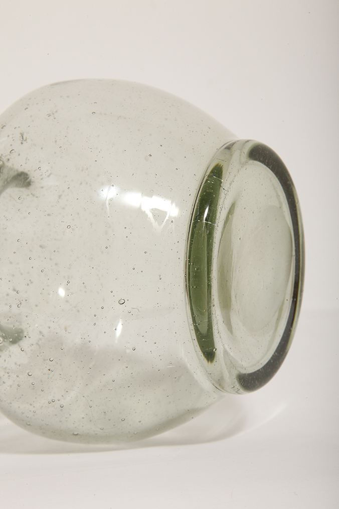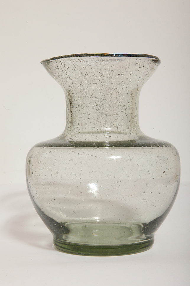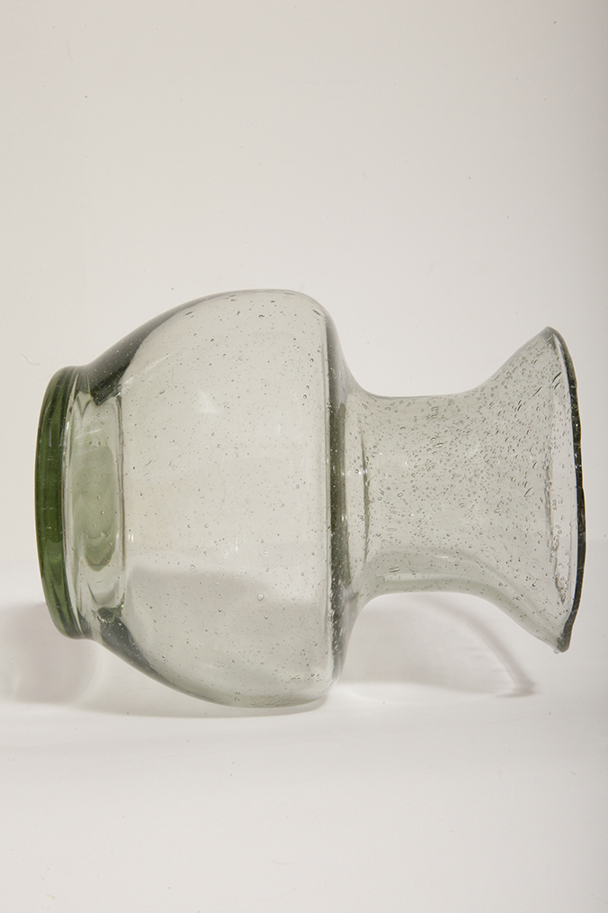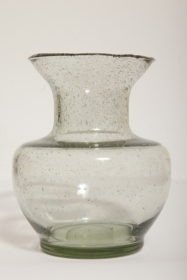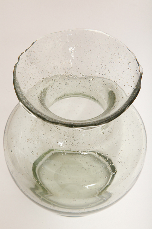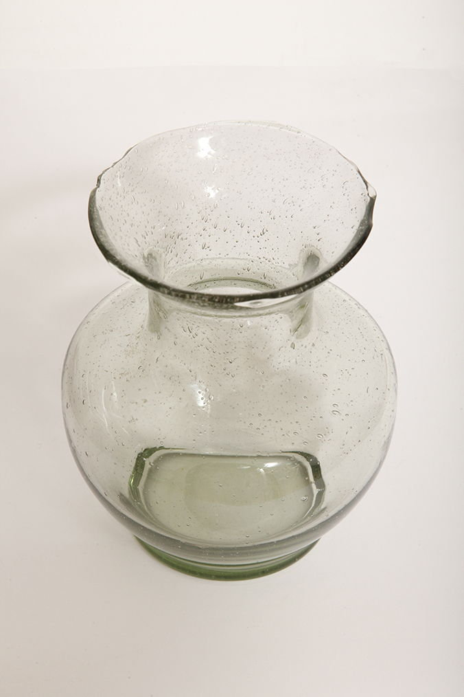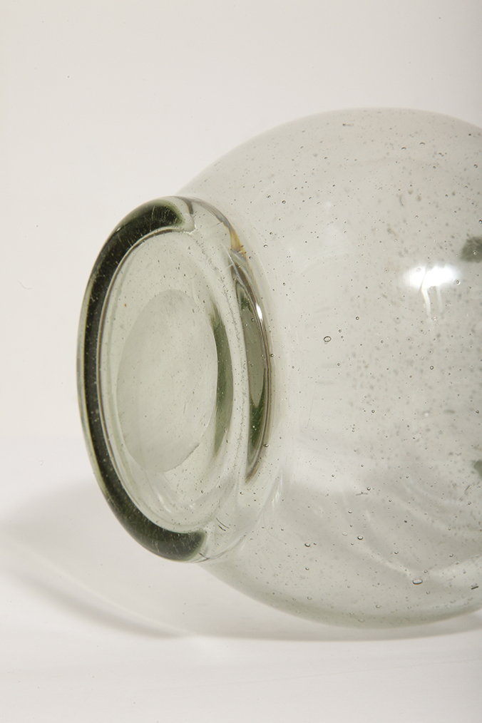 Strona główna » Sklep » Szkło » Jasno szary niski pękaty mocno napowietrzony półprzezroczysty szklany wazon z falbanką na rancie wlotu, Polska, lata 70.