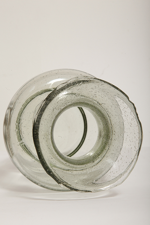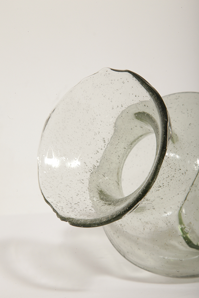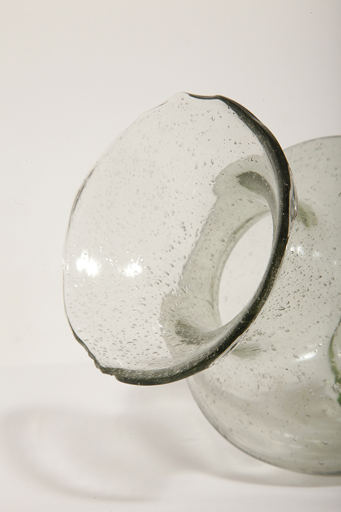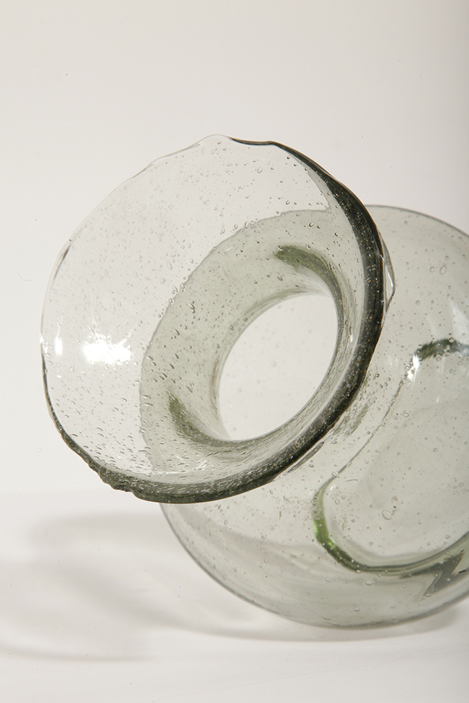 Nieduży, aczkolwiek dość rozłożysty jasno szary, półprzezroczysty mocno napowietrzony (pęcherzyki powietrza widoczne w strukturze skał) wazon z falbanką wokół rantu szerokiego wlewu.