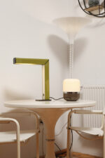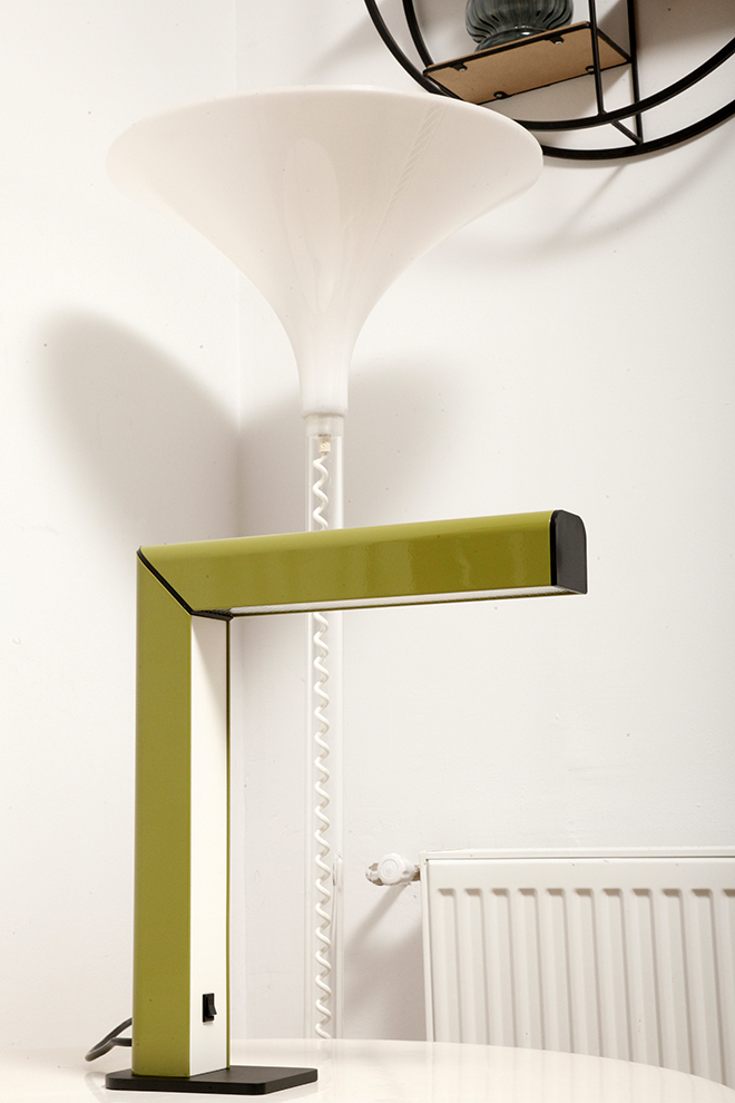 Jasno zielona metalowa postmodernistyczna lampa biurkowa w kształcie odwróconego „L” z fakturowym dyfuzorem z jasnego tworzywa , Holandia, lata 80.