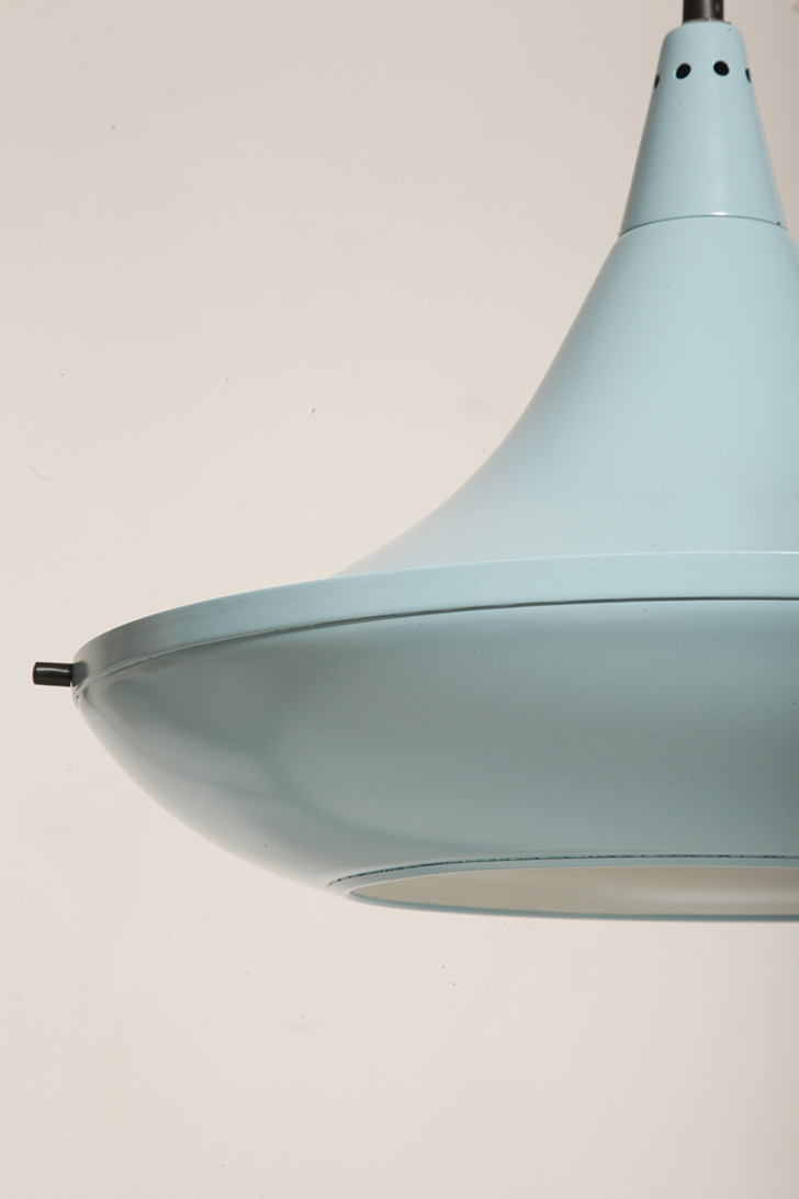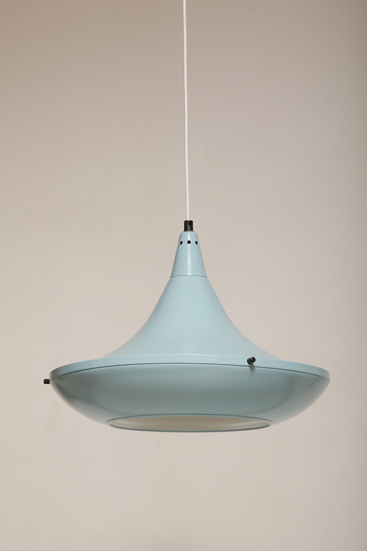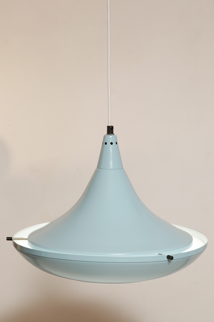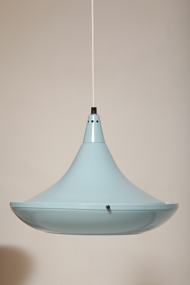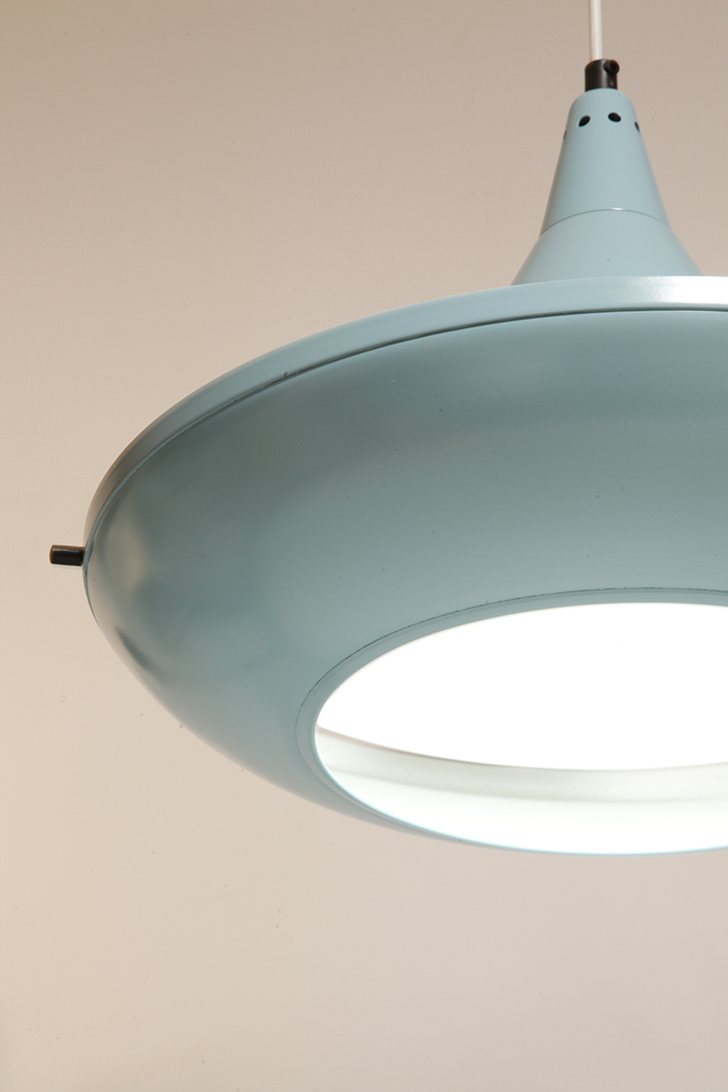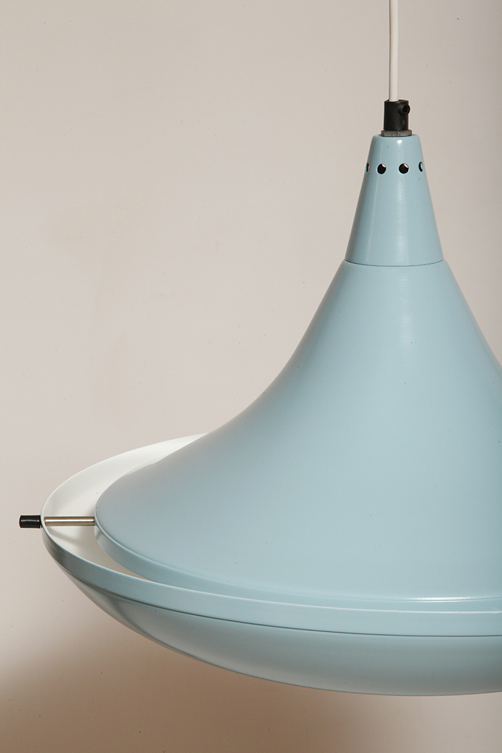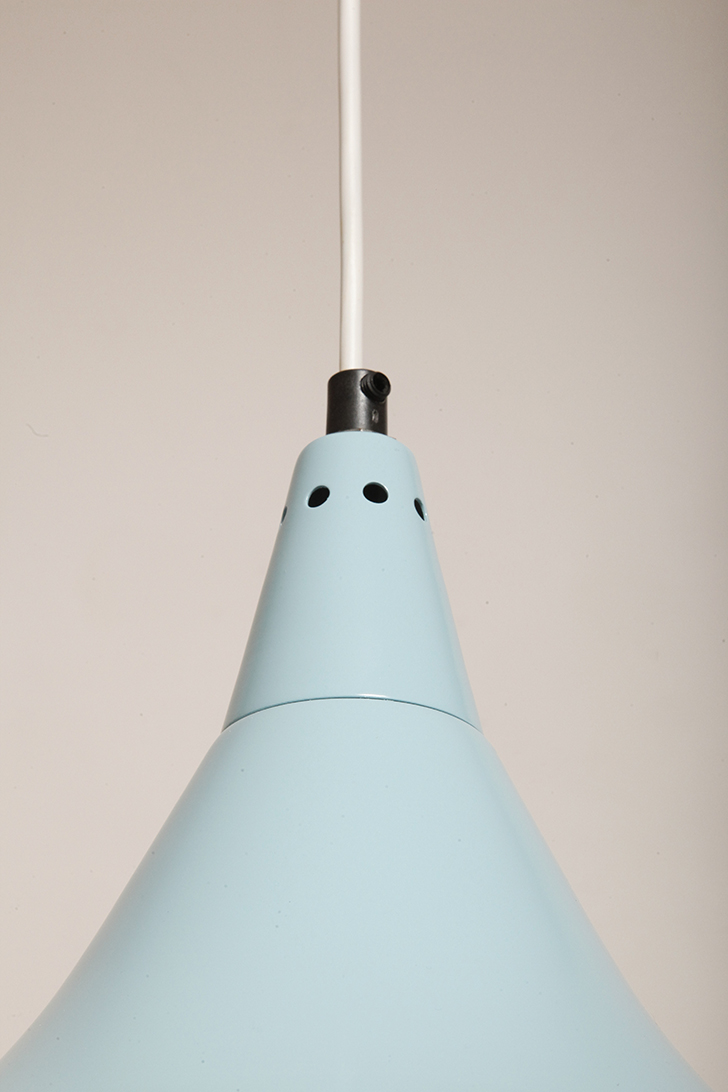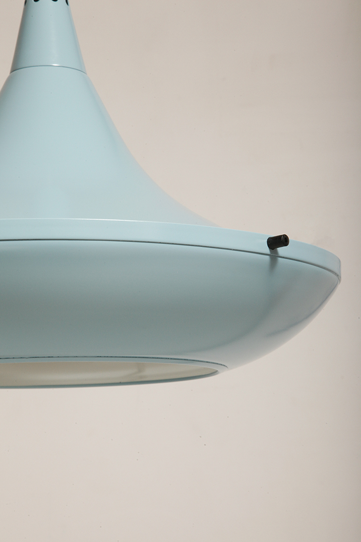 Pierwotne była w brudnej bieli. My polakierowaliśmy ją na nowo w ładnym niebieskim kolorze w odcieniu wykorzystywanym u innych producentów lamp w PRL-u.