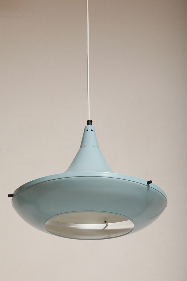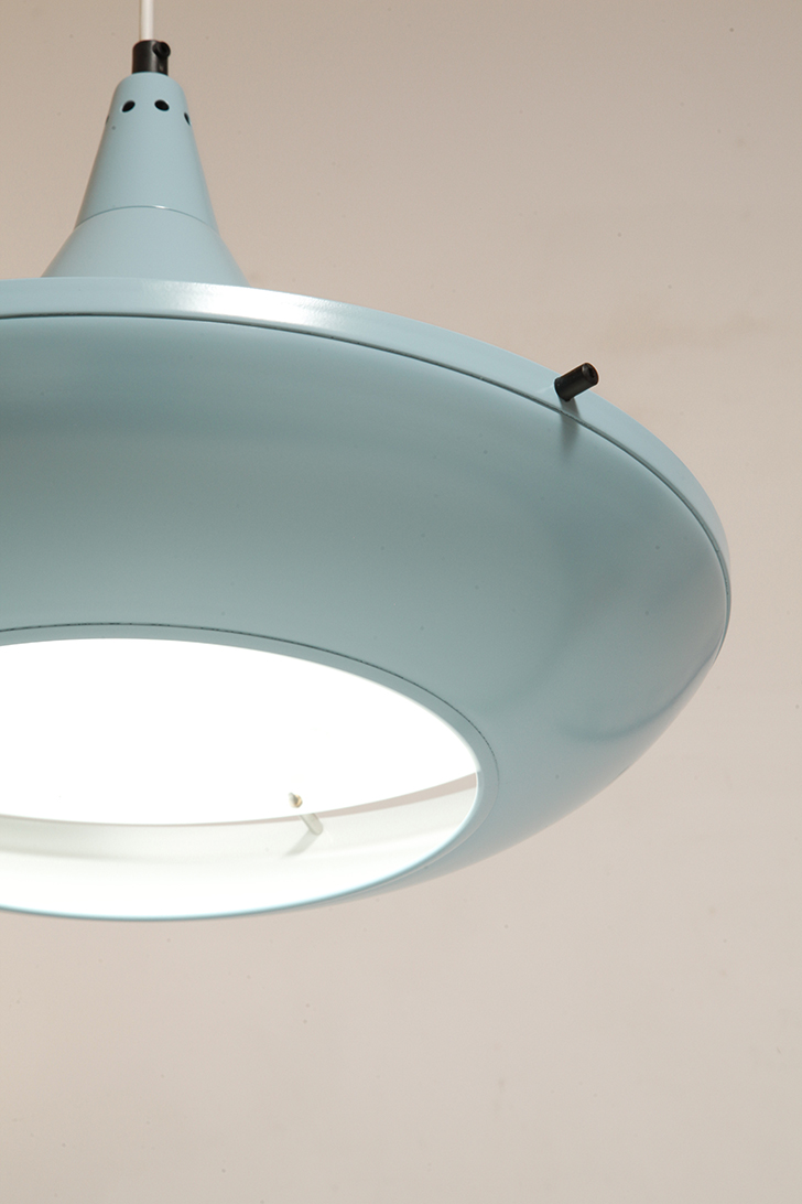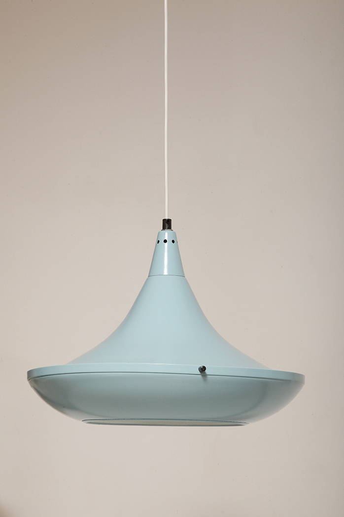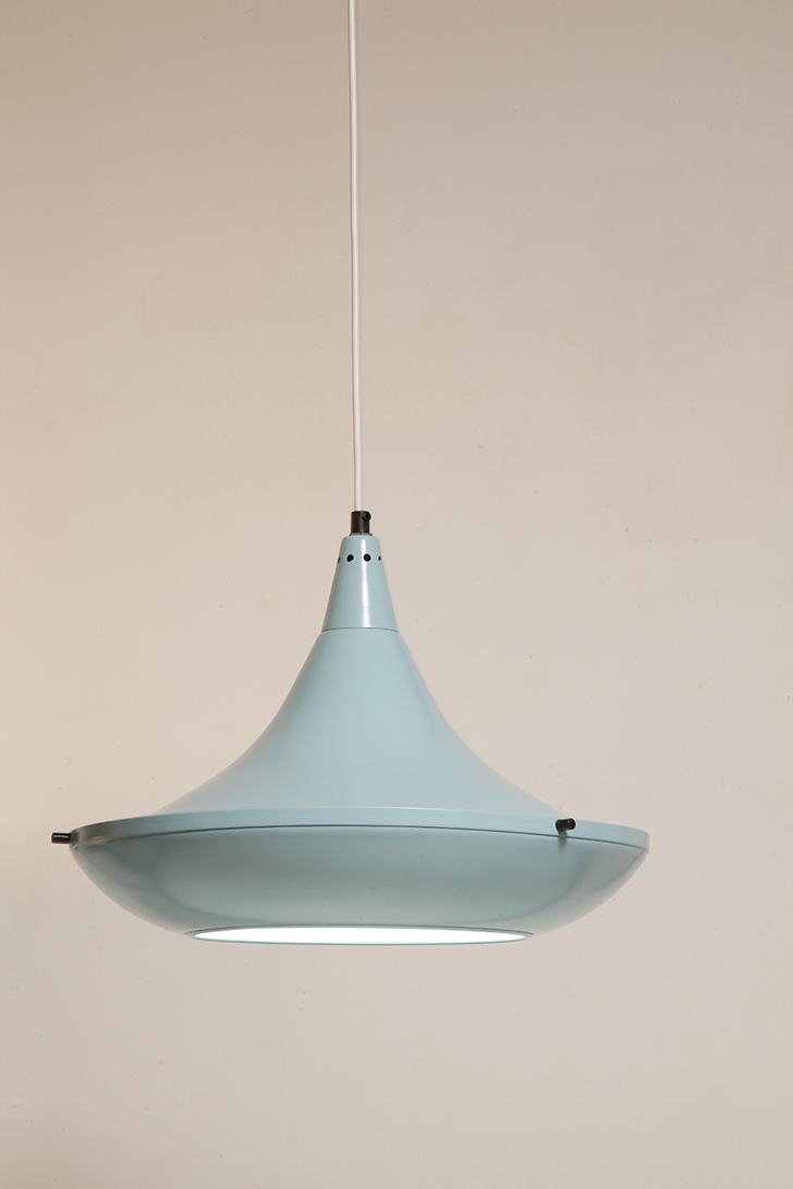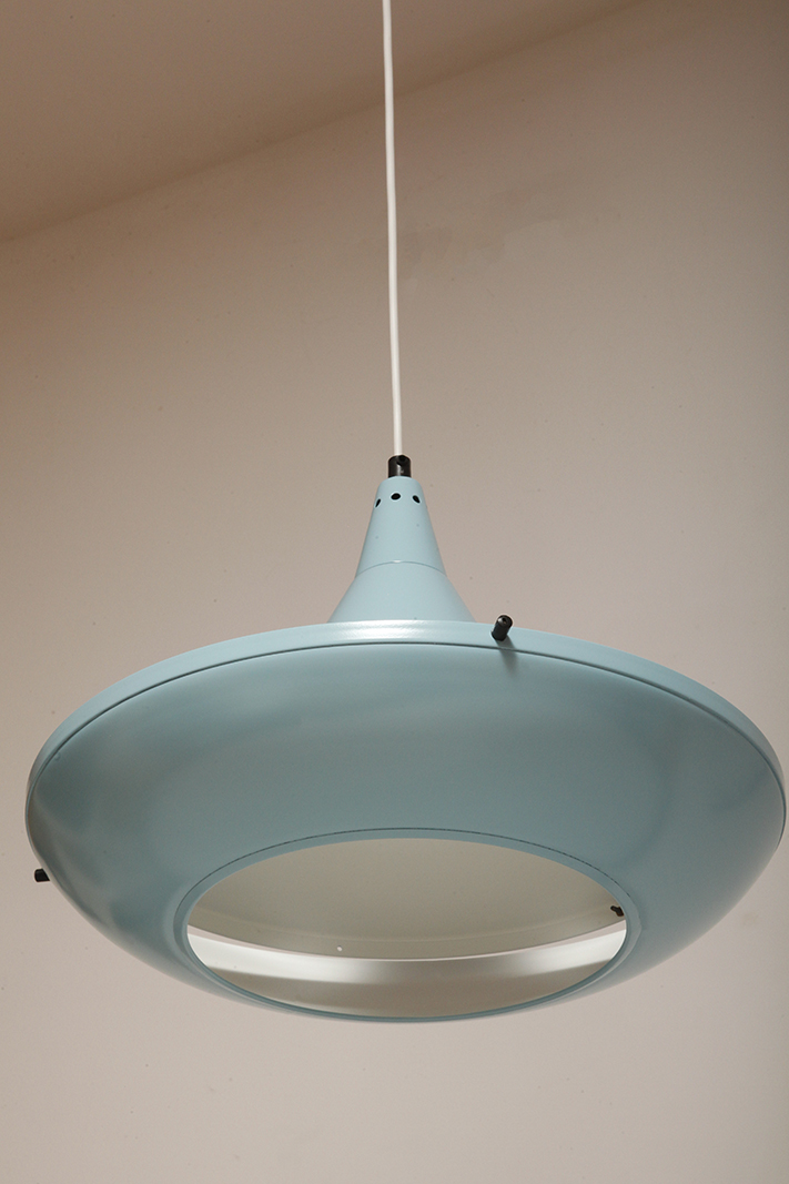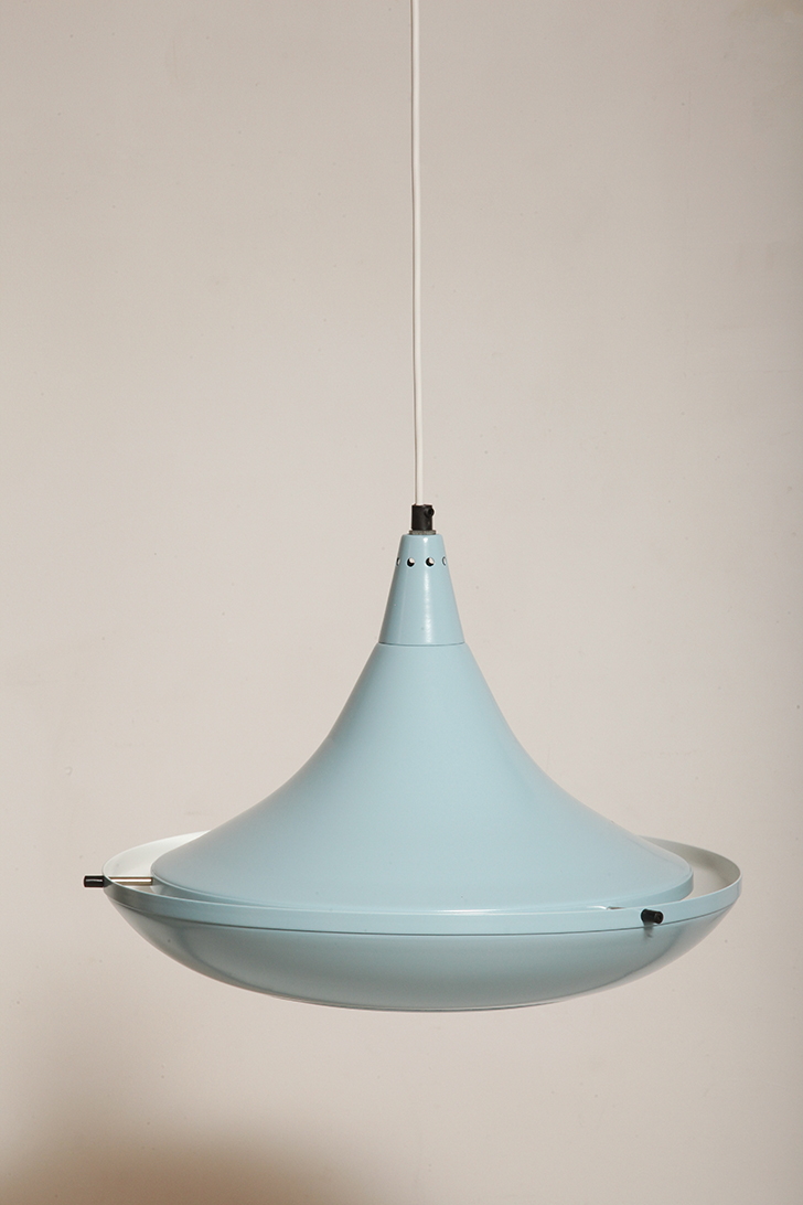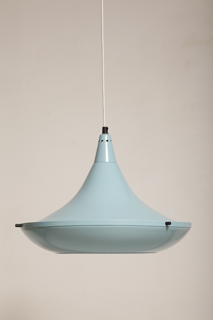 Pierwotne była w brudnej bieli. My polakierowaliśmy ją na nowo w ładnym niebieskim kolorze w odcieniu wykorzystywanym u innych producentów lamp w PRL-u.