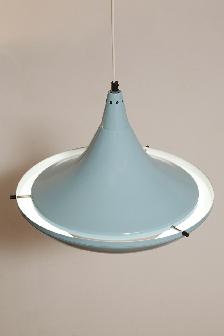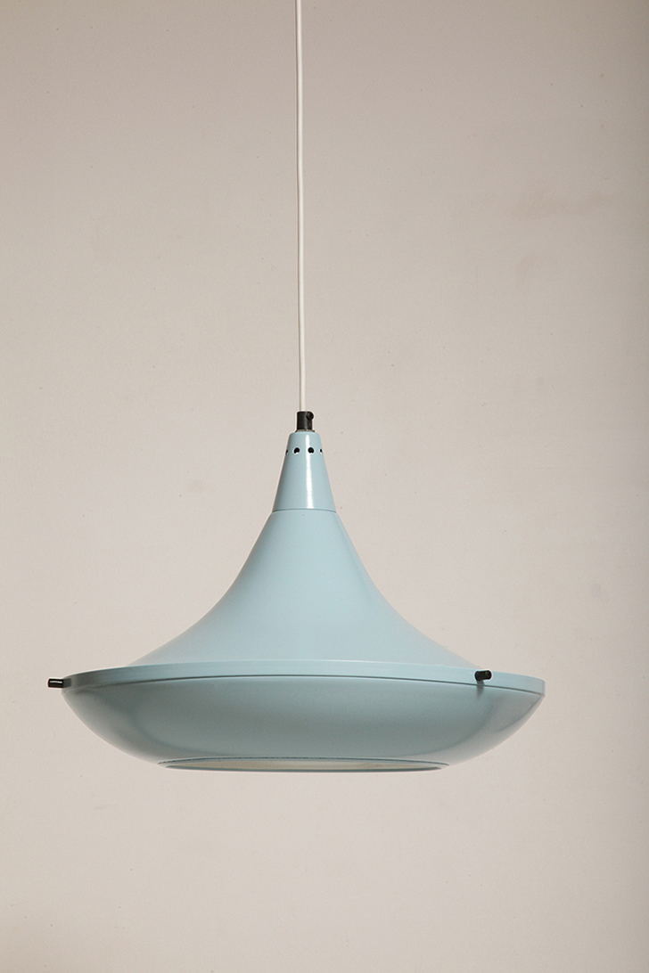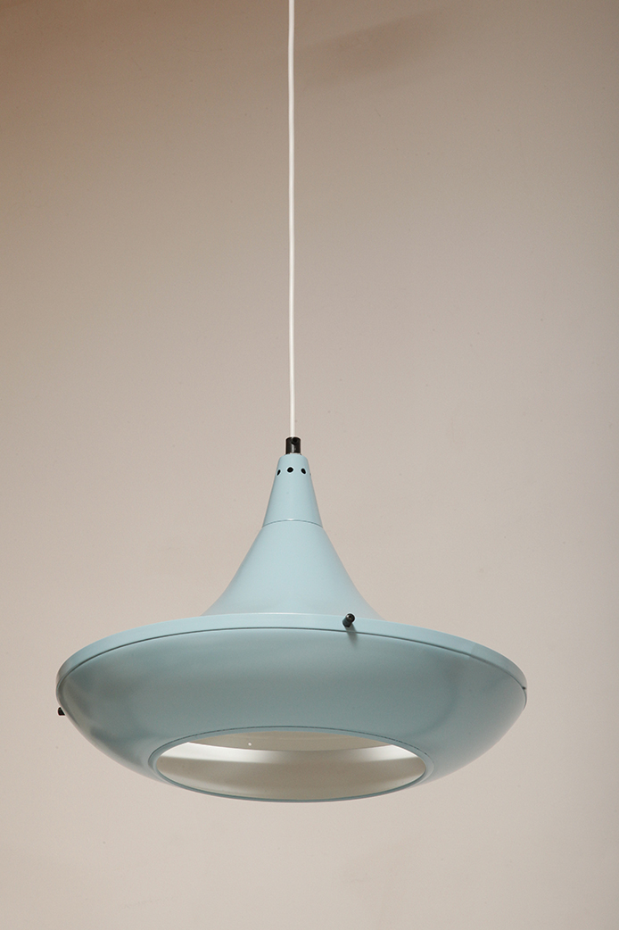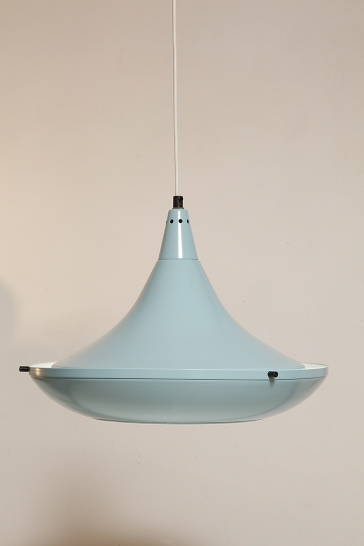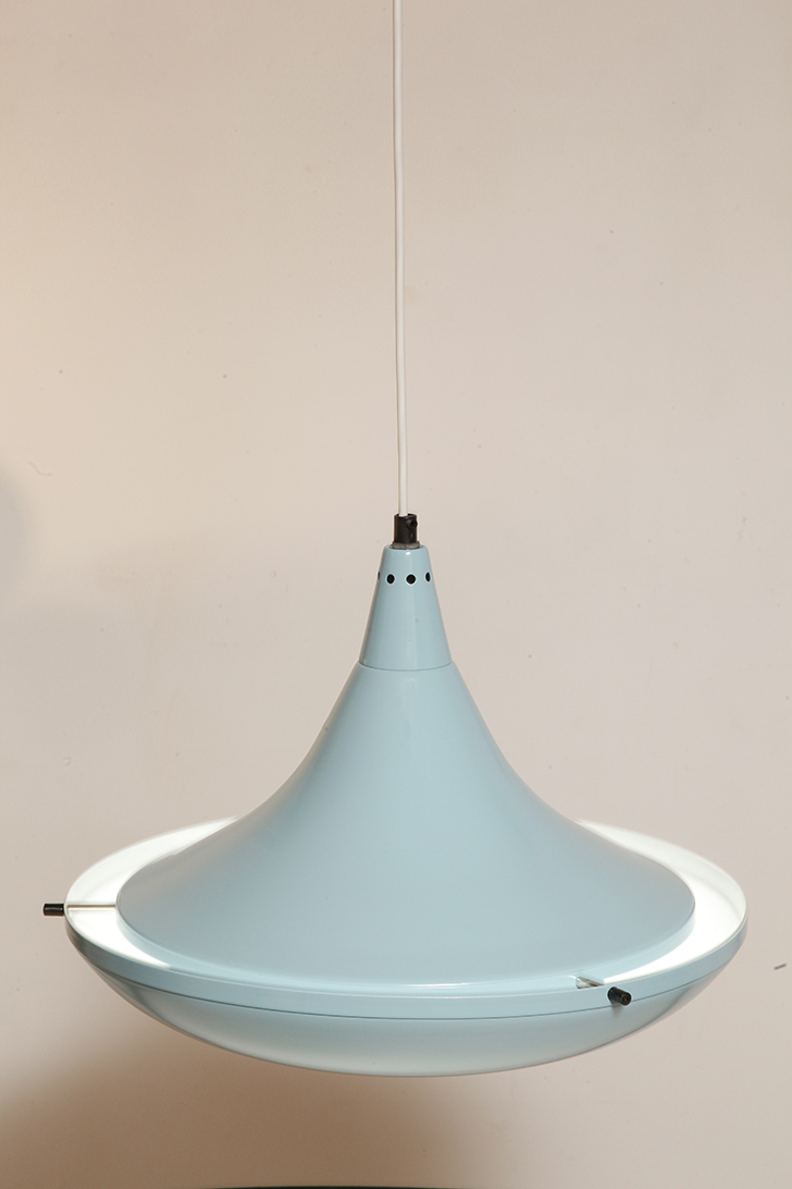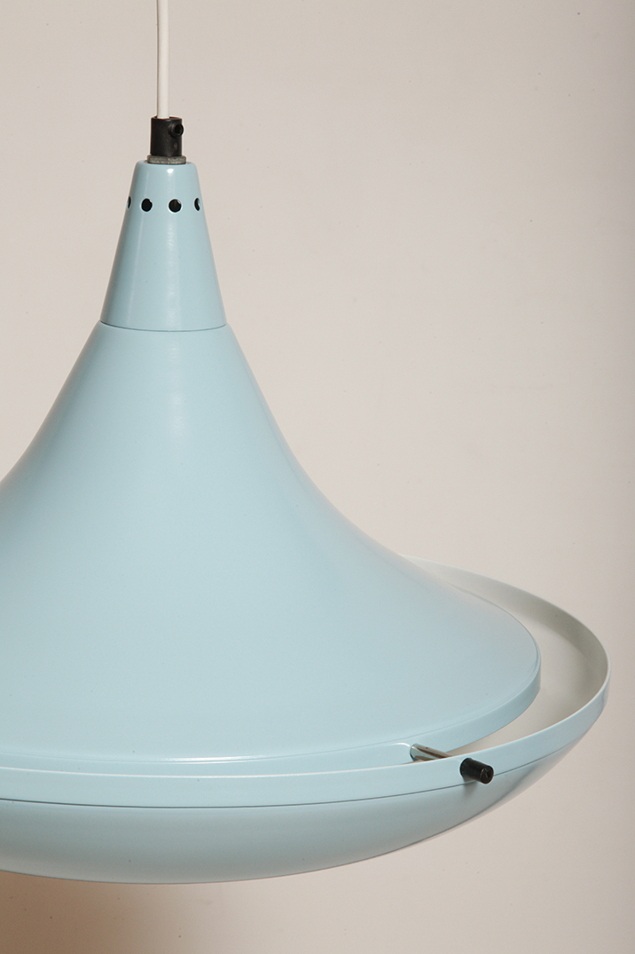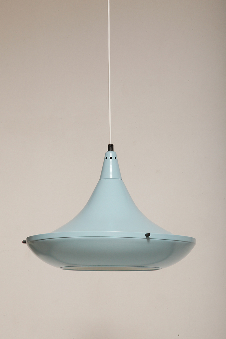 Pierwotne była w brudnej bieli. My polakierowaliśmy ją na nowo w ładnym niebieskim kolorze w odcieniu wykorzystywanym u innych producentów lamp w PRL-u.