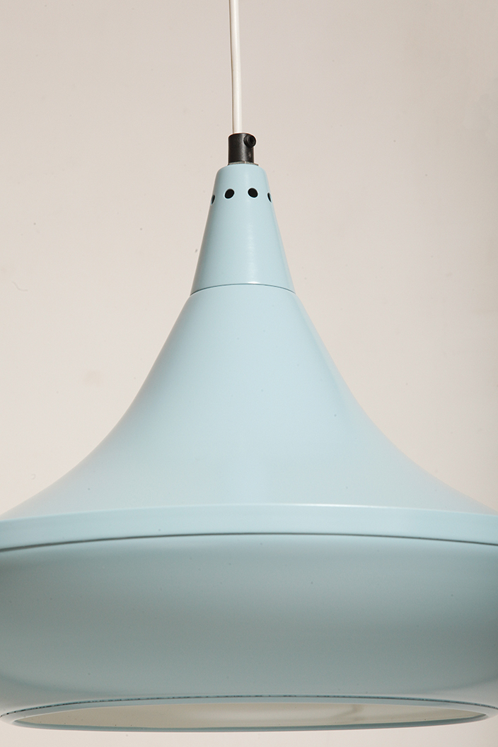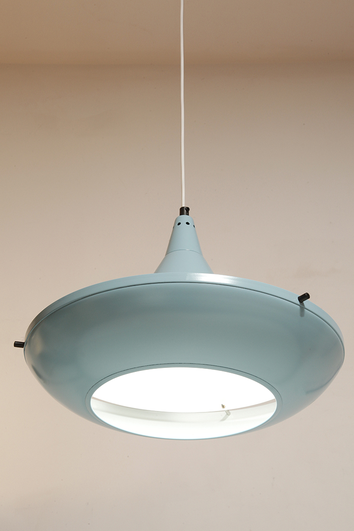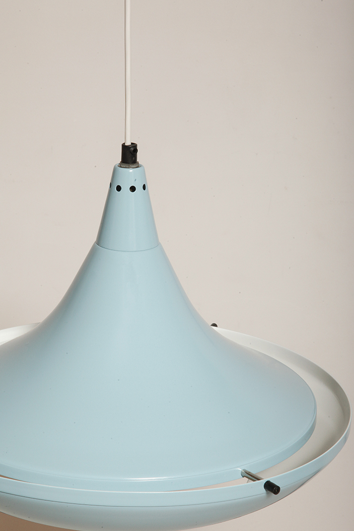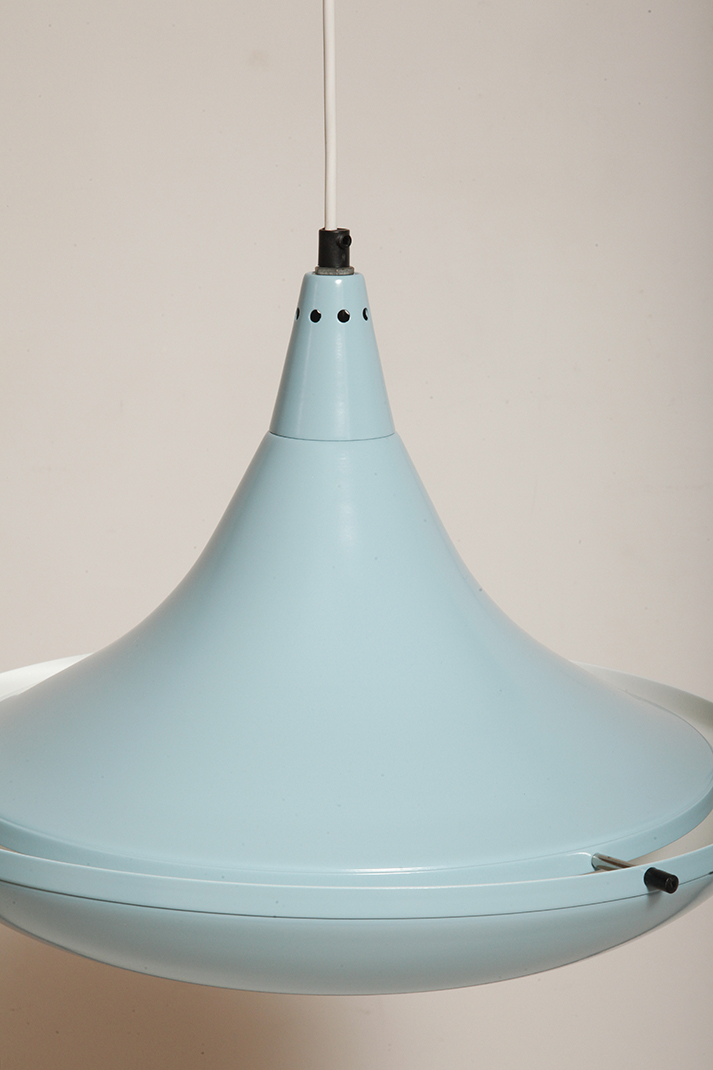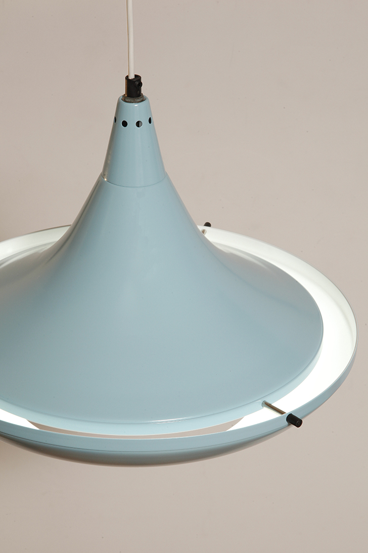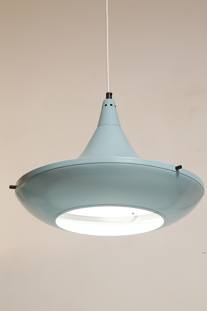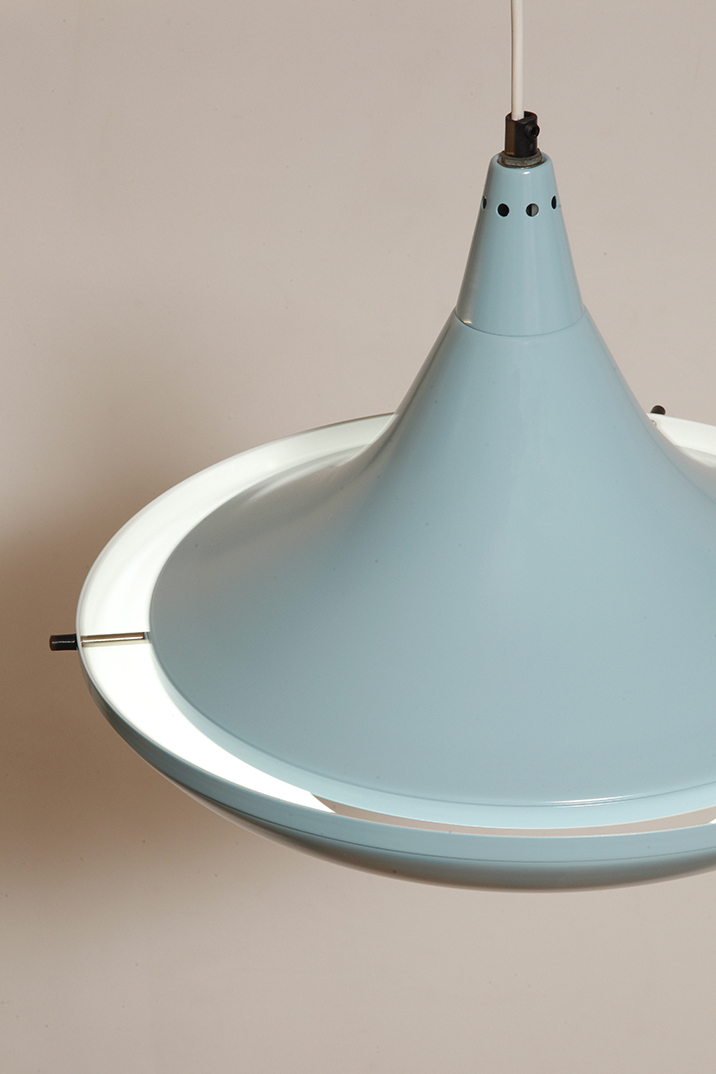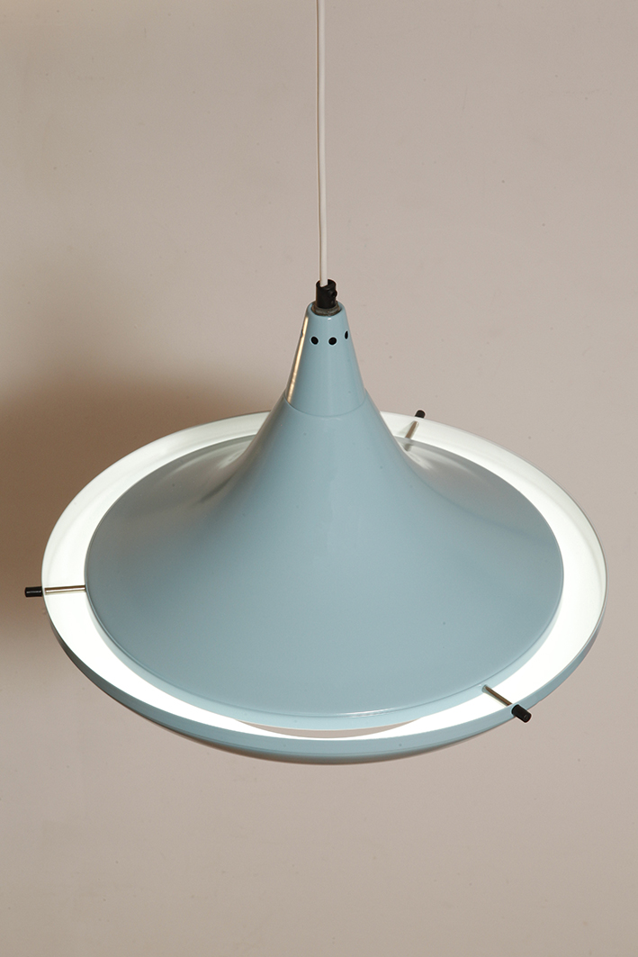 Pierwotne była w brudnej bieli. My polakierowaliśmy ją na nowo w ładnym niebieskim kolorze w odcieniu wykorzystywanym u innych producentów lamp w PRL-u.