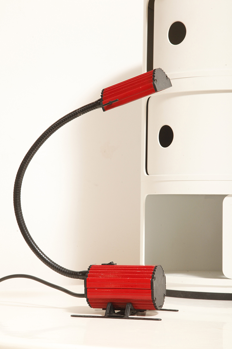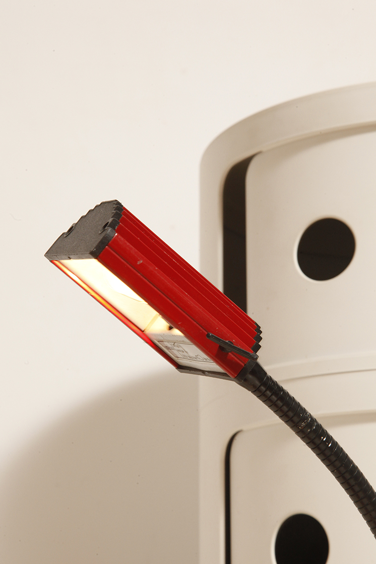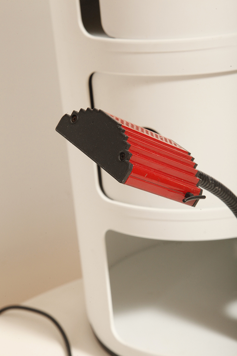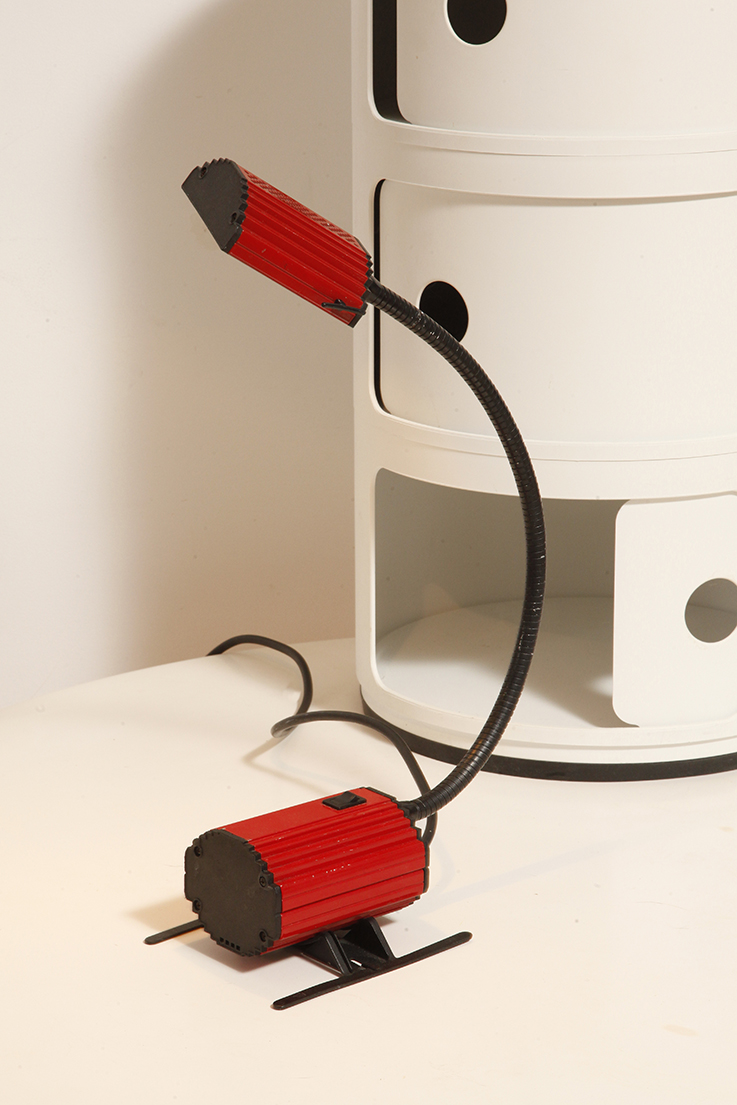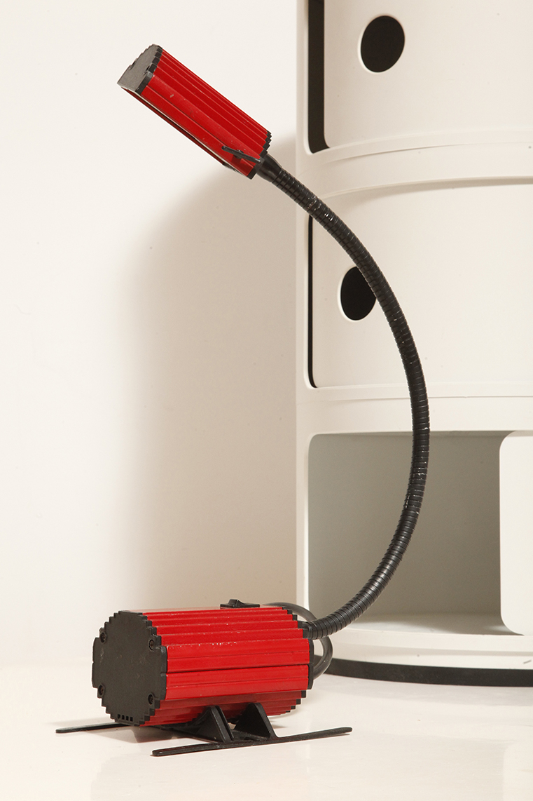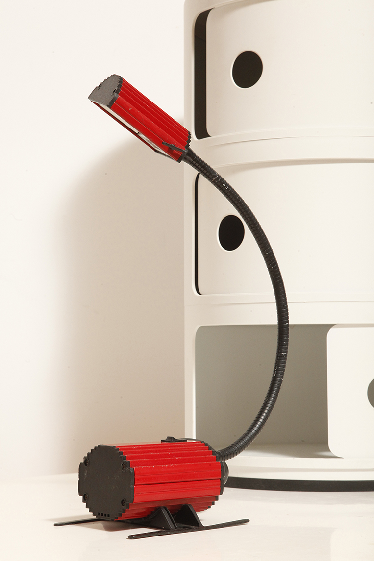 Projekt nawiązuje do statków kosmicznych z pikselowych gier wideo z lat 80. Czyli innymi słowy lampka jest jedyna w swoim rodzaju. Mi osobiście kojarzy się raczej z nieco niebezpiecznym zwierzątkiem, a mianowicie ze skorpionem. Pewnie przez podobieństwo jakby anatomiczne. Długie giętkie ramię wychodzące z tułowia. Co prawda nic nie wiem, o czerwonych skorpionach, ale co ja tam wiem w ogóle o życiu. No i skorpiony nie mają płóz, a ta lampka ma.