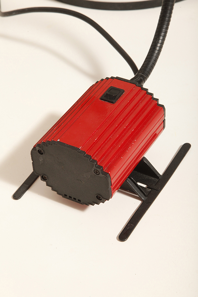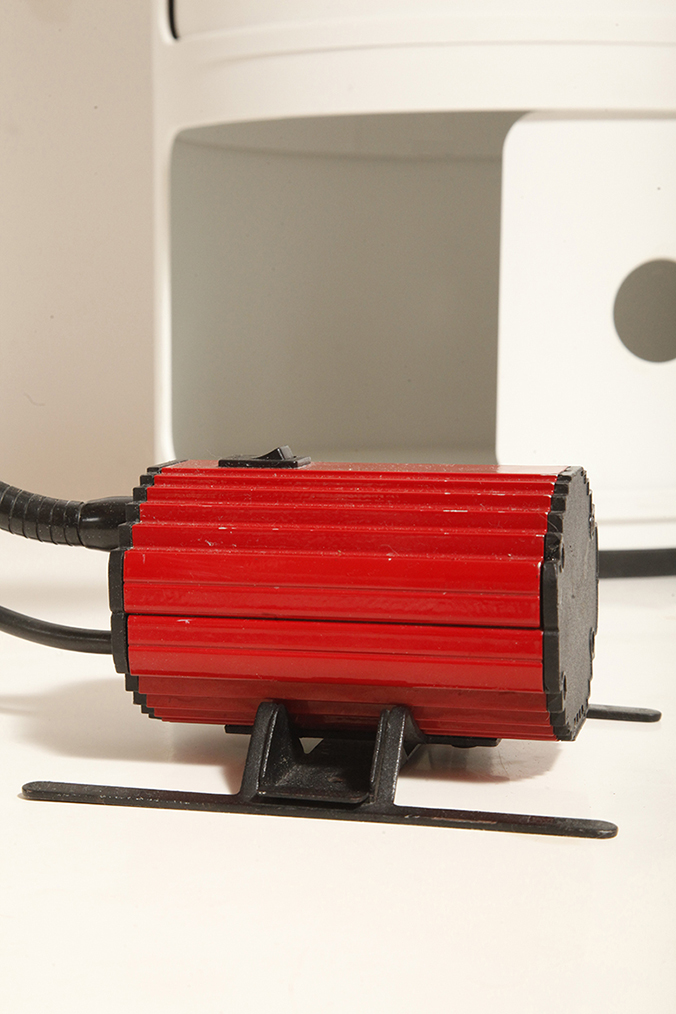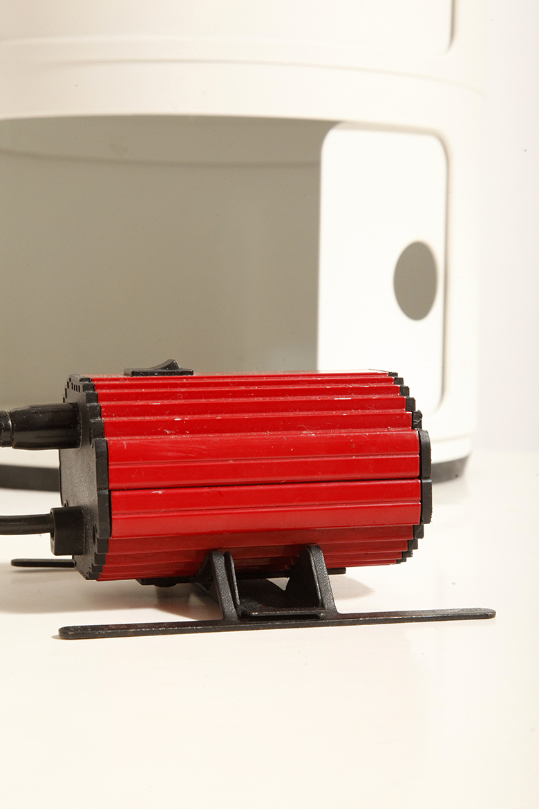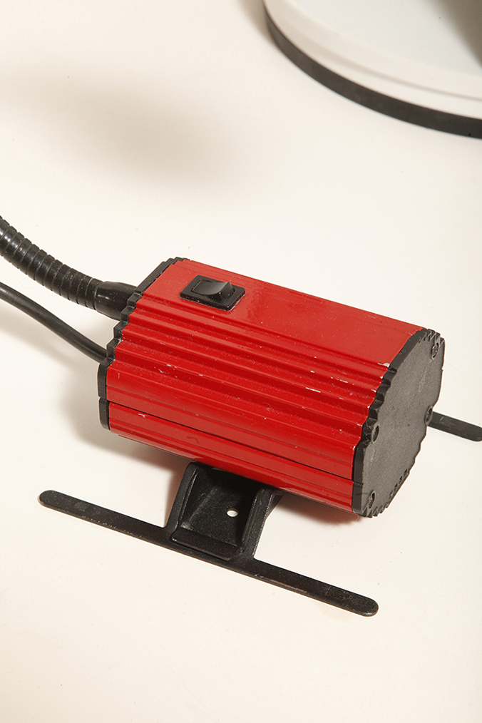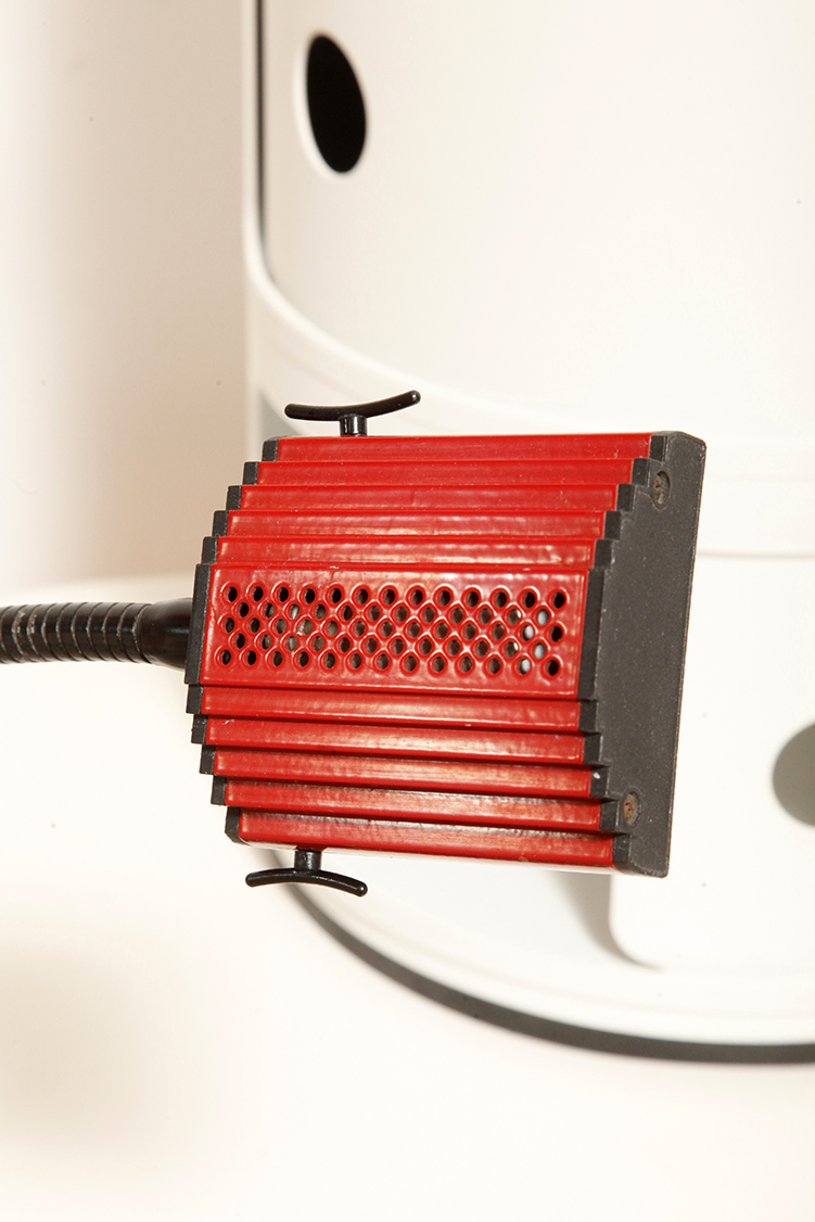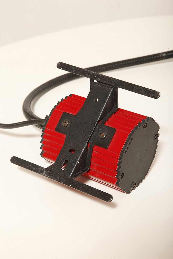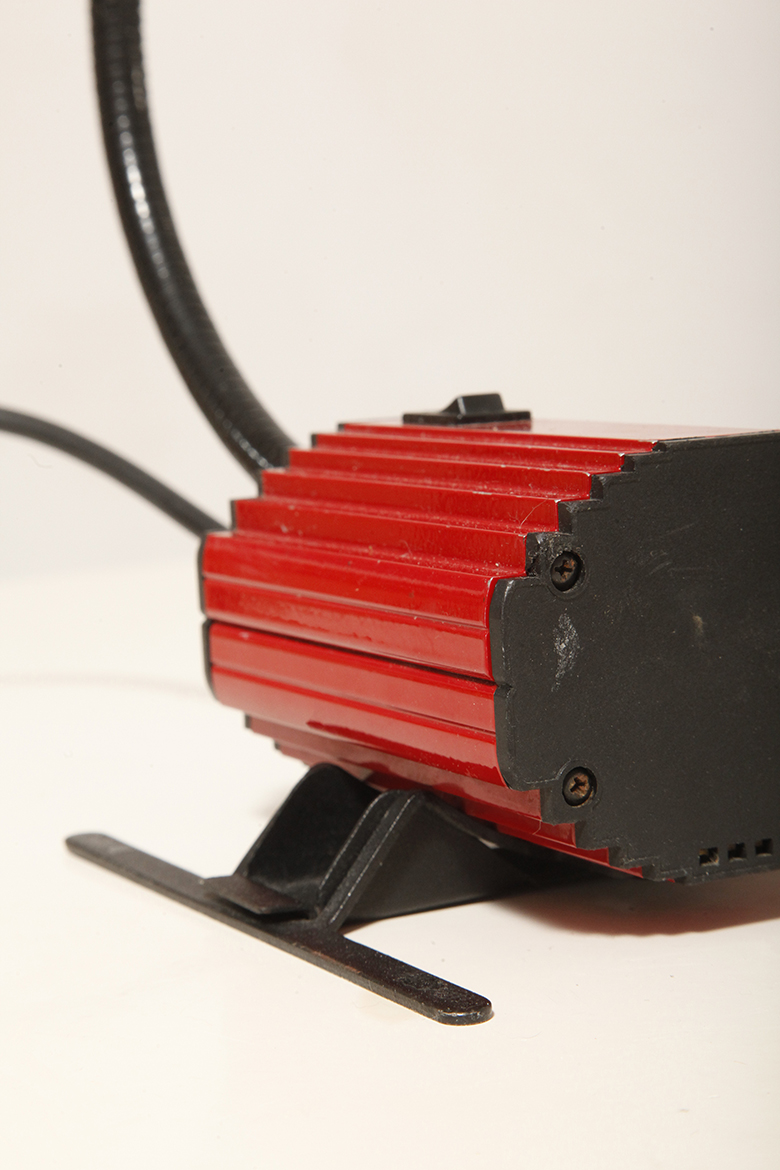 Wykonana z aluminium, twardego czarnego plastiku i czerwonej emaliowanej stali.