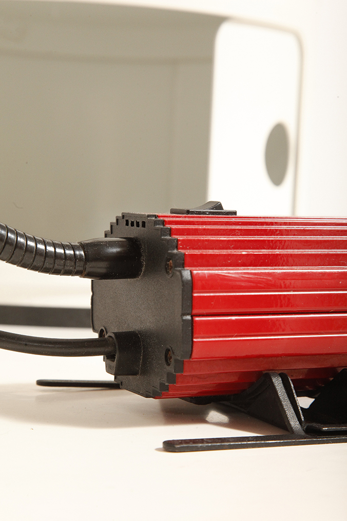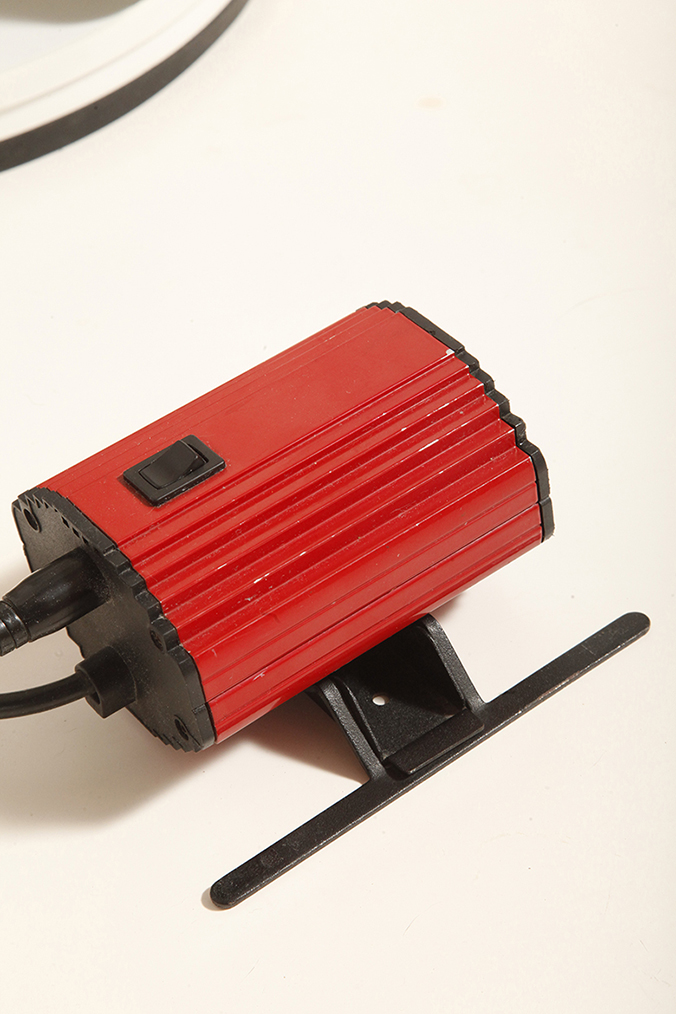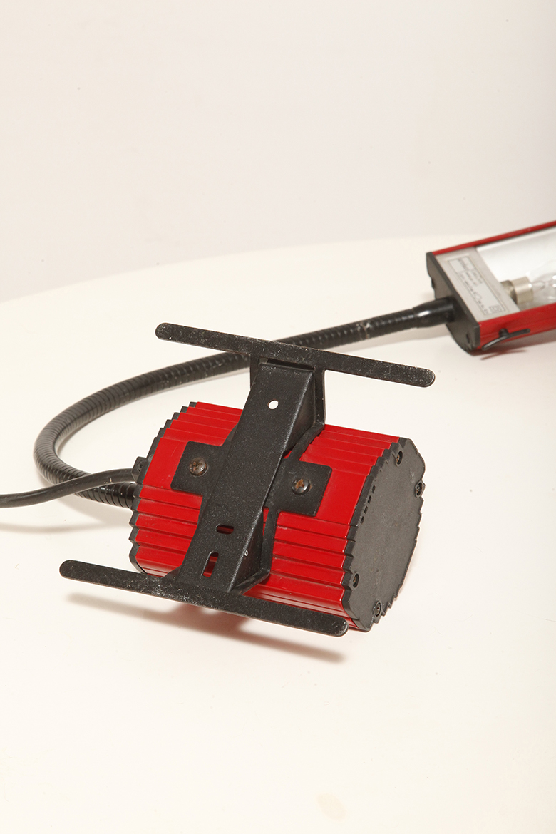 Świeci jedną żarówką halogenową taką jakich używa się w samochodach. Tanią i łatwo dostępną.