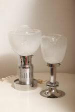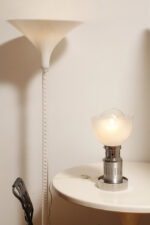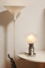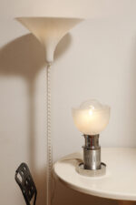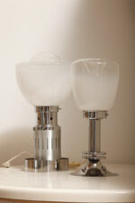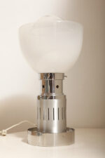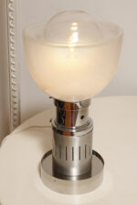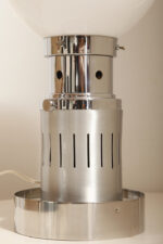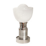 Jednopunktowa lampa biurkowa/nocna/stołowa ze szklanym mleczno białym półprzezroczystym kloszem i metalową polerowaną podstawą, Włochy, lata 70.