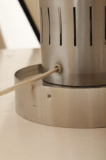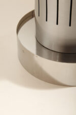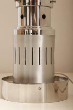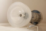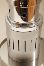 Lampa efektowna swą nienachalną elegancją, że tak to ujmę. Czyli szkło und metal, w chromowanej odsłonie, a ściśle mówiąc z metalową polerowaną podstawą. Trochę taka industrialna, czy też przemysłowa ta podstawa, ale że błyszcząca, to bardziej stylizowana na tę przemysłowość jakby nie patrzeć. A w zestawieniu z mlecznobiałym kloszem z meniskiem wypukłym w środku broni się sama, bo ładna jest cholera.