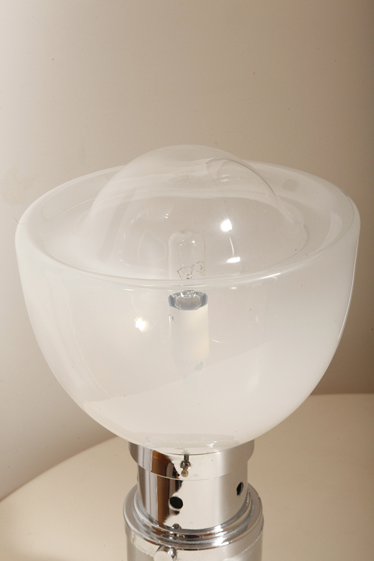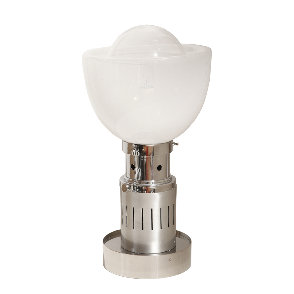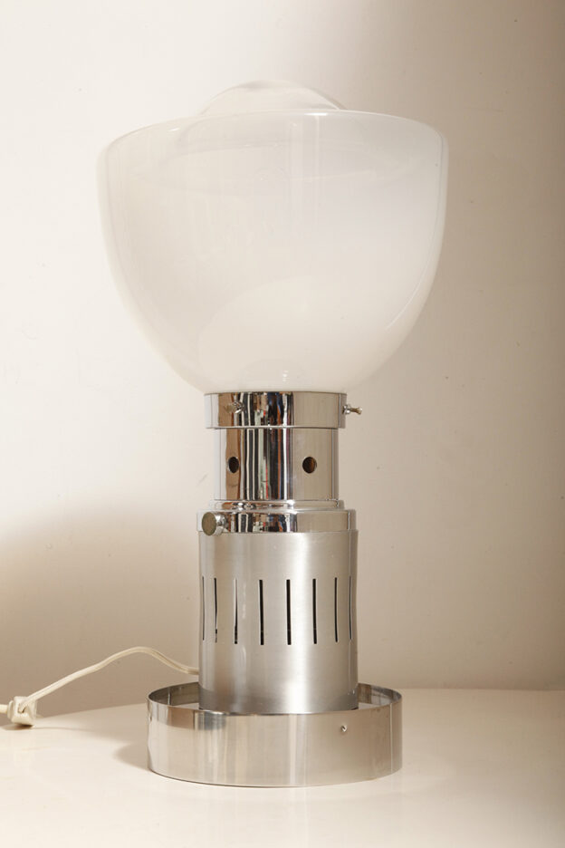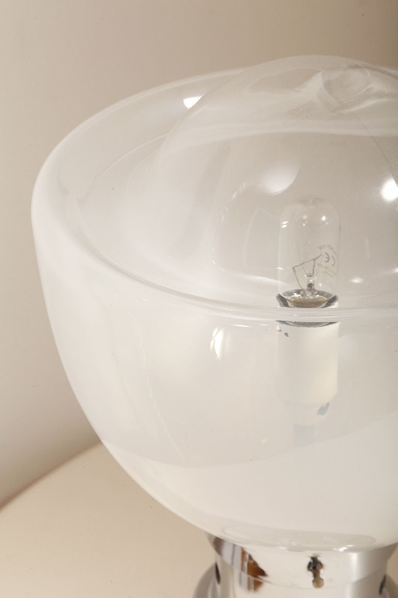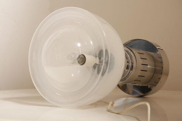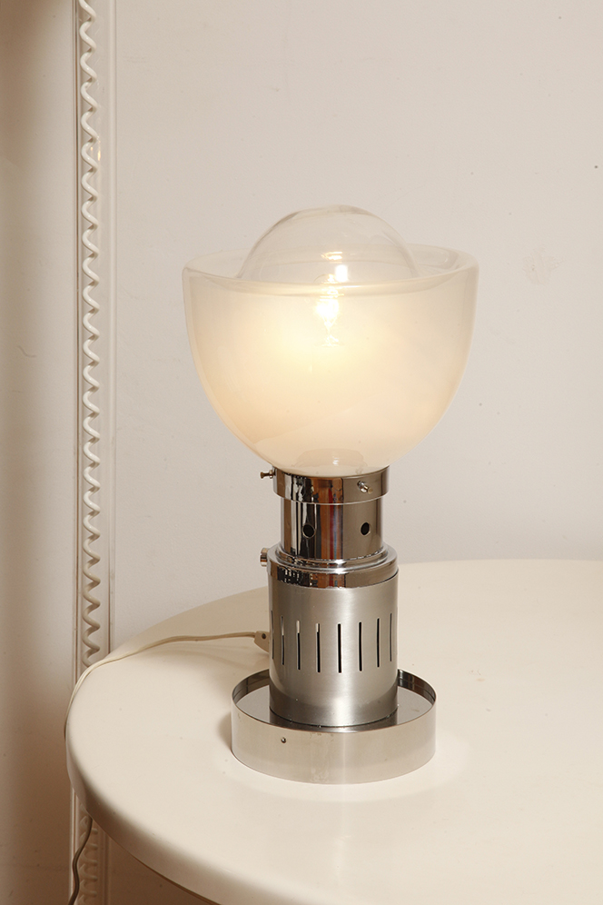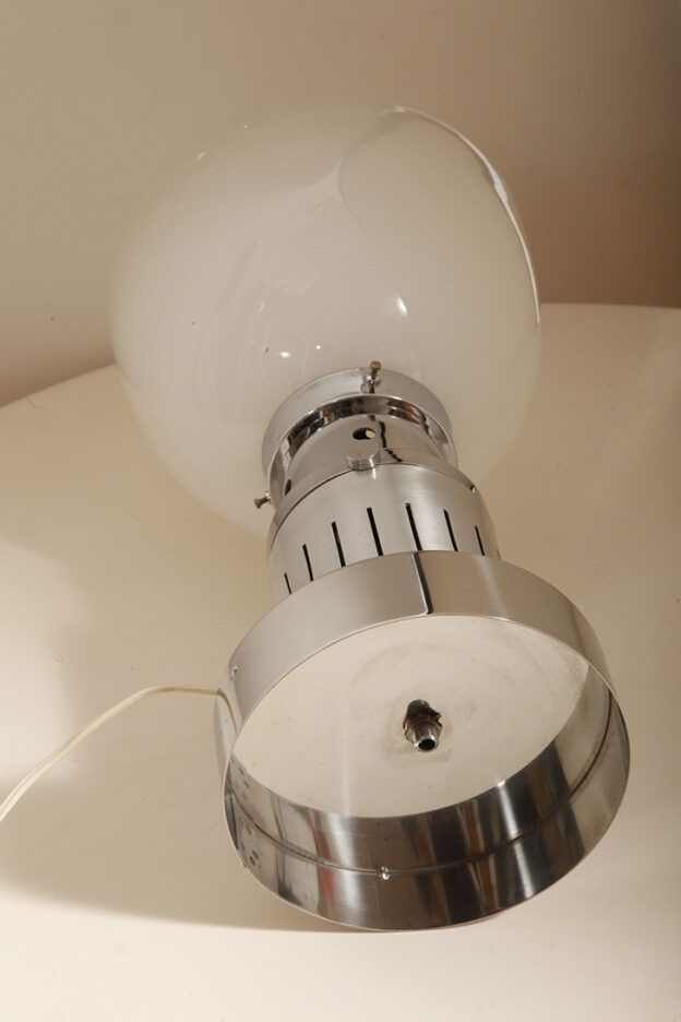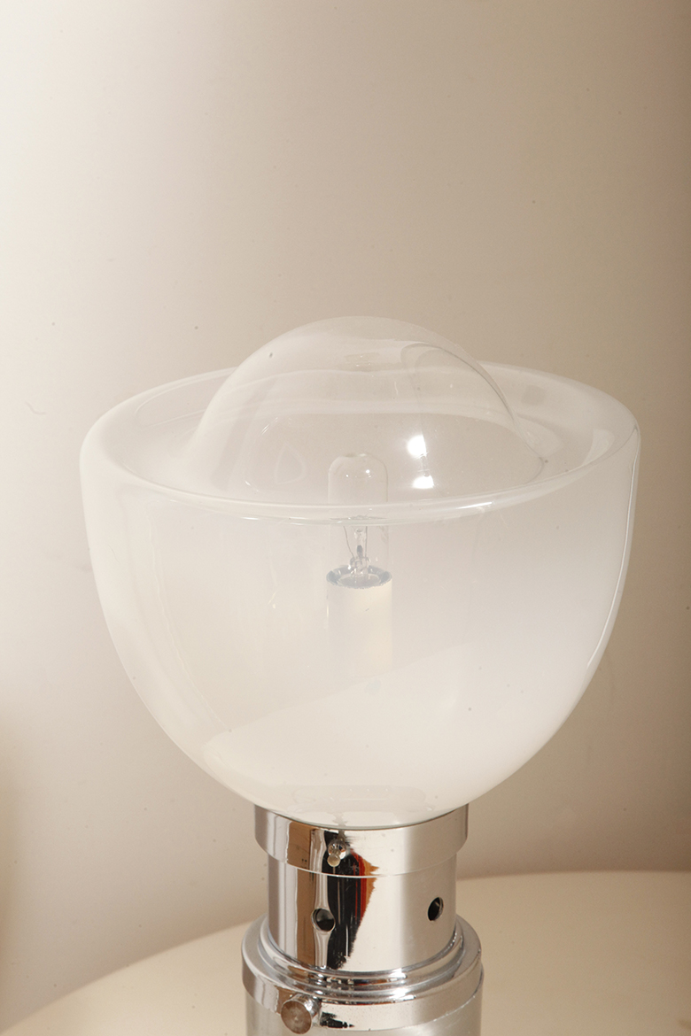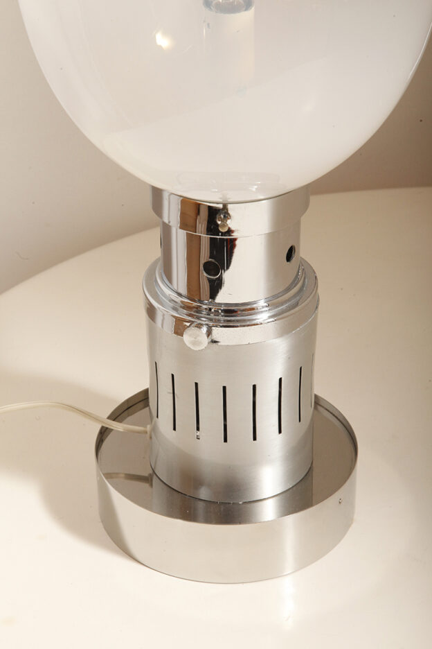 Jednopunktowa lampa biurkowa/nocna/stołowa ze szklanym mleczno białym półprzezroczystym kloszem i metalową polerowaną podstawą, Włochy, lata 70.