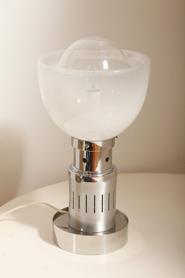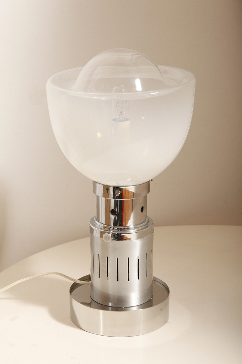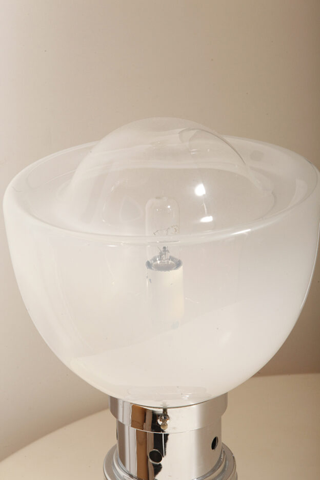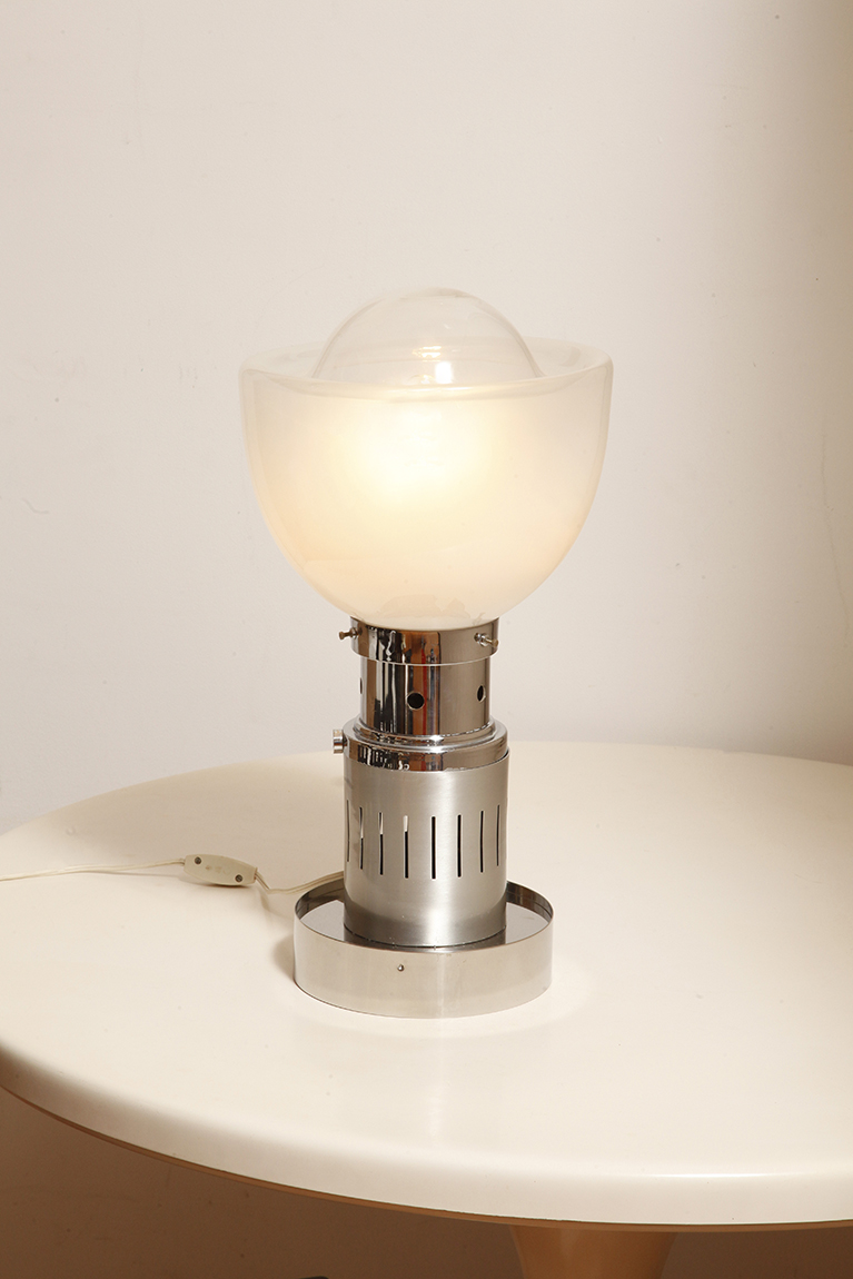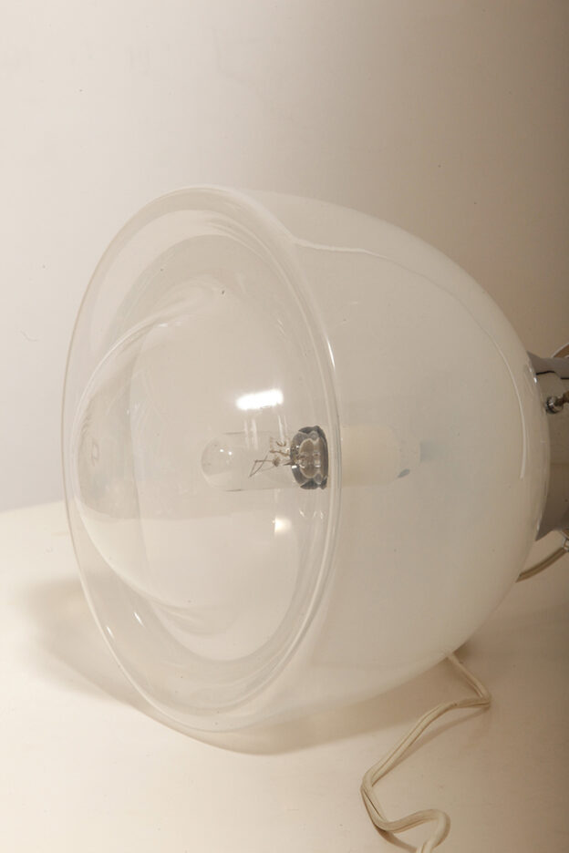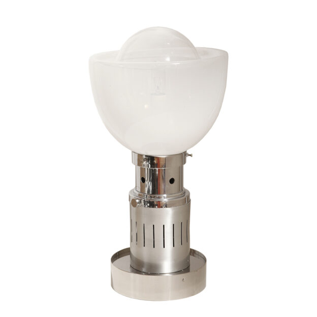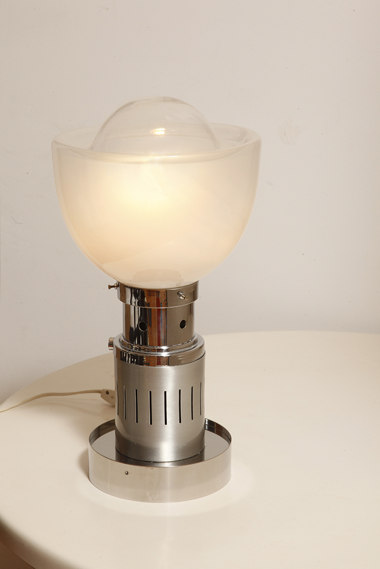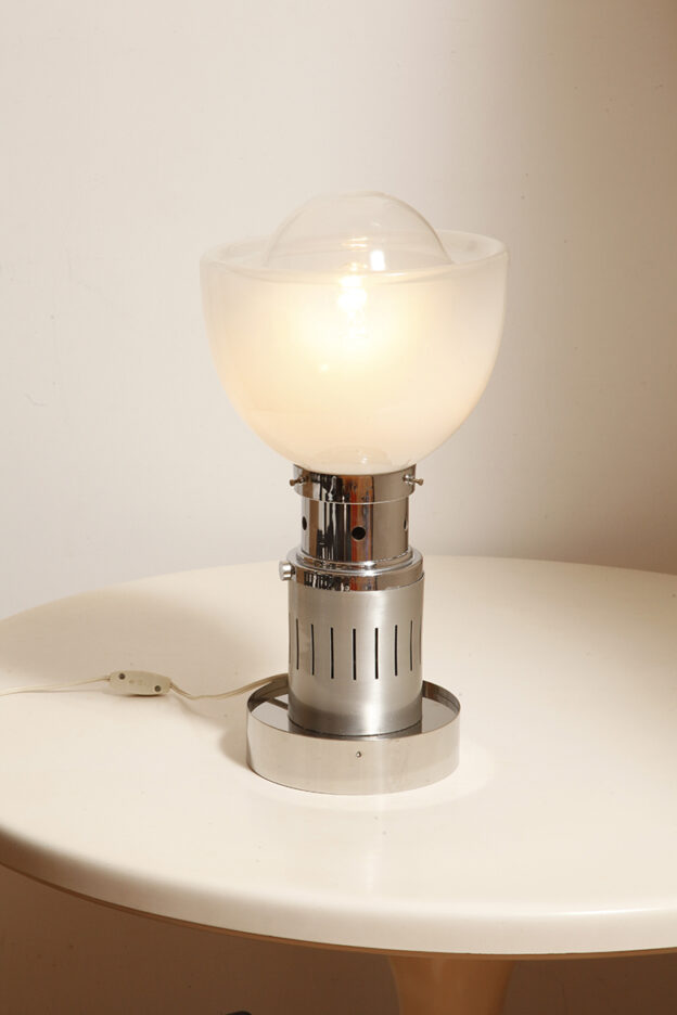 Jednopunktowa lampa biurkowa/nocna/stołowa ze szklanym mleczno białym półprzezroczystym kloszem i metalową polerowaną podstawą, Włochy, lata 70.