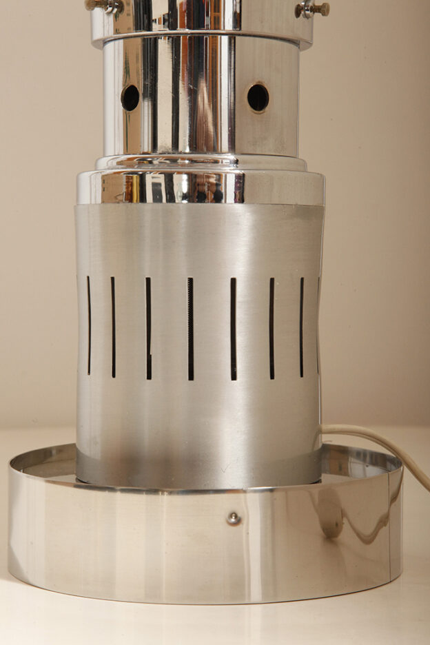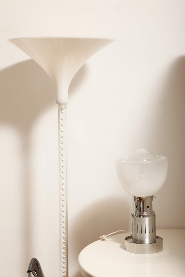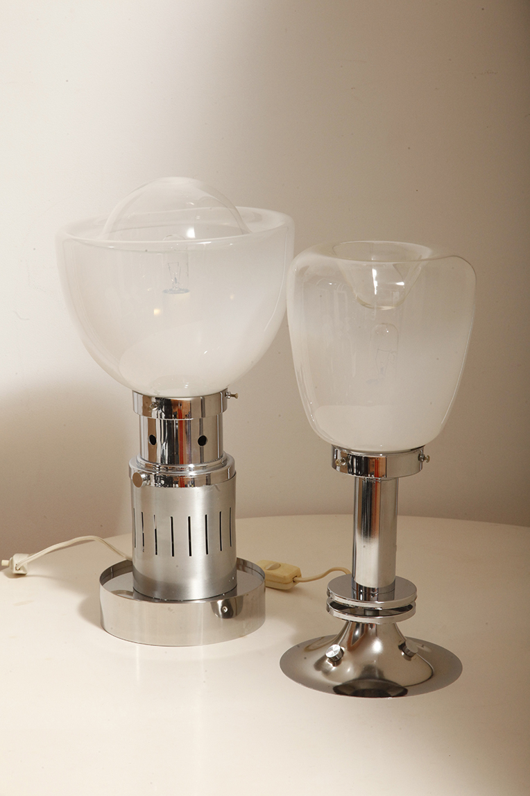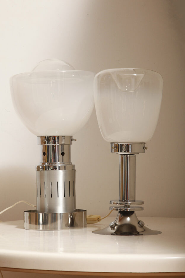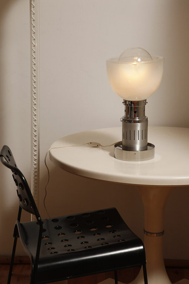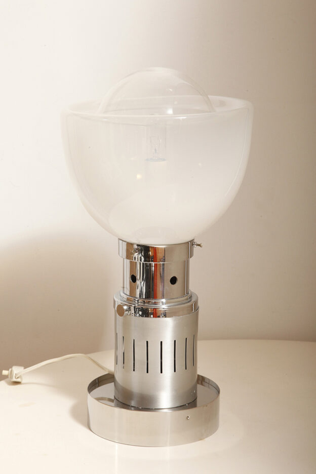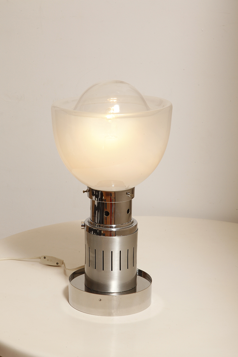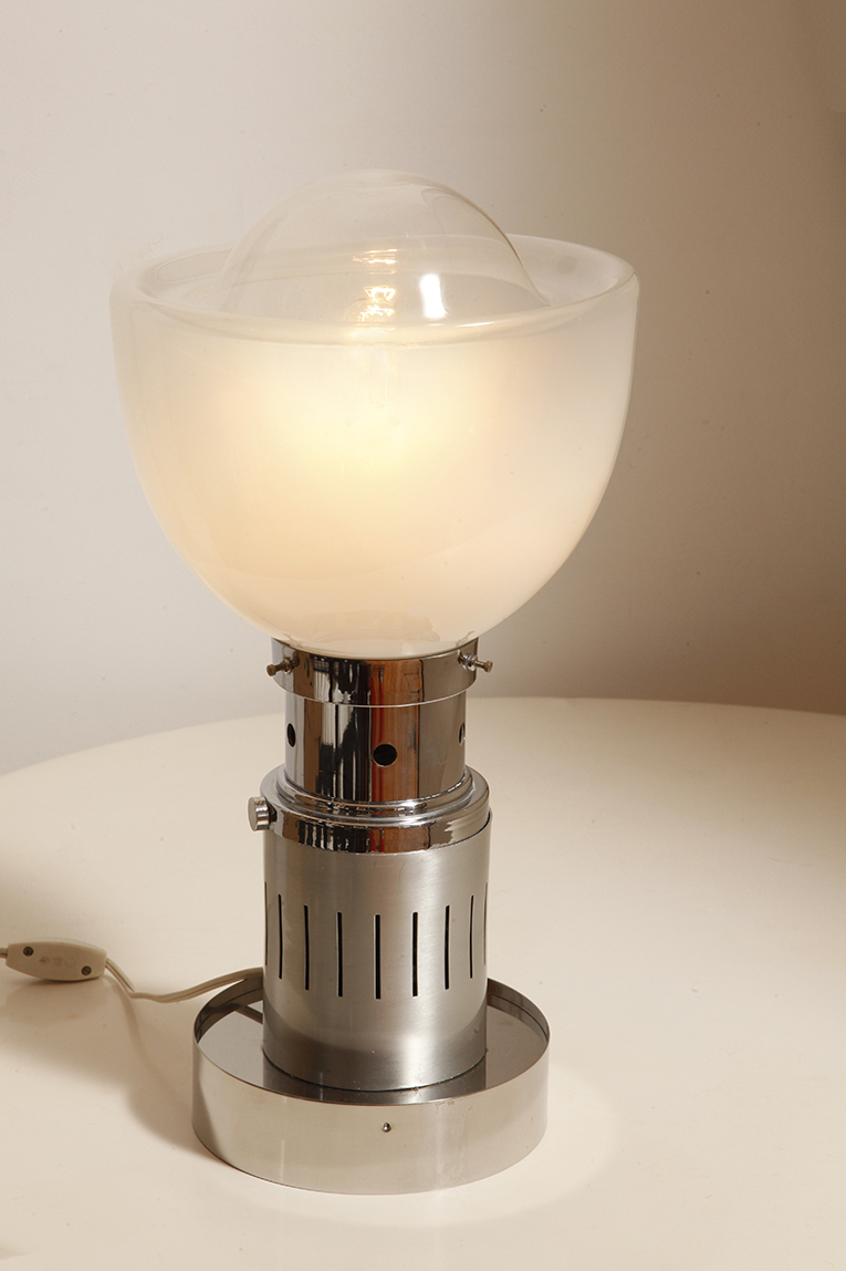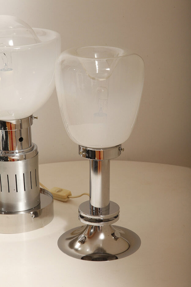 Jednopunktowa lampa biurkowa/nocna/stołowa ze szklanym mleczno białym półprzezroczystym kloszem i metalową polerowaną podstawą, Włochy, lata 70.