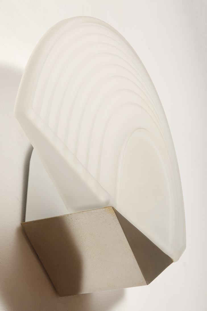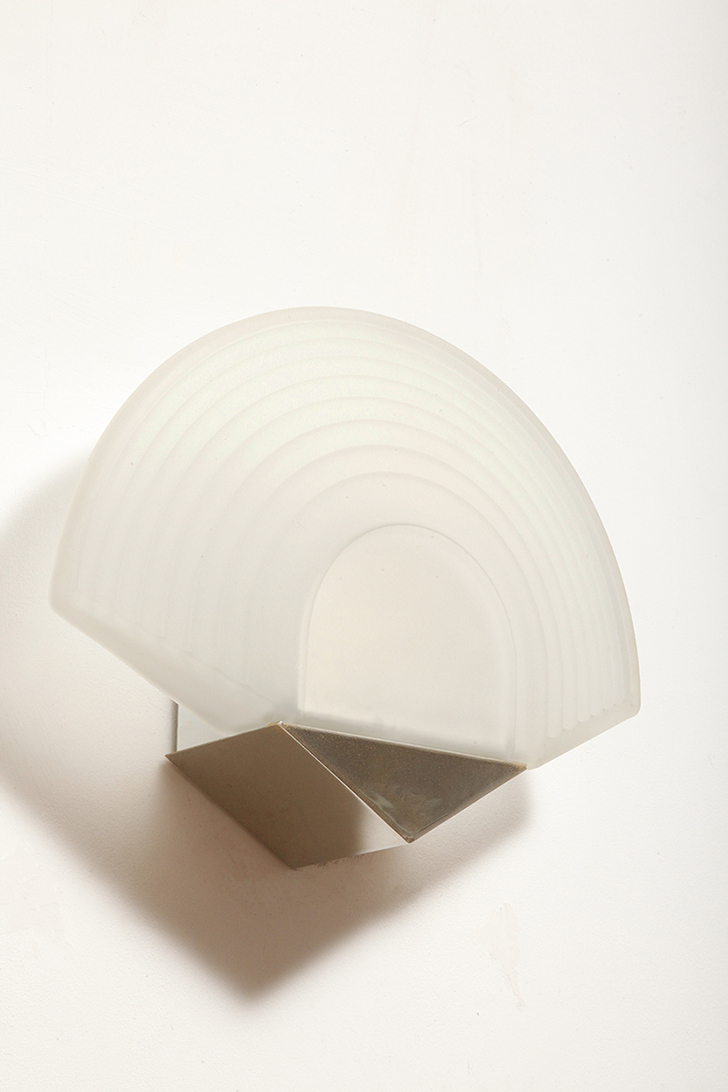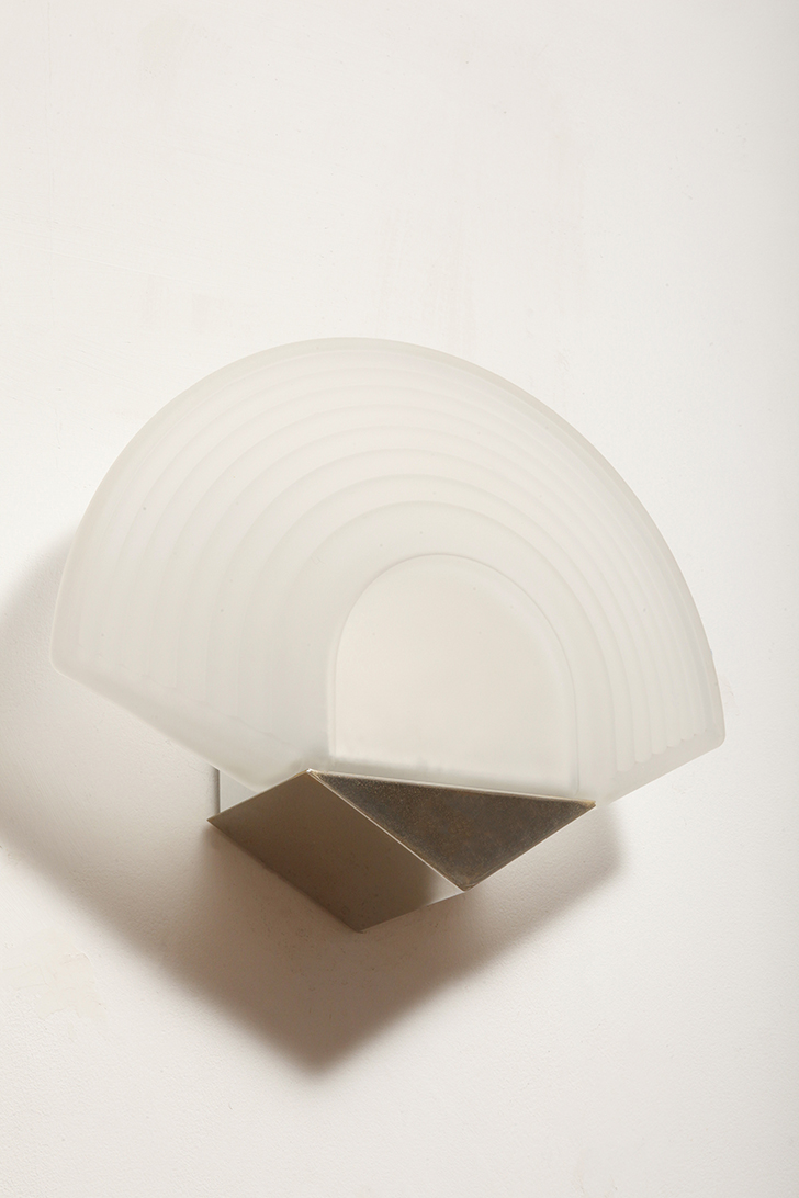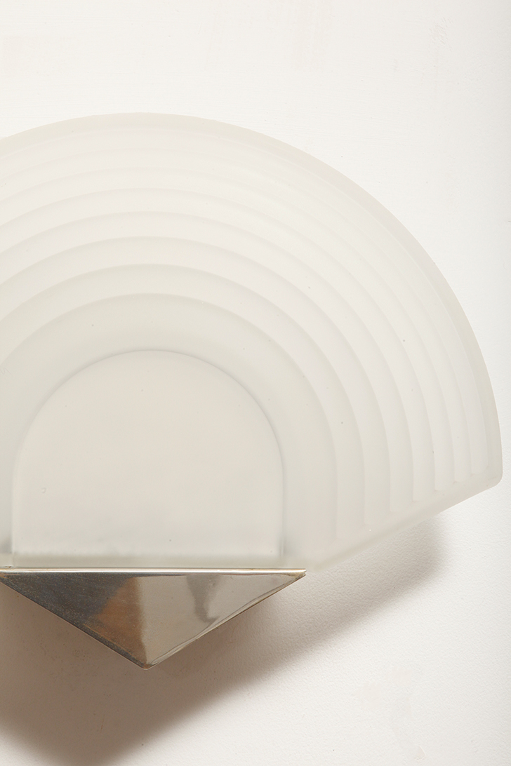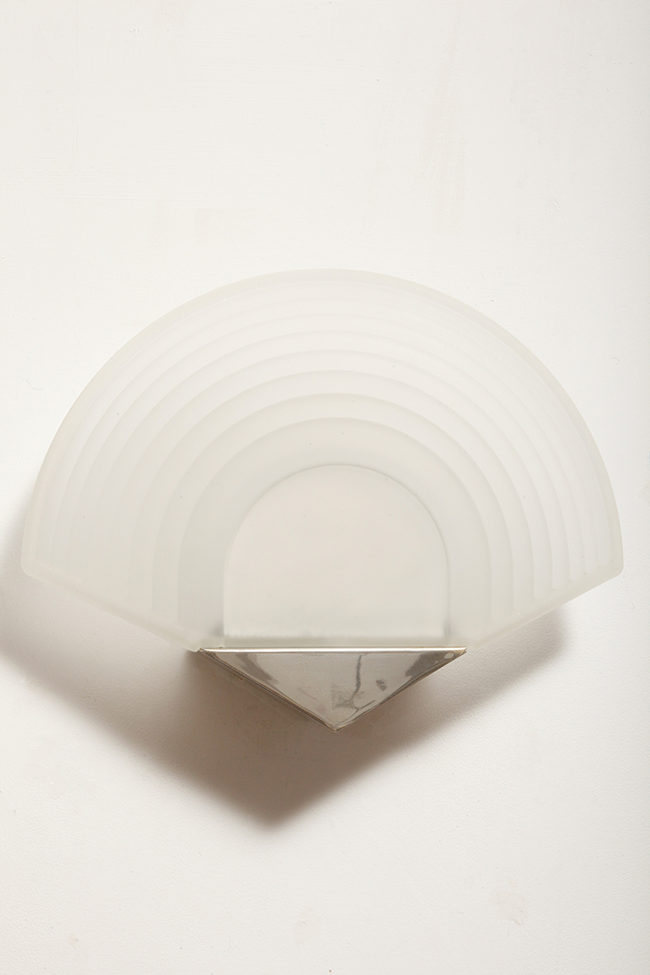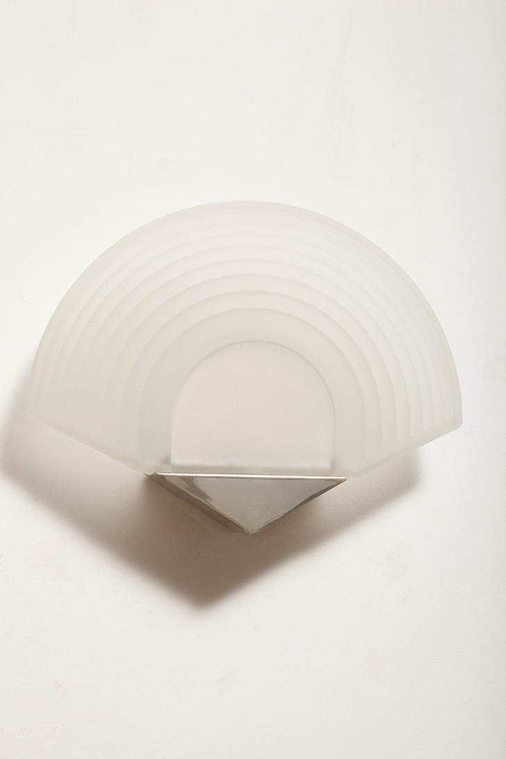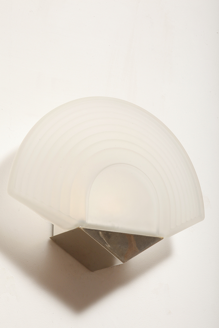 Jednopunktowa lampa ścienna/kinkiet w stylu Art Deco w kształcie wachlarza ze szklanym reliefowym matowym kloszem osadzonym na metalowej podstawie, Egoluce, Włochy, lata 80.