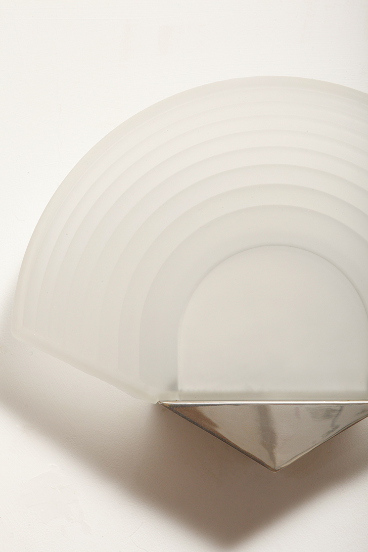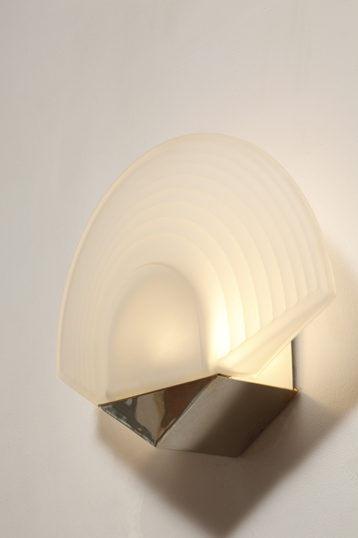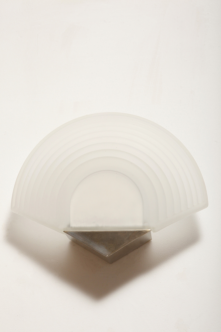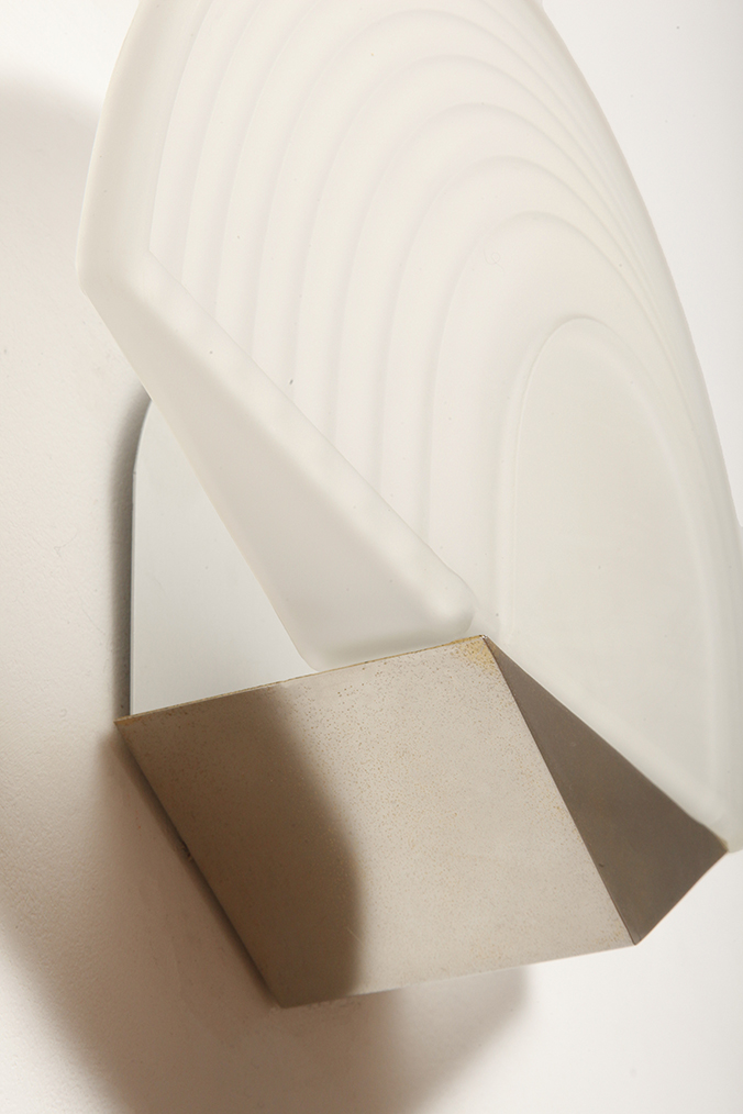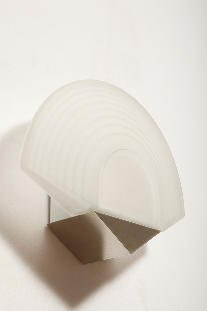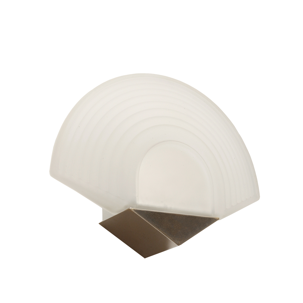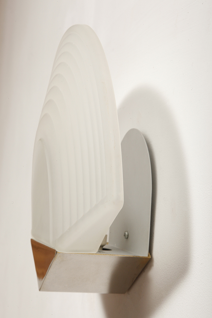 Jednopunktowa lampa ścienna/kinkiet w stylu Art Deco w kształcie wachlarza ze szklanym reliefowym matowym kloszem osadzonym na metalowej podstawie, Egoluce, Włochy, lata 80.