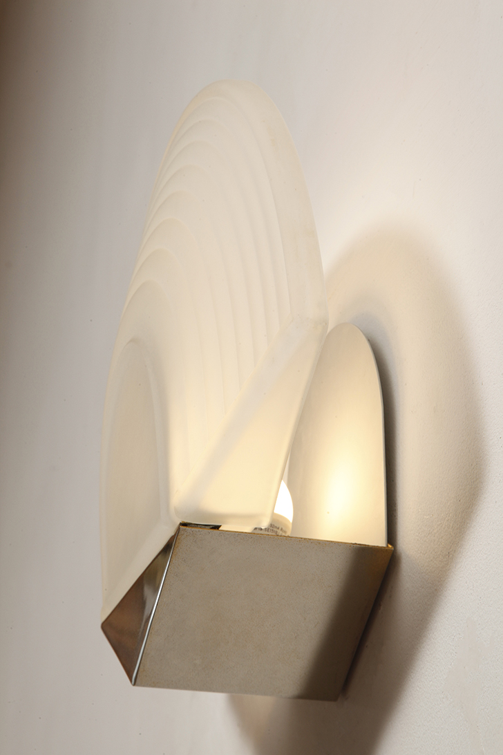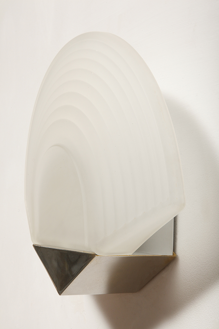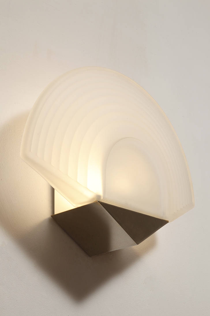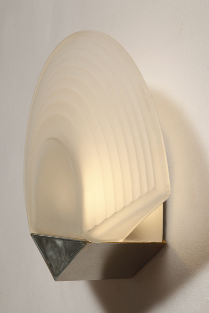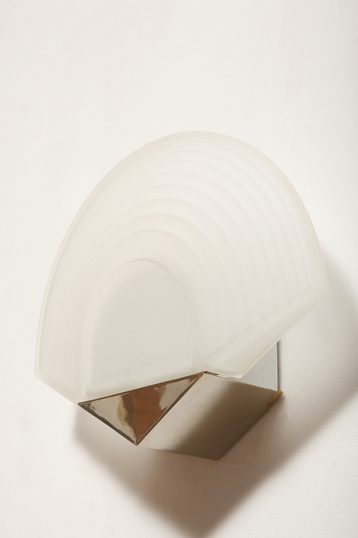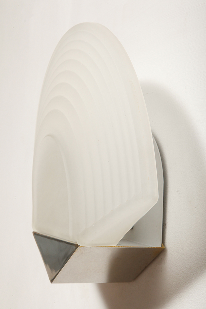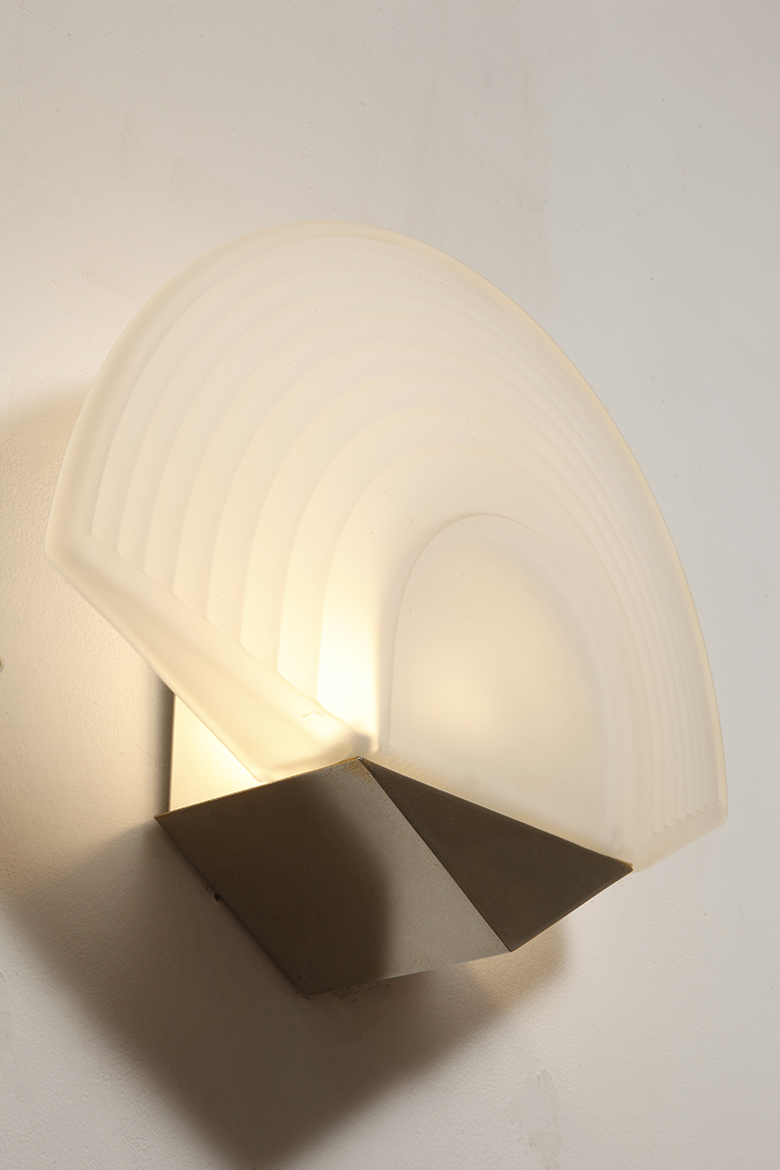 Jednopunktowa lampa ścienna/kinkiet w stylu Art Deco w kształcie wachlarza ze szklanym reliefowym matowym kloszem osadzonym na metalowej podstawie, Egoluce, Włochy, lata 80.