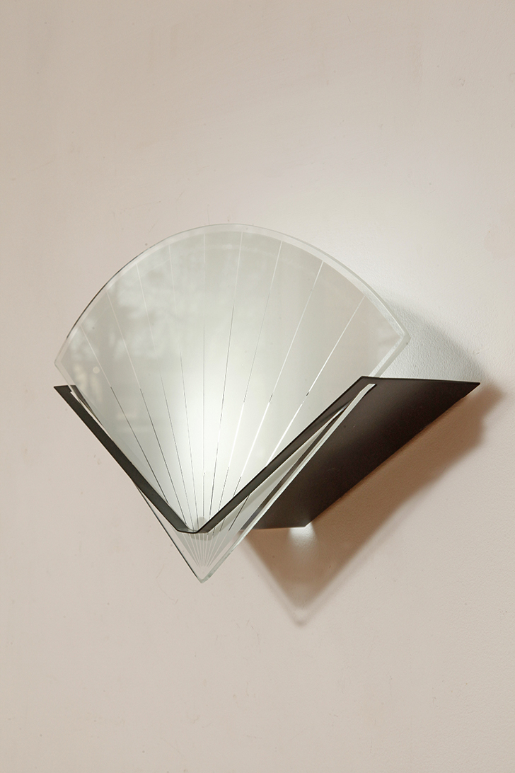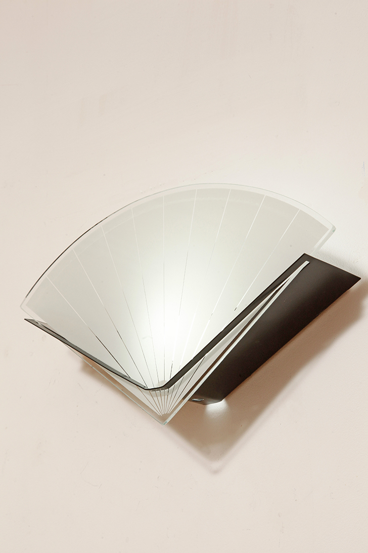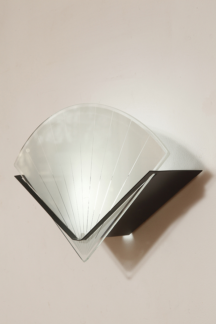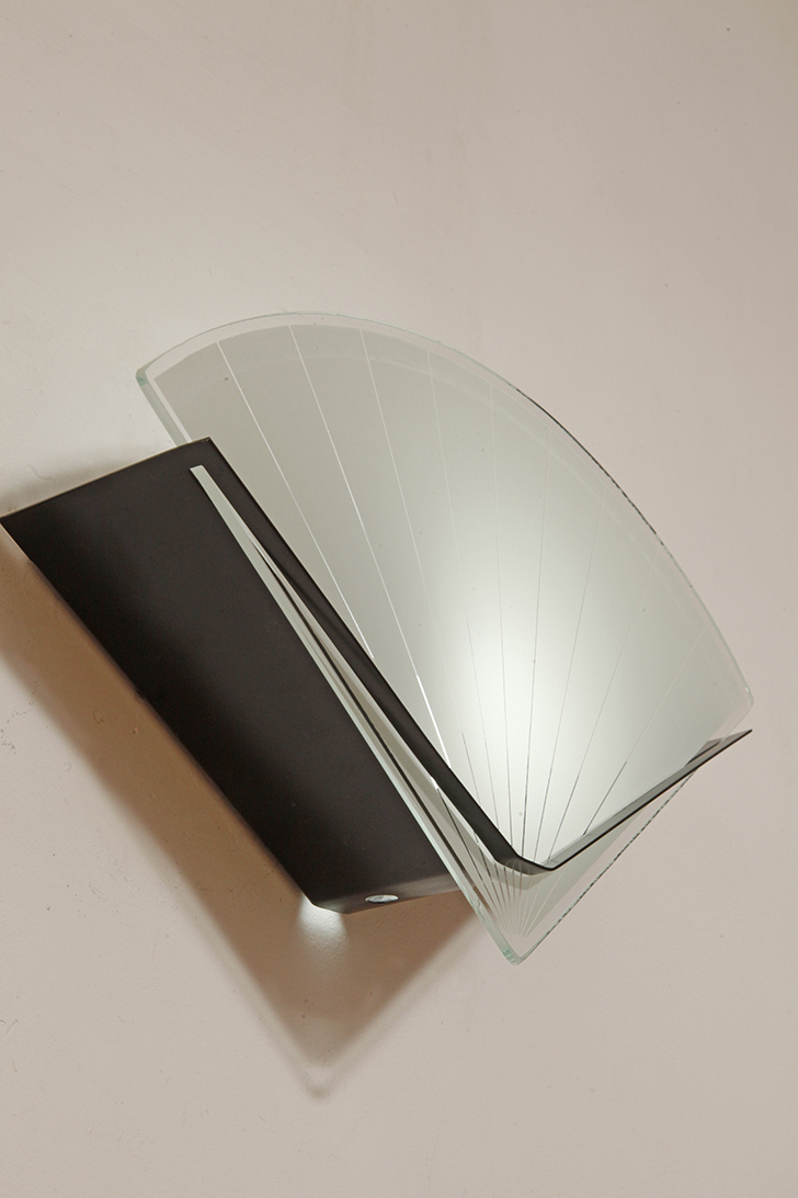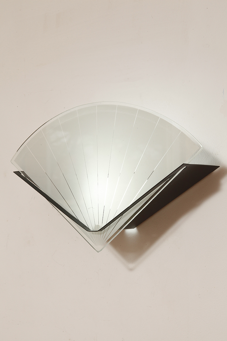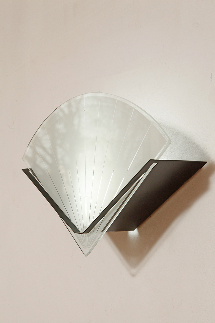 Jednopunktowa lampa ścienna/kinkiet ze szklanym płaskim mlecznobiałym kloszem w kształcie wachlarza osadzonym na metalowej czarnej podstawie, styl Memphis, Włochy, lata 80.