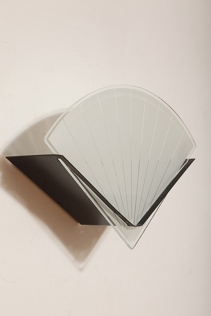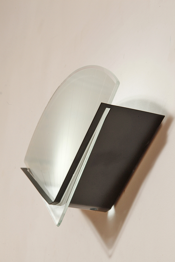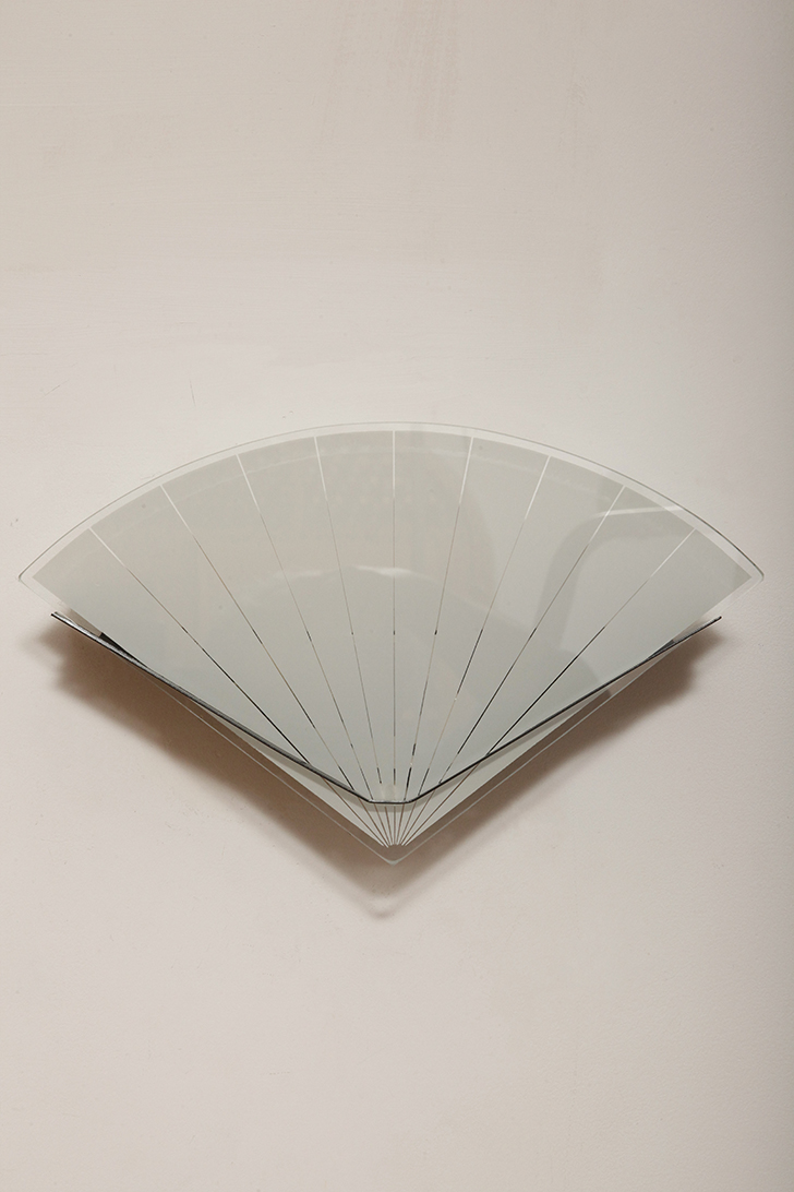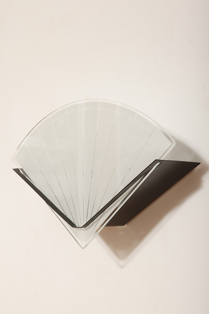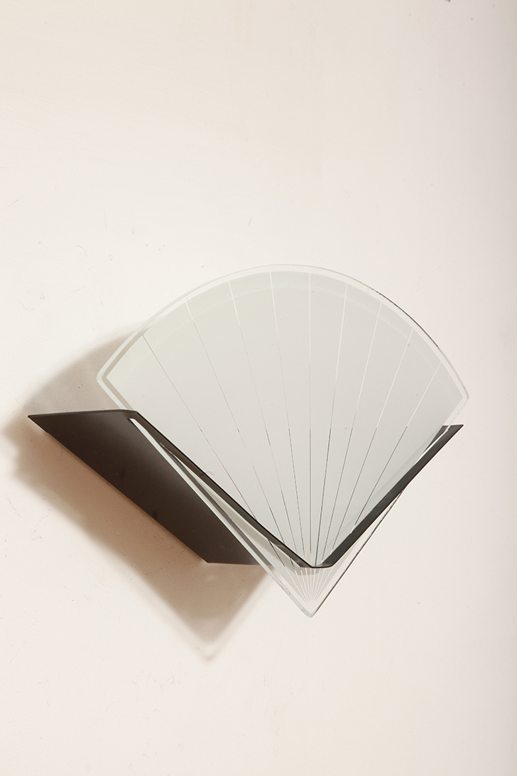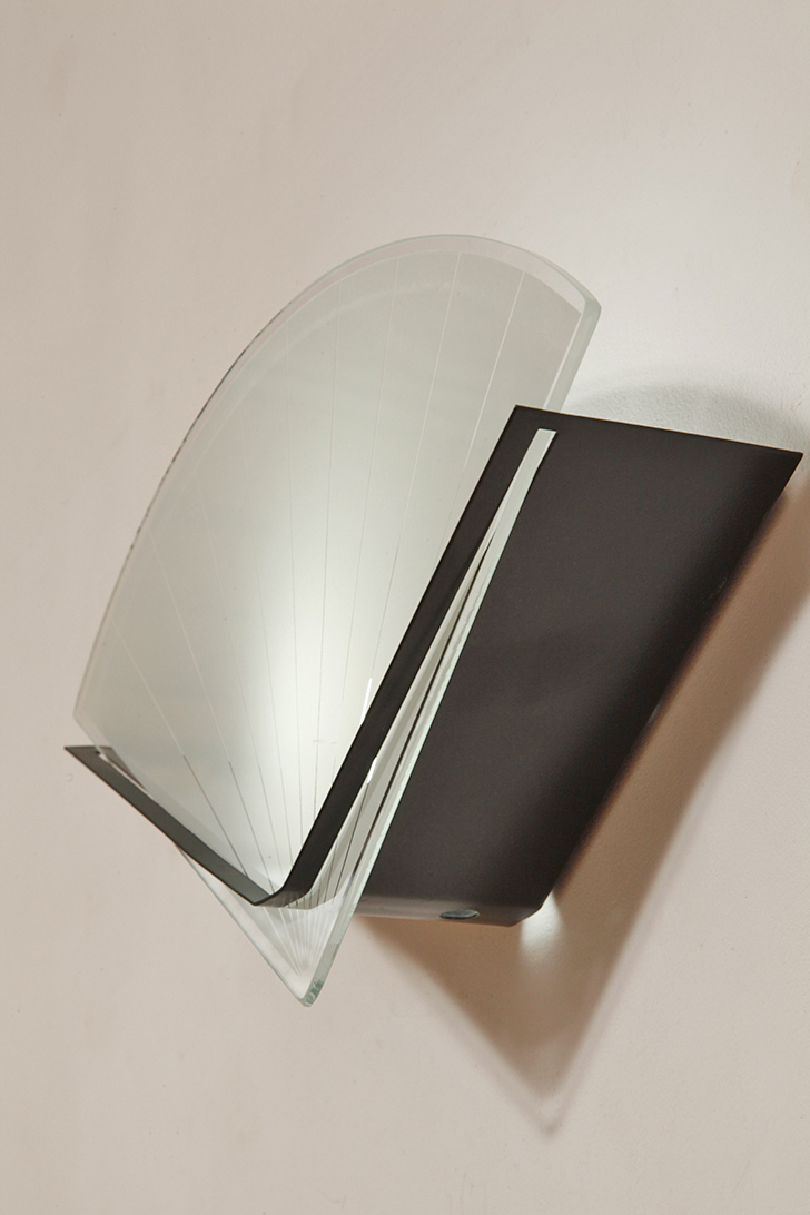Jednopunktowa lampa ścienna/kinkiet ze szklanym płaskim mlecznobiałym kloszem w kształcie wachlarza osadzonym na metalowej czarnej podstawie, styl Memphis, Włochy, lata 80.