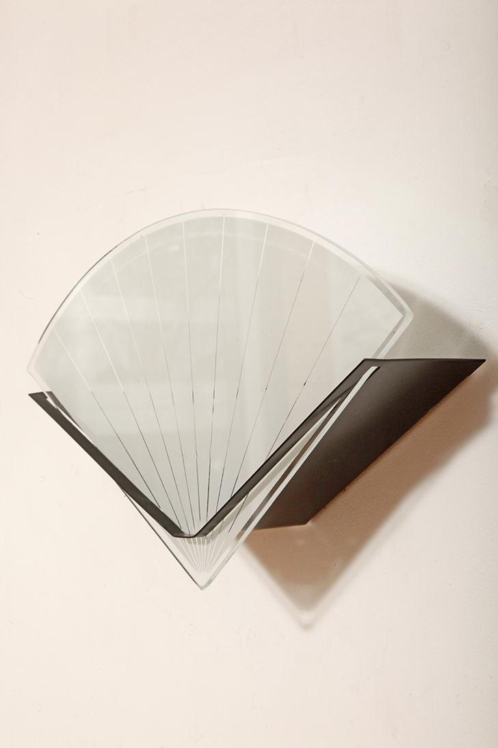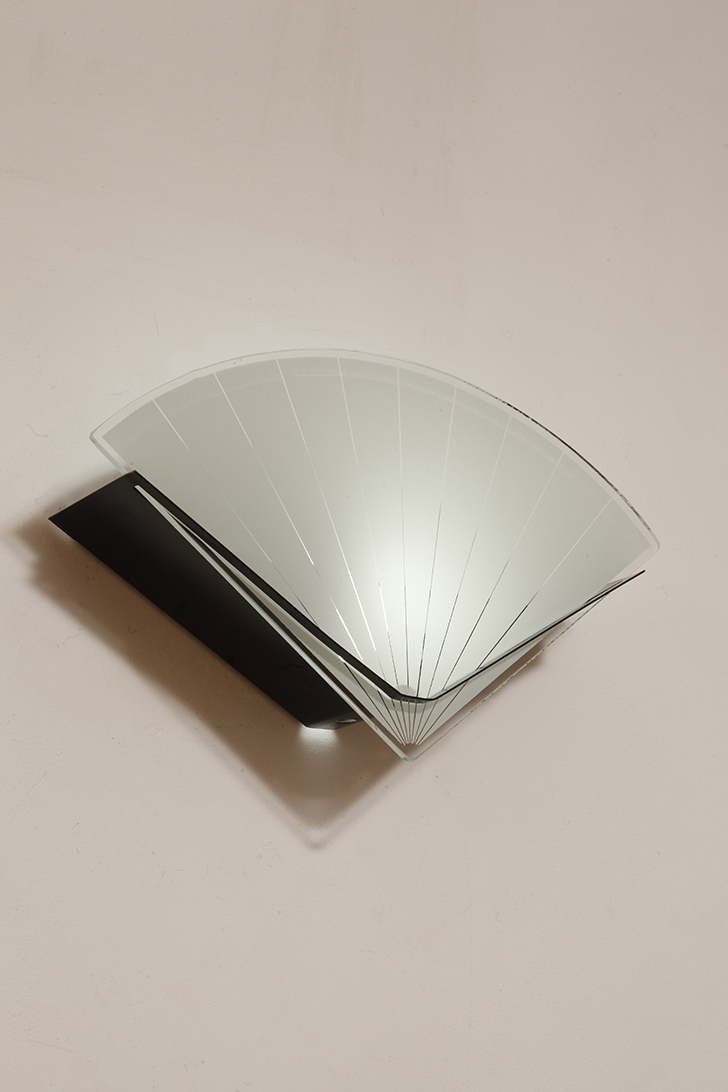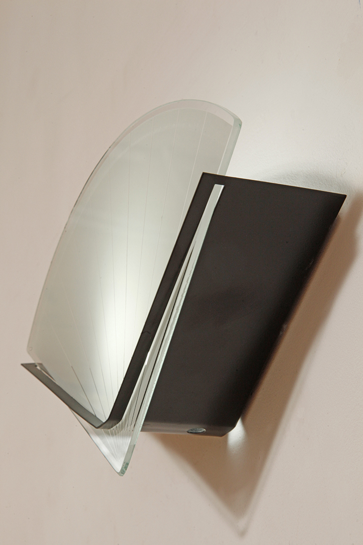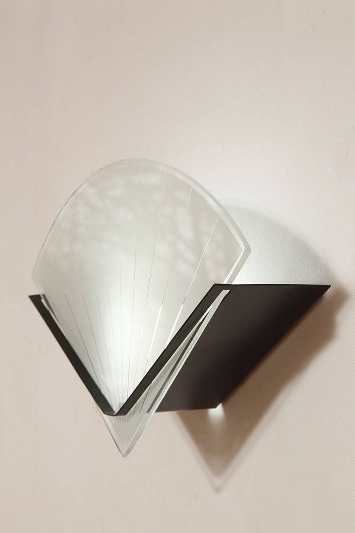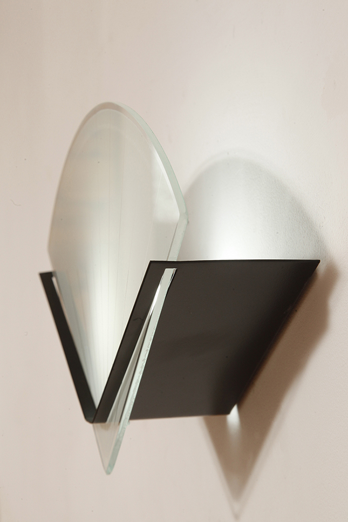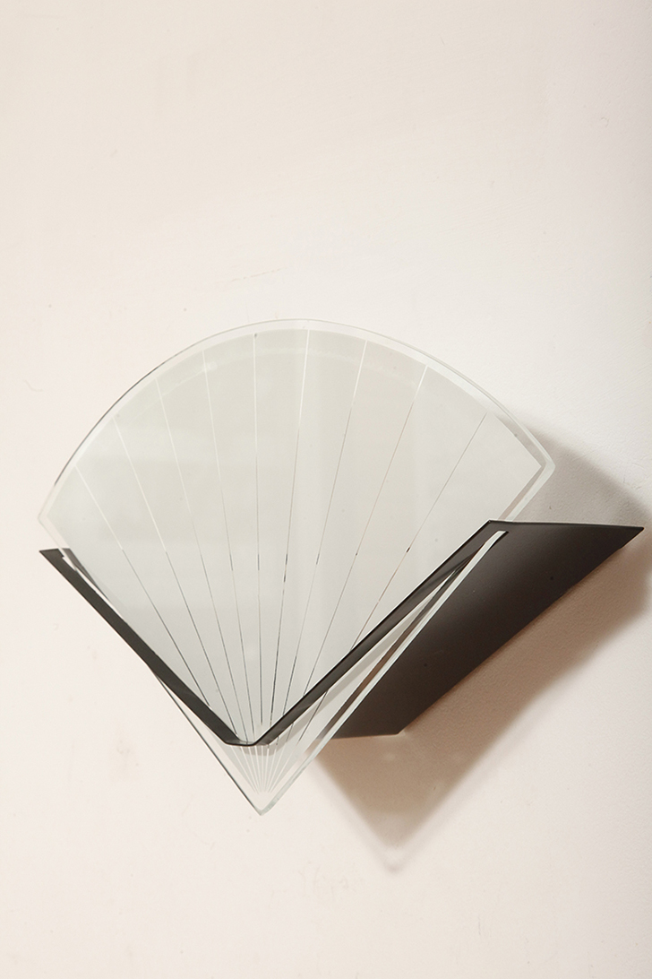 Jednopunktowa lampa ścienna/kinkiet ze szklanym płaskim mlecznobiałym kloszem w kształcie wachlarza osadzonym na metalowej czarnej podstawie, styl Memphis, Włochy, lata 80.