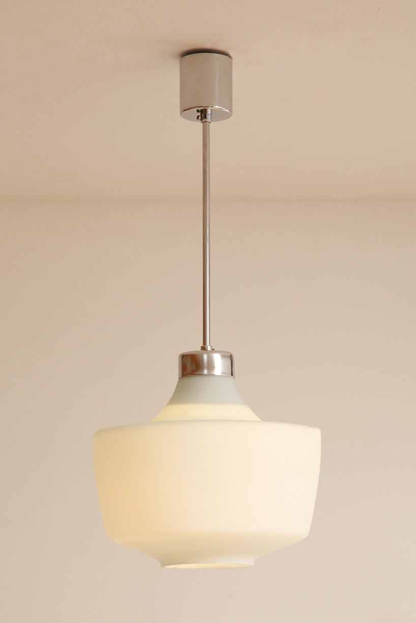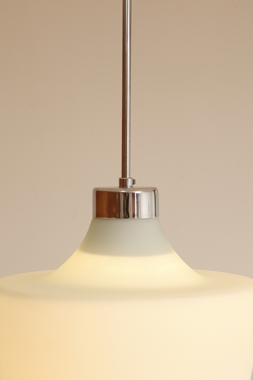 Jednopunktowa lampa sufitowa z mleczno-białym szklanym dwuwarstwowym kloszem z metalowym chromowanym zawieszeniem, Osvetlovací Sklo Valašské Medziřičí, Czechosłowacja, lata 70.