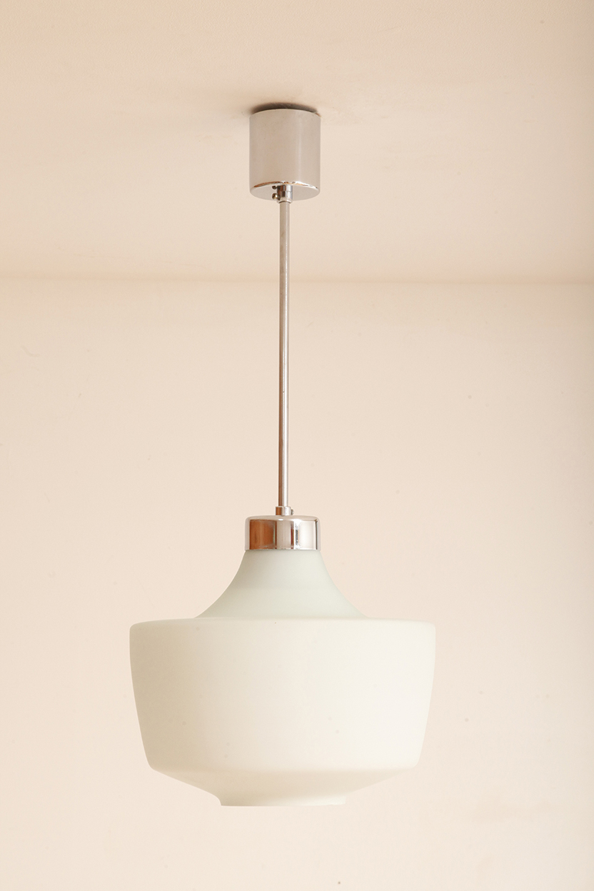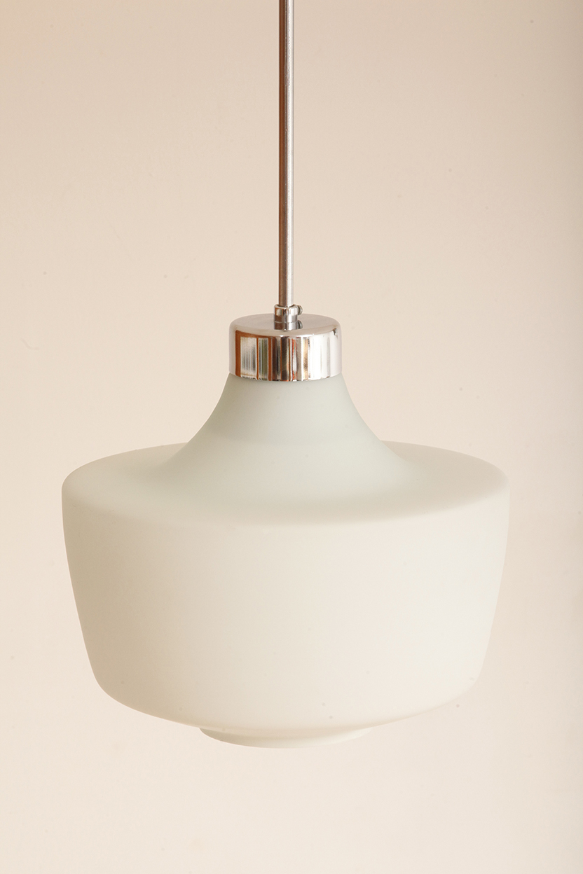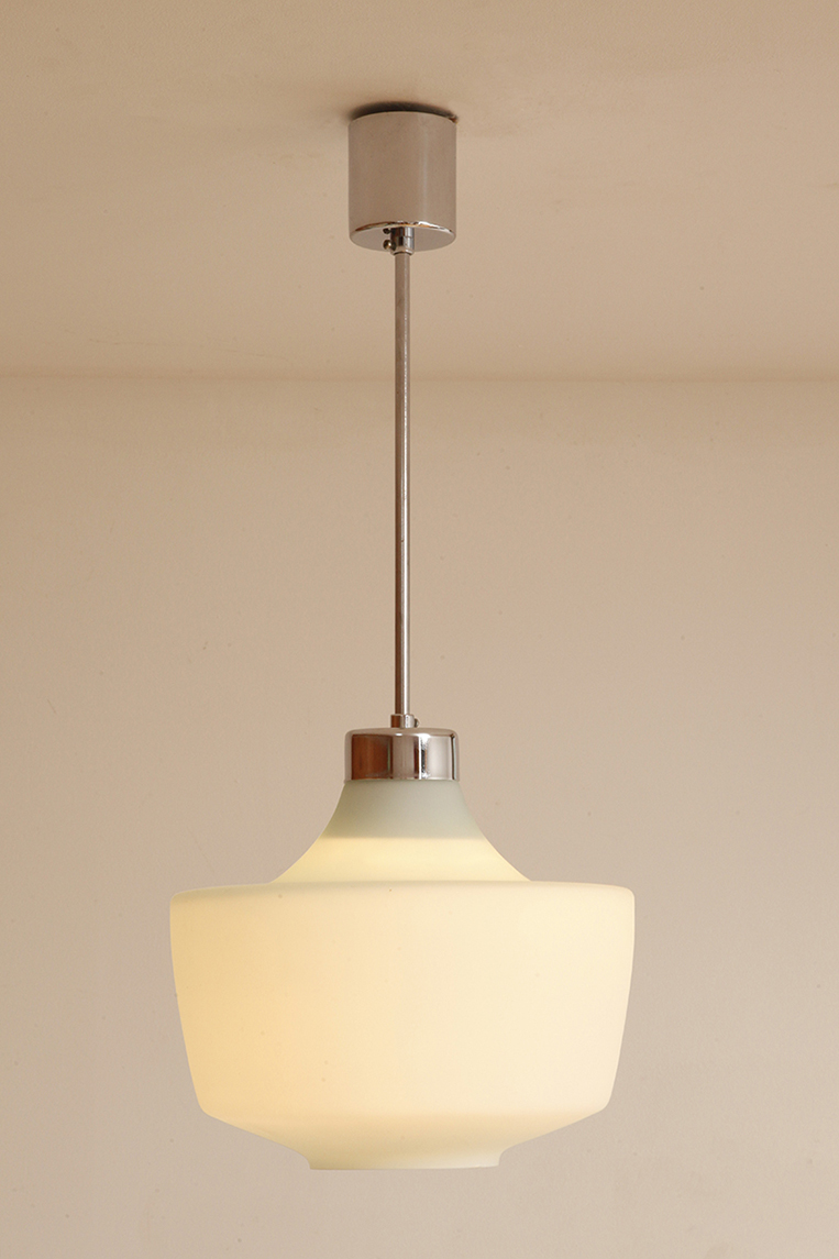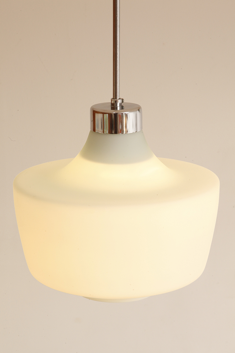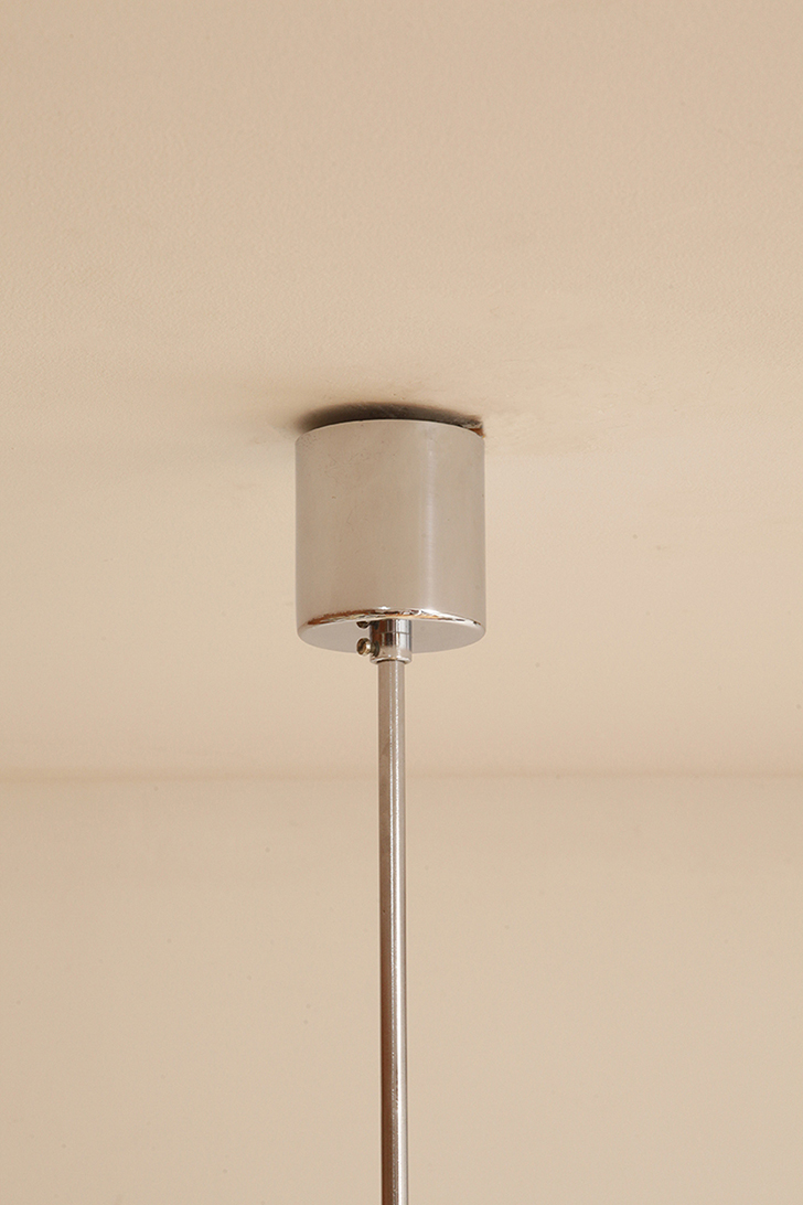 Czechosłowacka lampa sufitowa, złożona głownie z dość dużego szklanego klosza. A dodatkowo z metalowej w srebrzystości poczynionej sztycy na której wisi i chromowanej metalowej podsufitki i kapturka bezpośrednio i tuż nad samym kloszem umieszczonego.