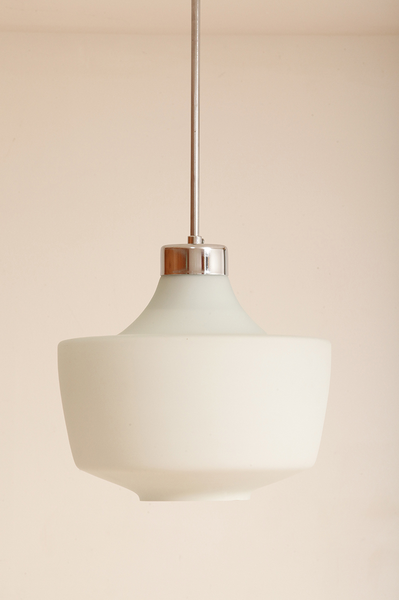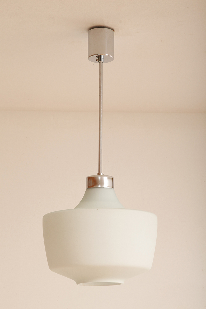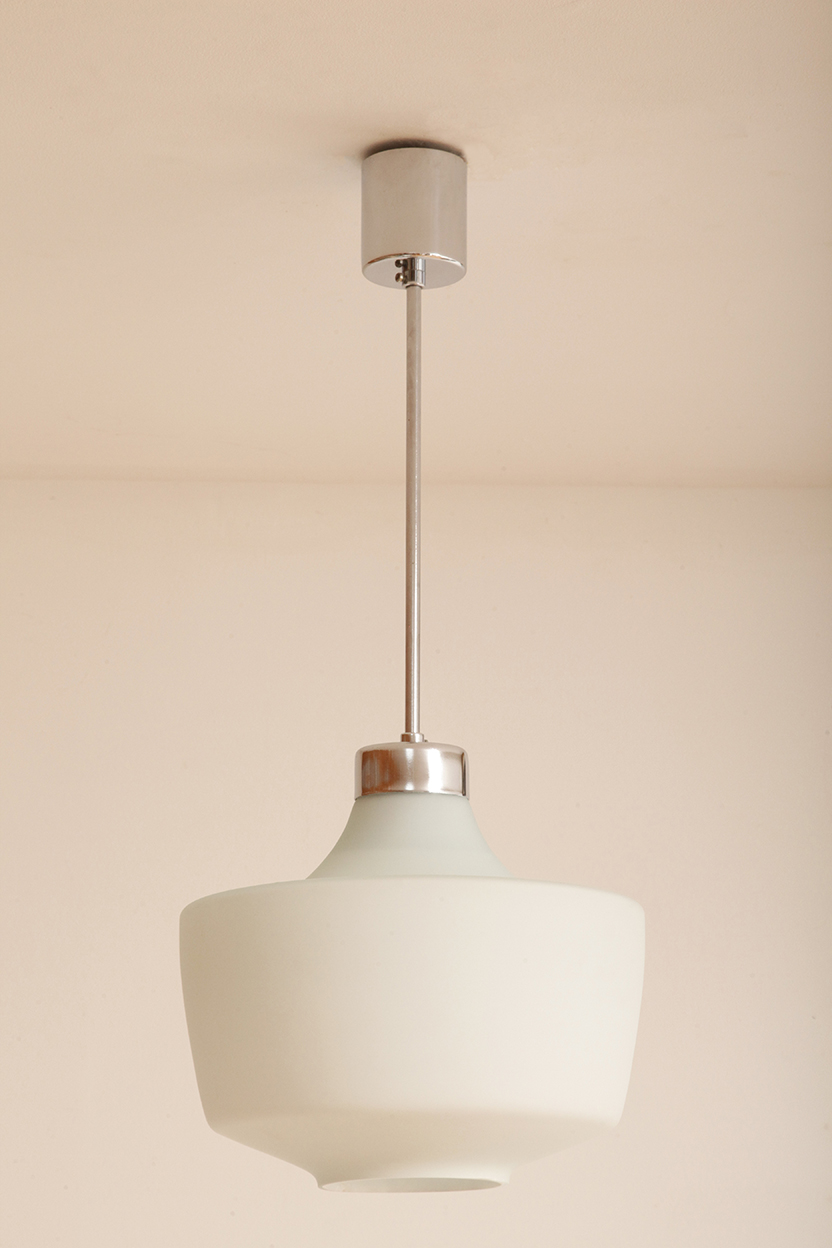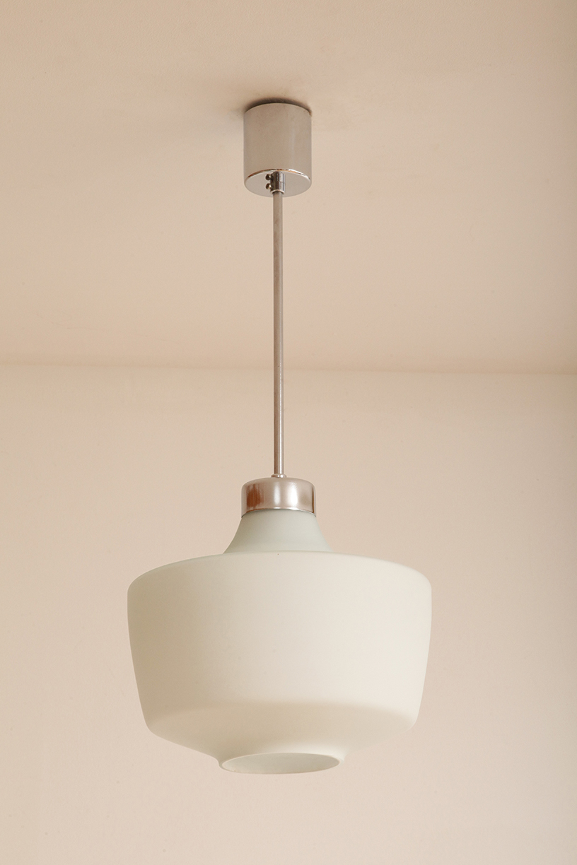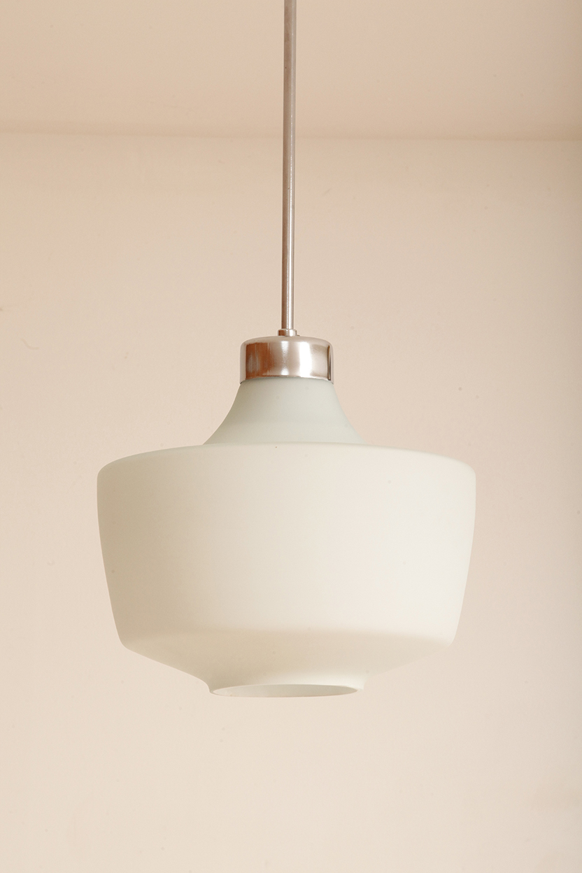 Czechosłowacka lampa sufitowa, złożona głownie z dość dużego szklanego klosza. A dodatkowo z metalowej w srebrzystości poczynionej sztycy na której wisi i chromowanej metalowej podsufitki i kapturka bezpośrednio i tuż nad samym kloszem umieszczonego.