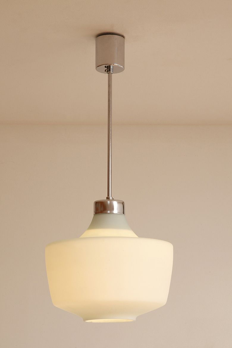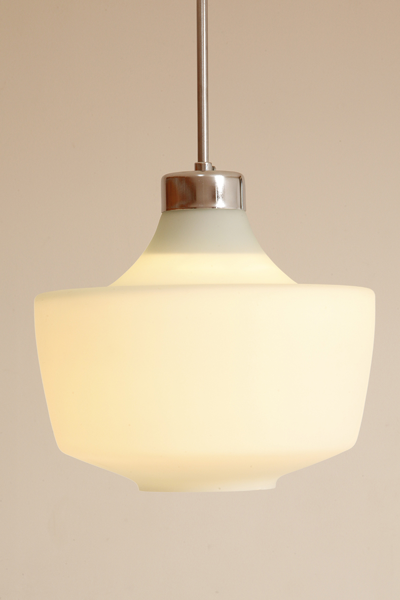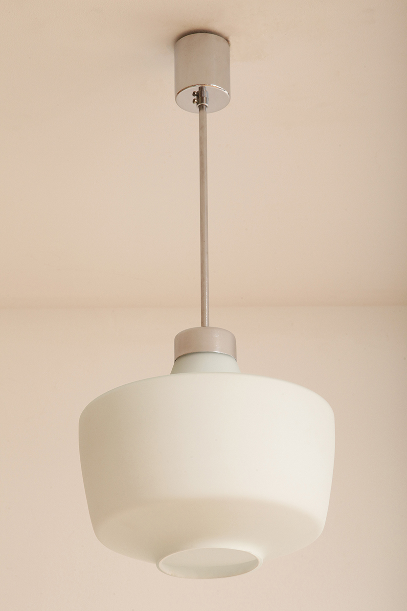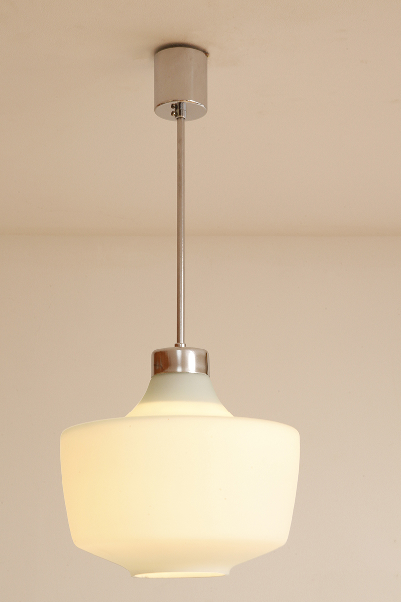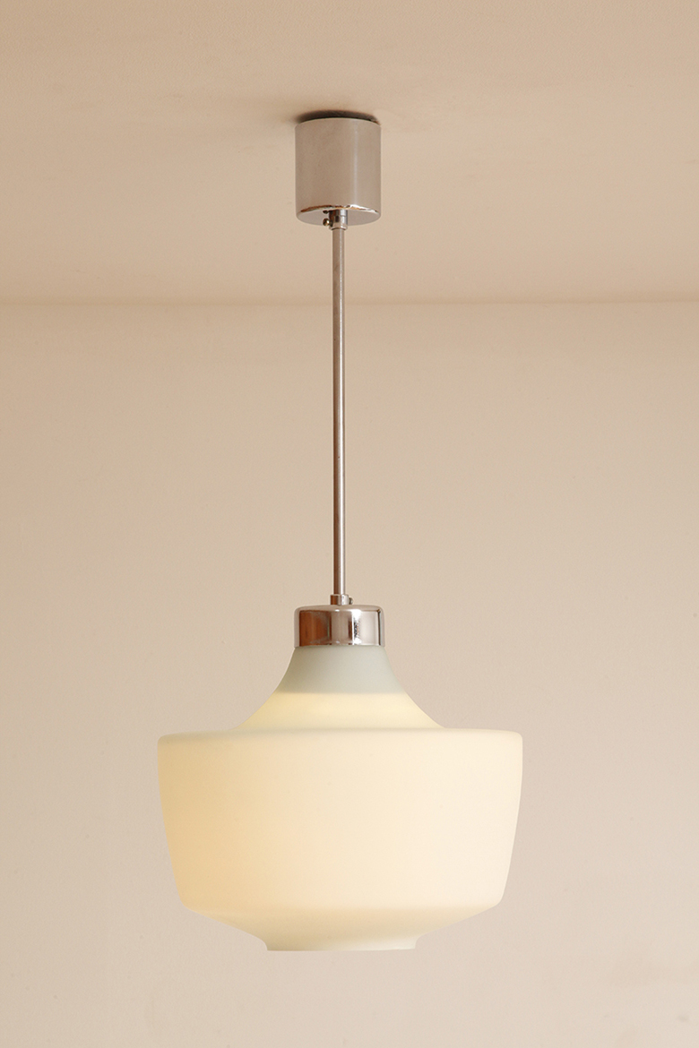 Czechosłowacka lampa sufitowa, złożona głownie z dość dużego szklanego klosza. A dodatkowo z metalowej w srebrzystości poczynionej sztycy na której wisi i chromowanej metalowej podsufitki i kapturka bezpośrednio i tuż nad samym kloszem umieszczonego.