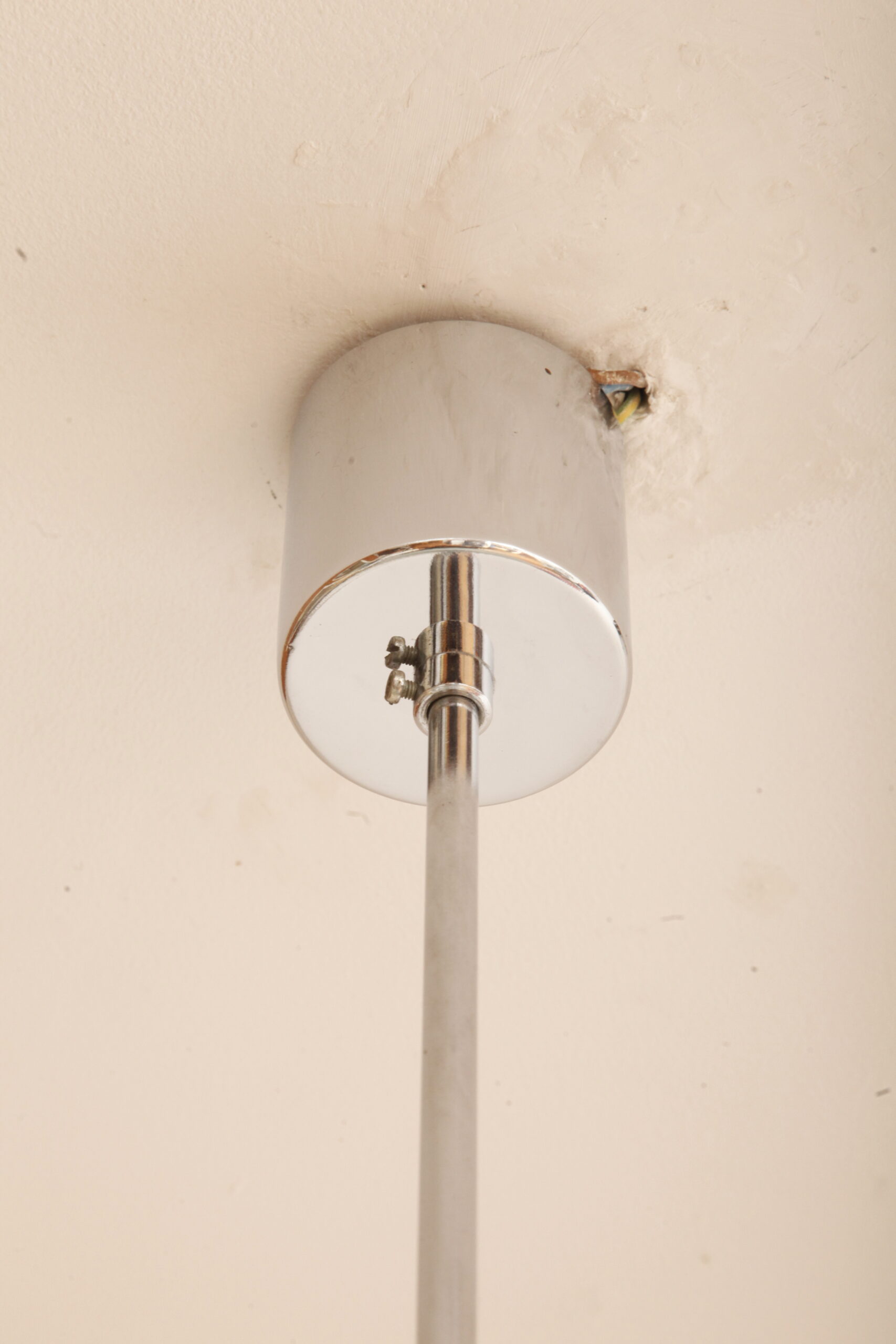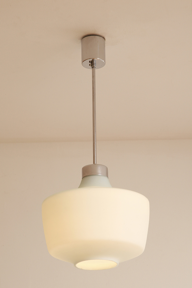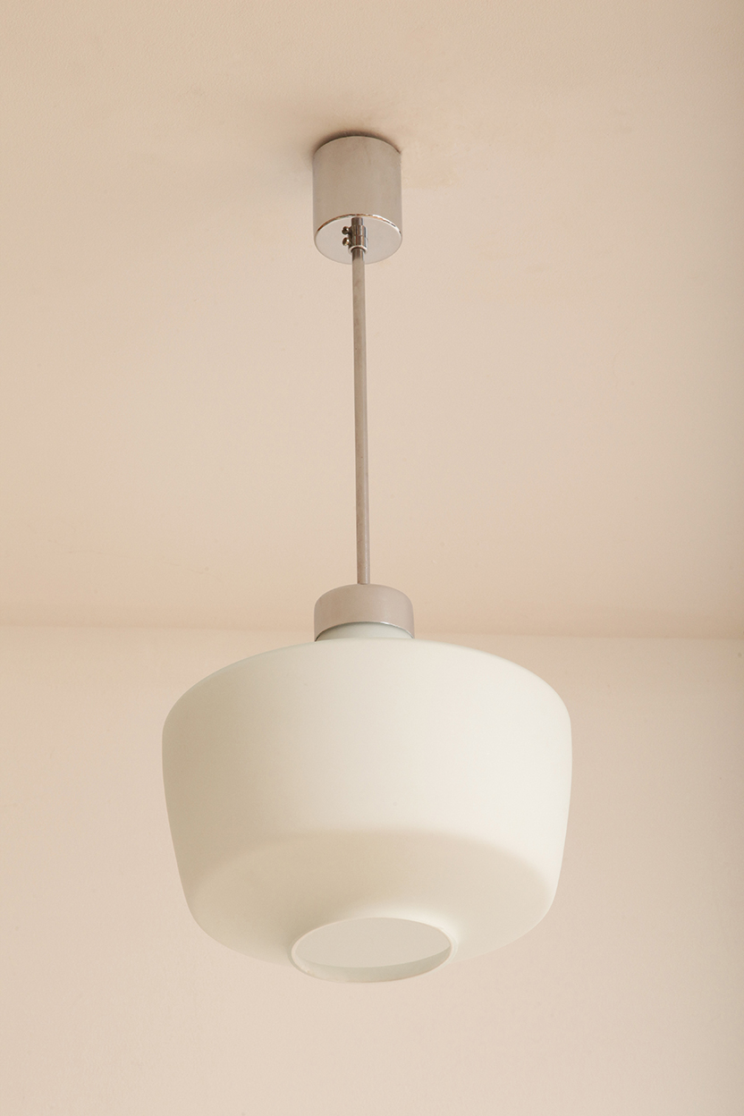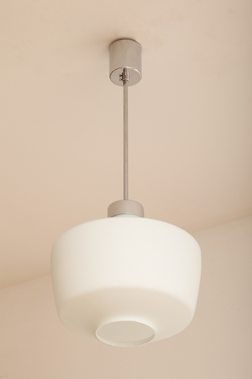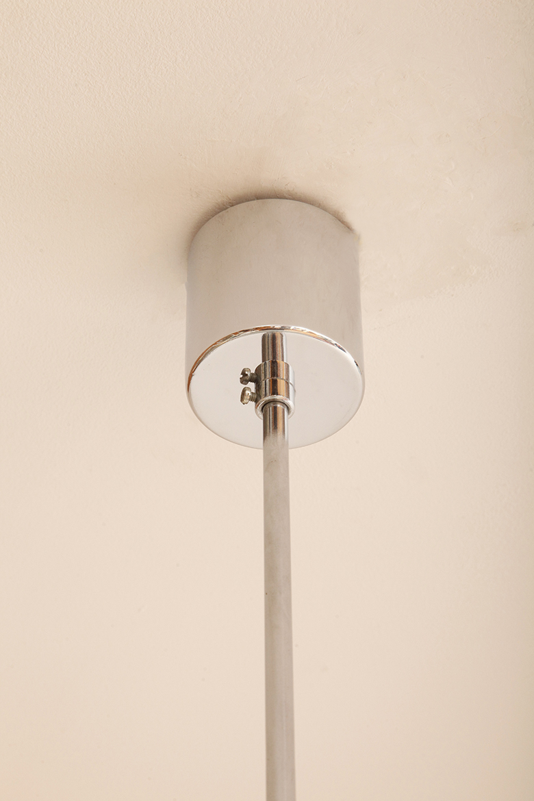 Czechosłowacka lampa sufitowa, złożona głownie z dość dużego szklanego klosza. A dodatkowo z metalowej w srebrzystości poczynionej sztycy na której wisi i chromowanej metalowej podsufitki i kapturka bezpośrednio i tuż nad samym kloszem umieszczonego.