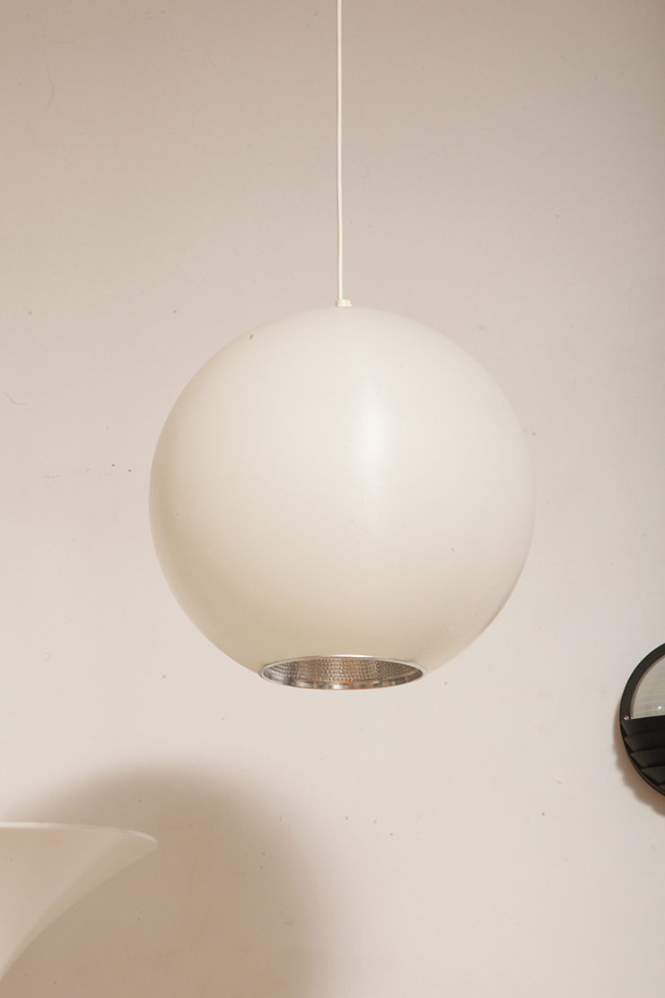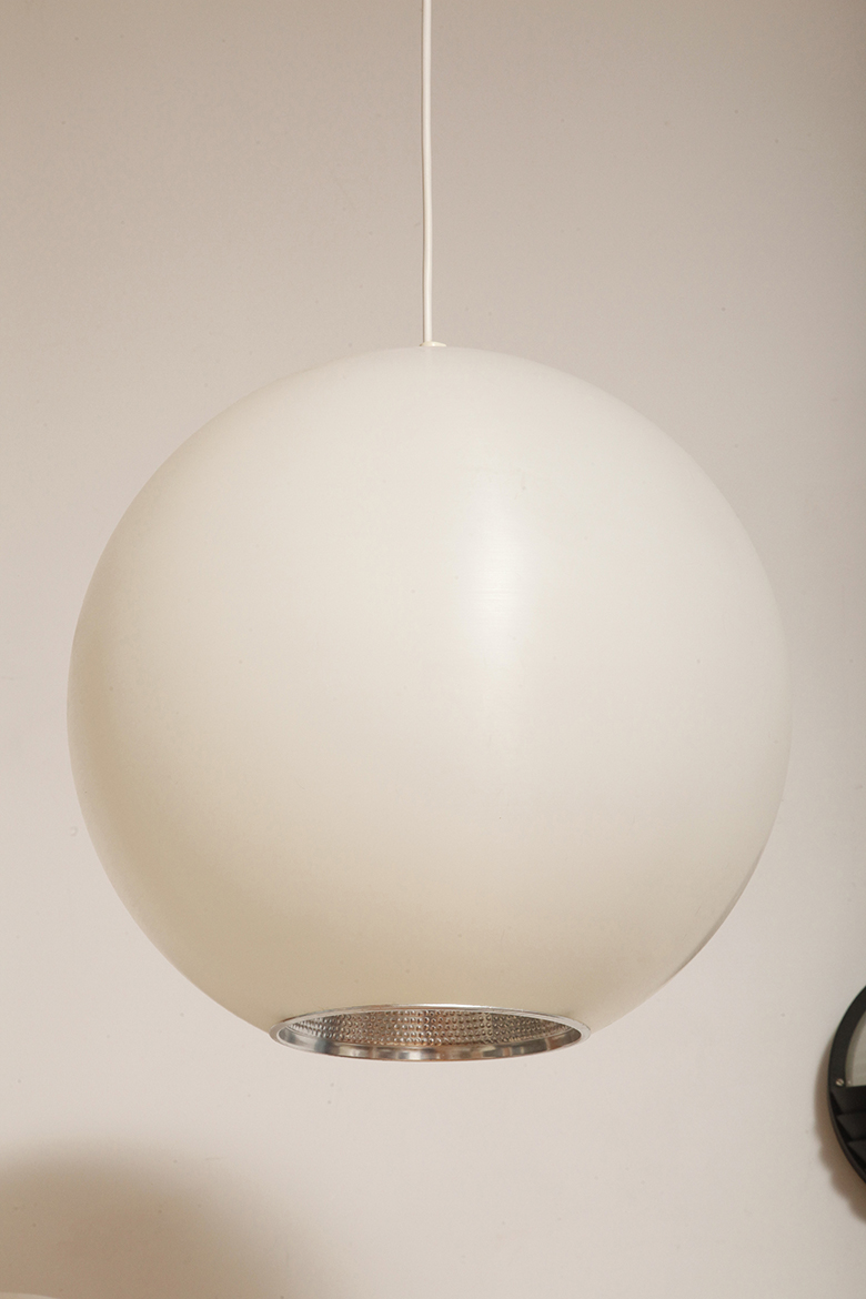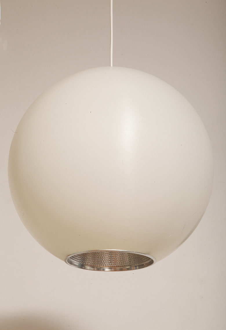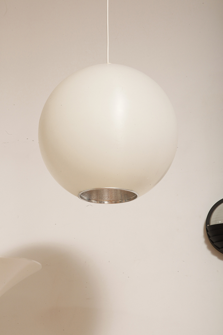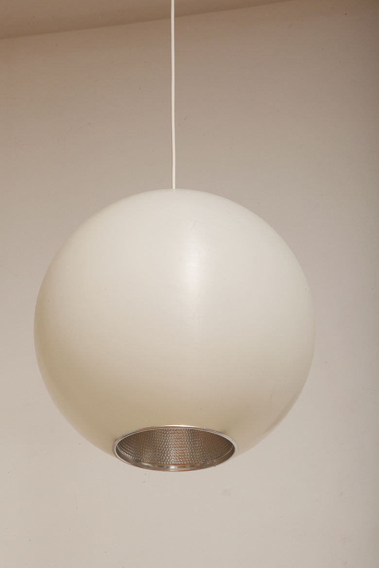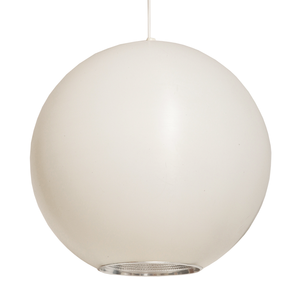 Strona główna » Sklep » Lampy » Jednopunktowa mlecznobiała duża (40 cm) lampa sufitowa z tworzywa w kształcie kuli z aluminiowym srebrnym odbłyśnikiem na dole, Philips, Holandia, lata 90.