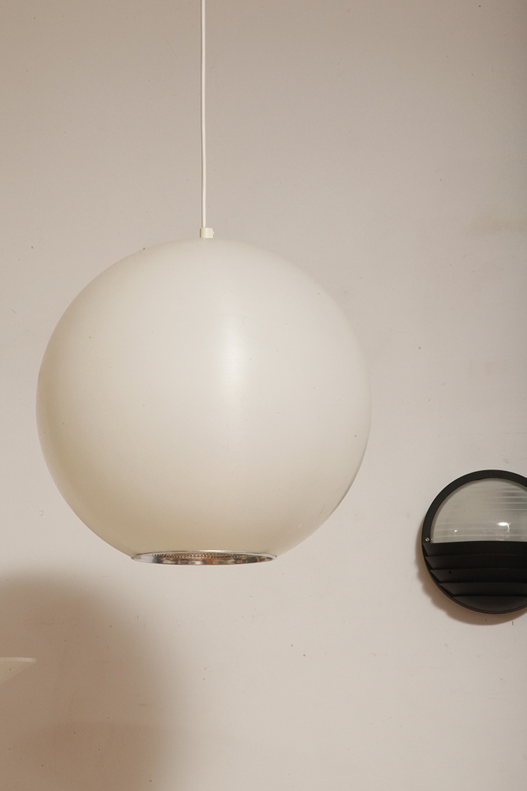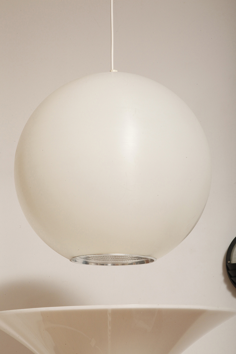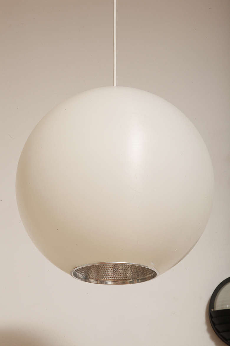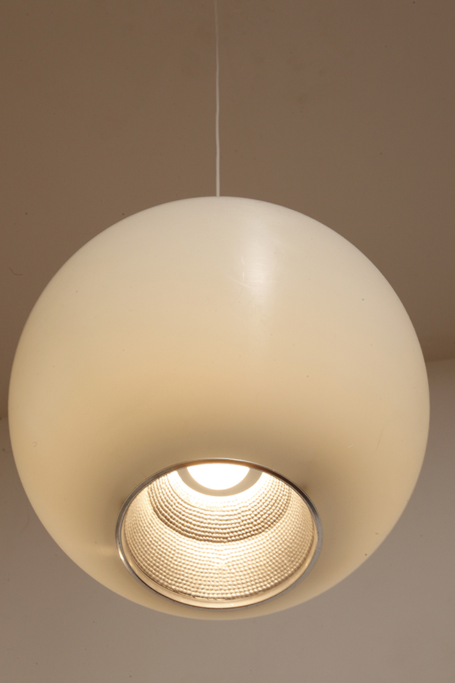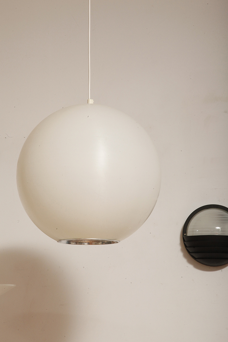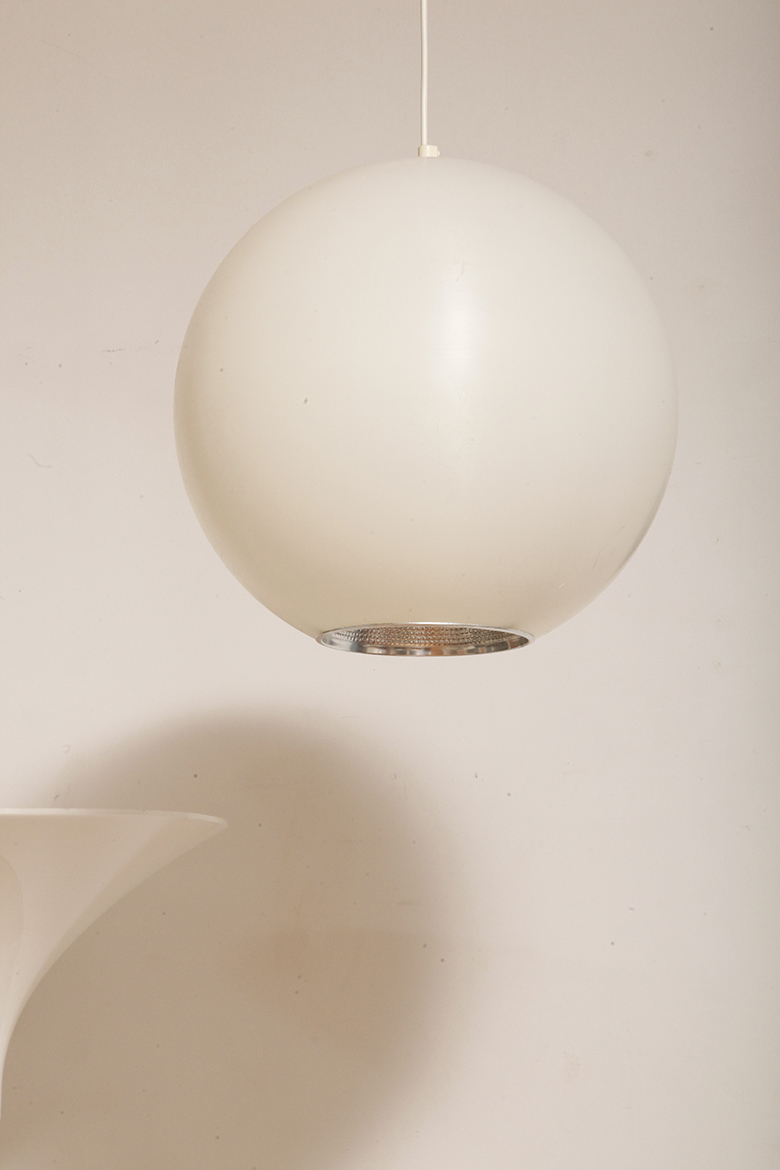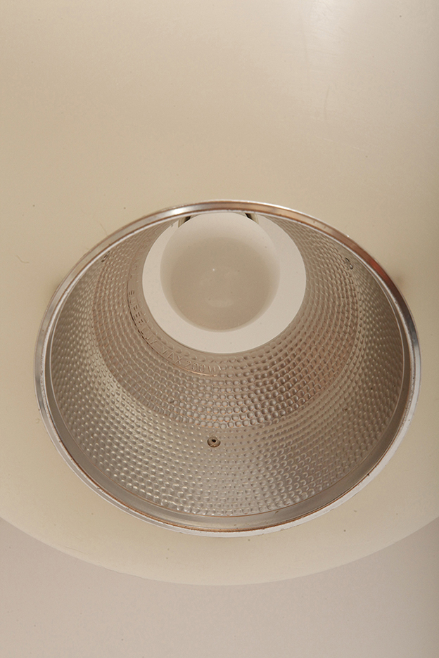 Strona główna » Sklep » Lampy » Jednopunktowa mlecznobiała duża (40 cm) lampa sufitowa z tworzywa w kształcie kuli z aluminiowym srebrnym odbłyśnikiem na dole, Philips, Holandia, lata 90.
