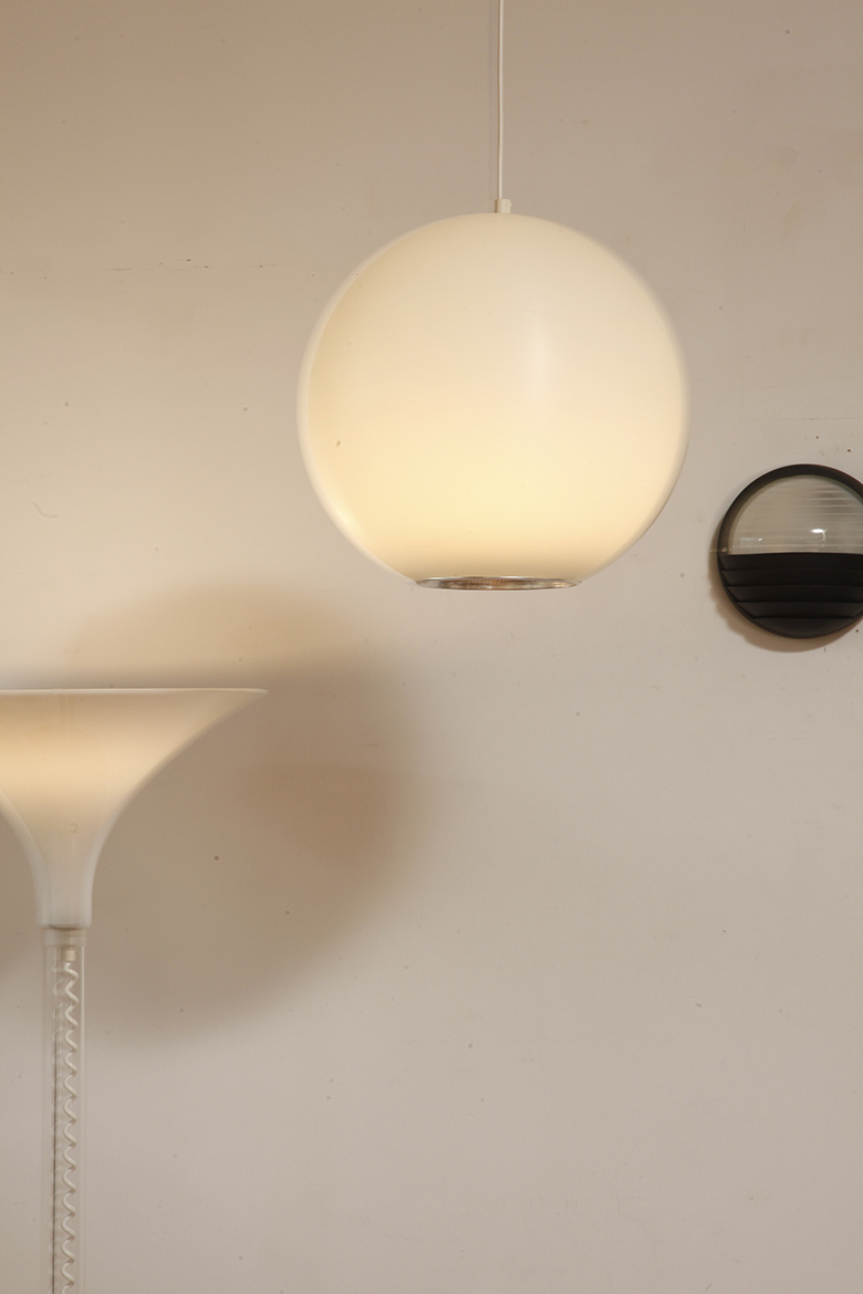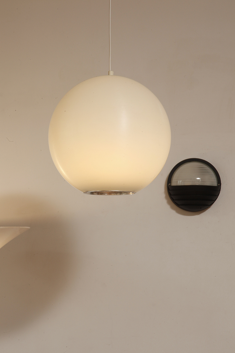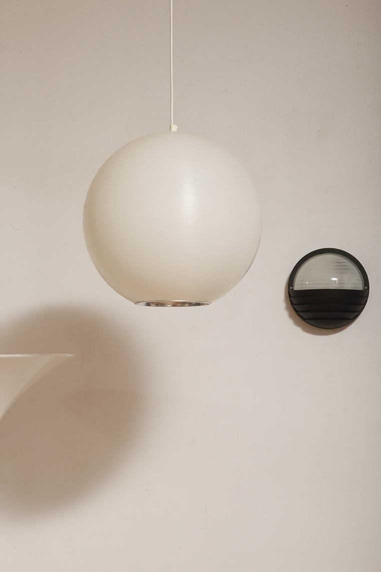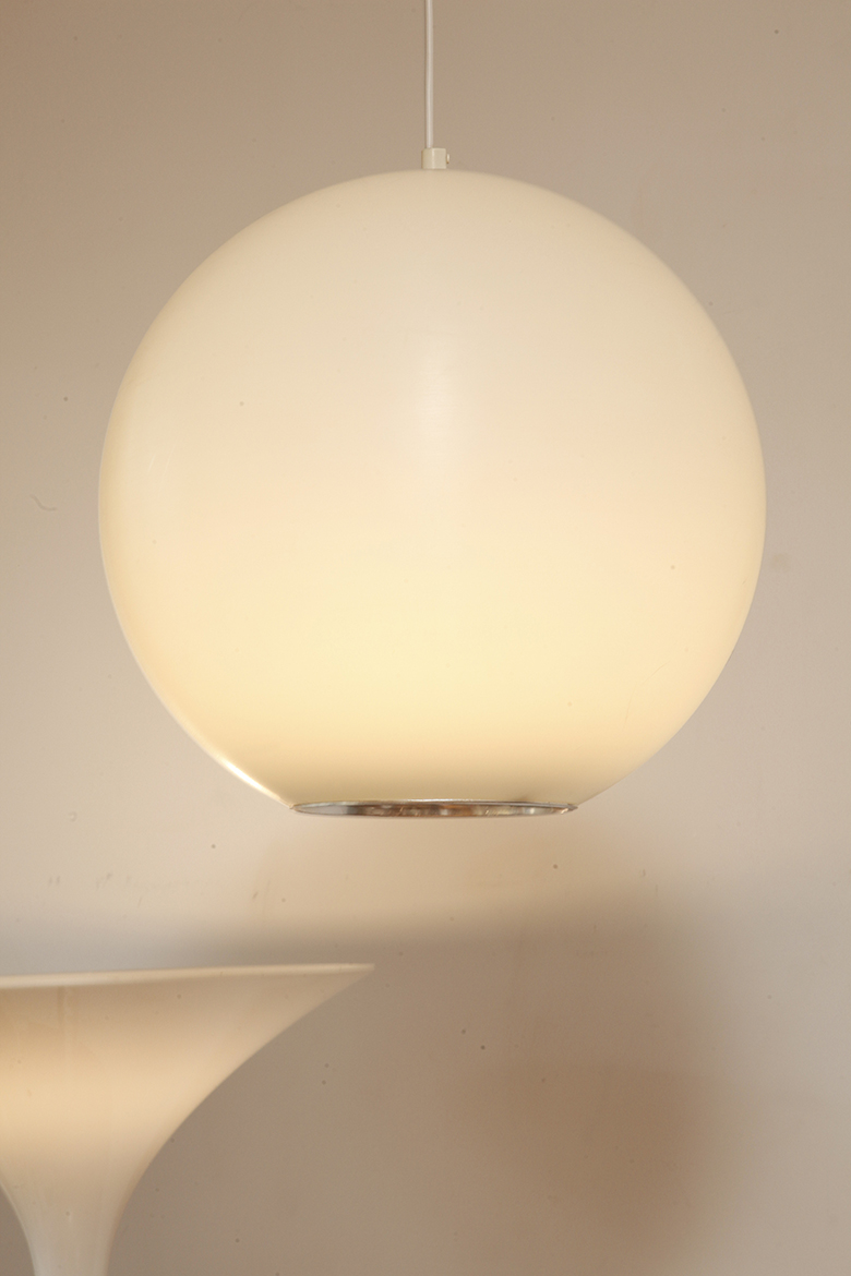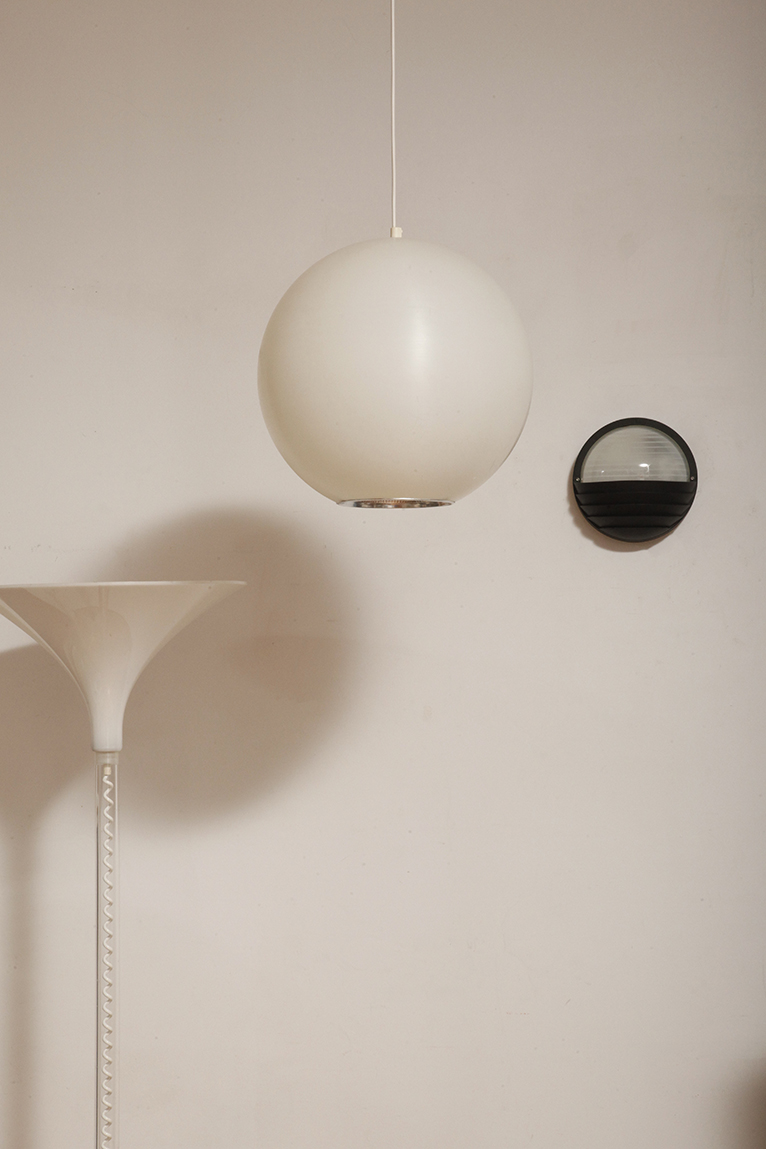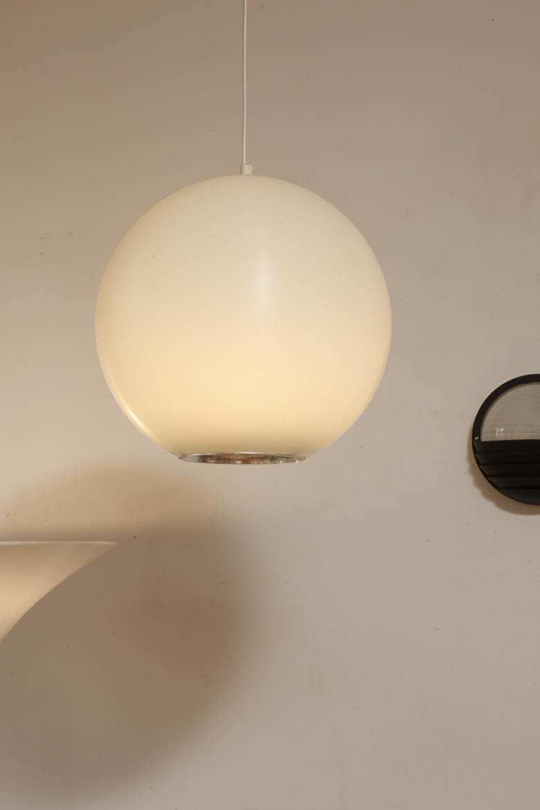 Strona główna » Sklep » Lampy » Jednopunktowa mlecznobiała duża (40 cm) lampa sufitowa z tworzywa w kształcie kuli z aluminiowym srebrnym odbłyśnikiem na dole, Philips, Holandia, lata 90.