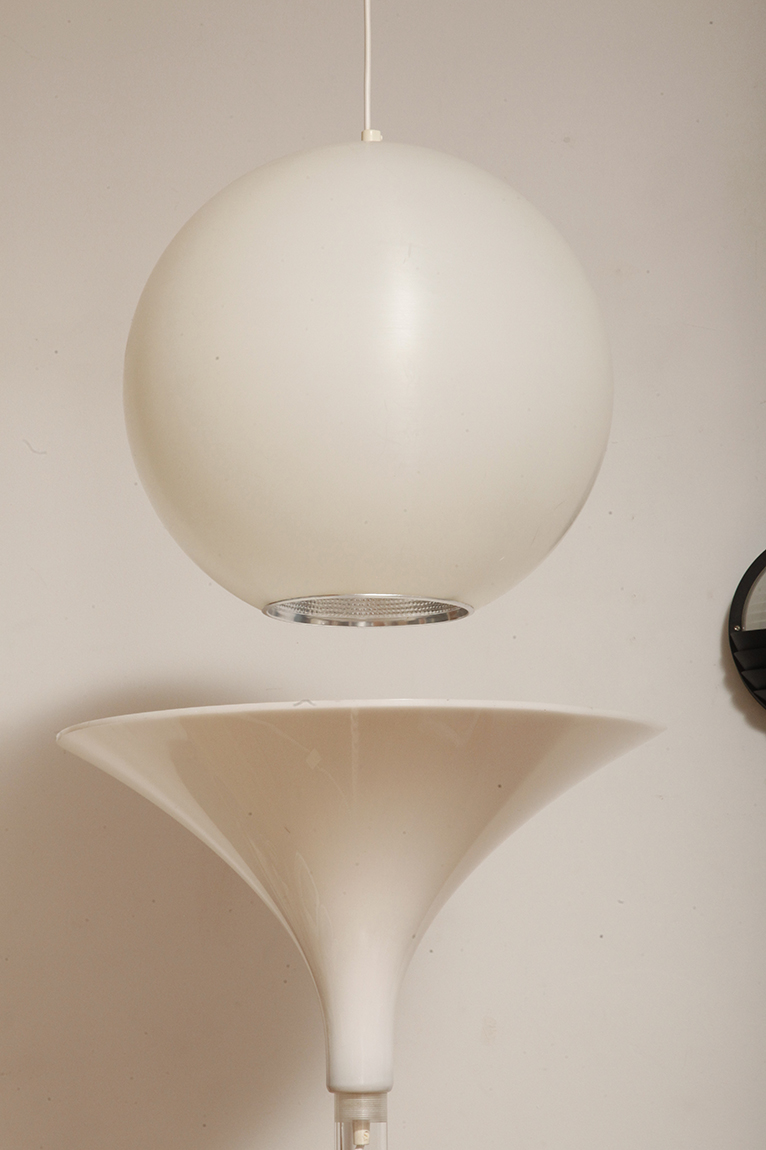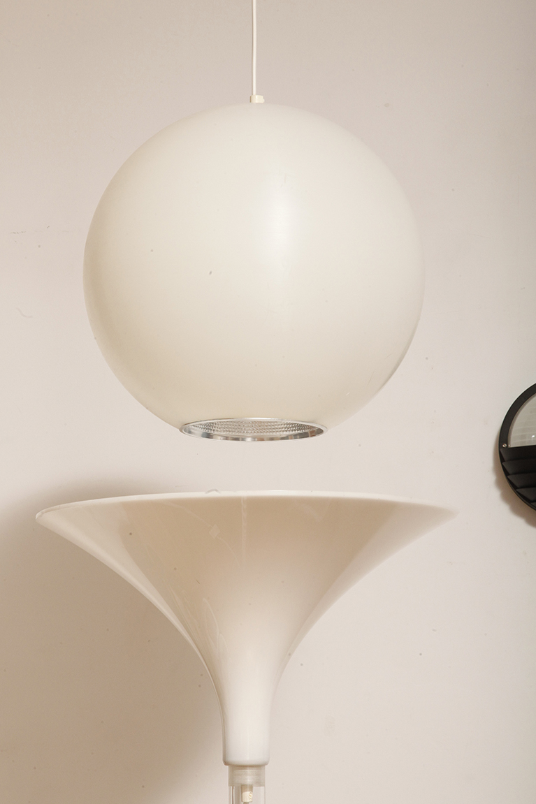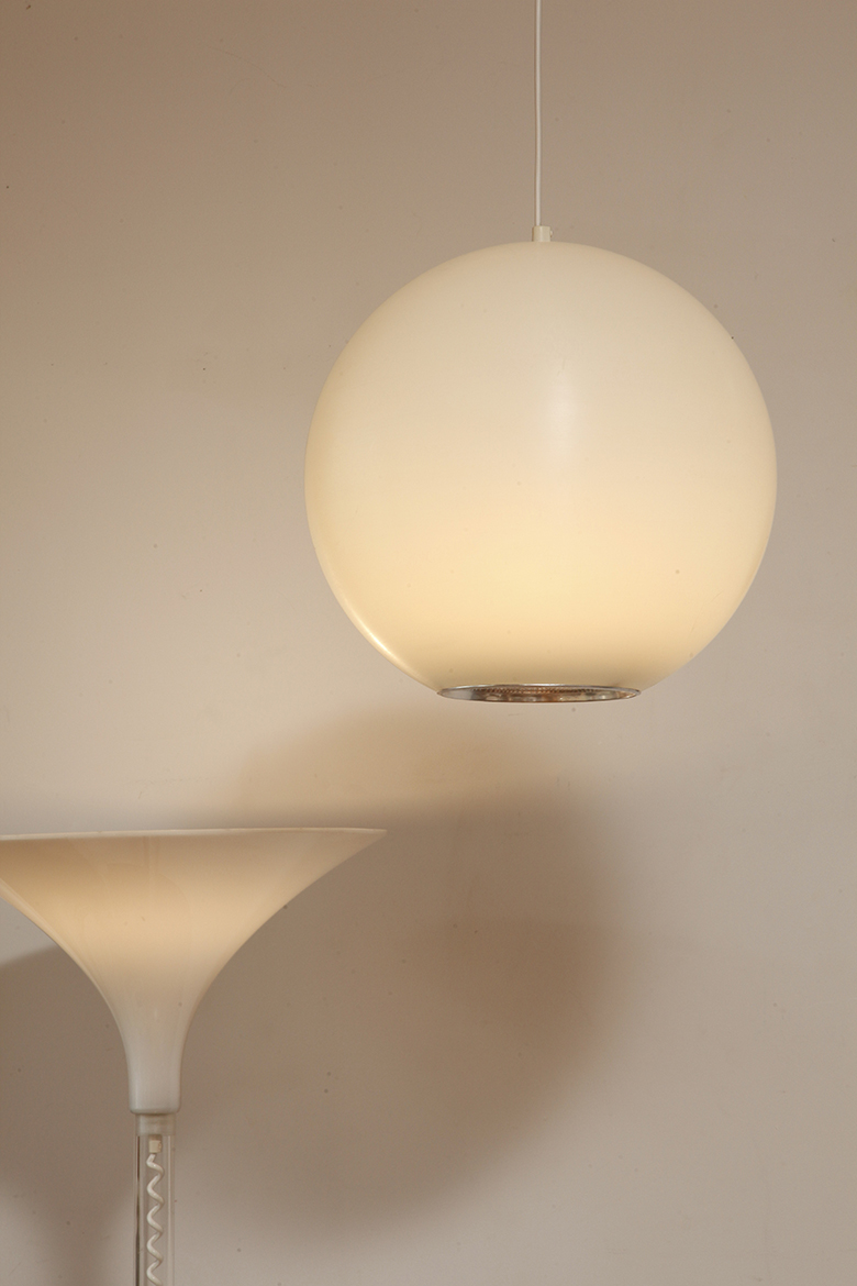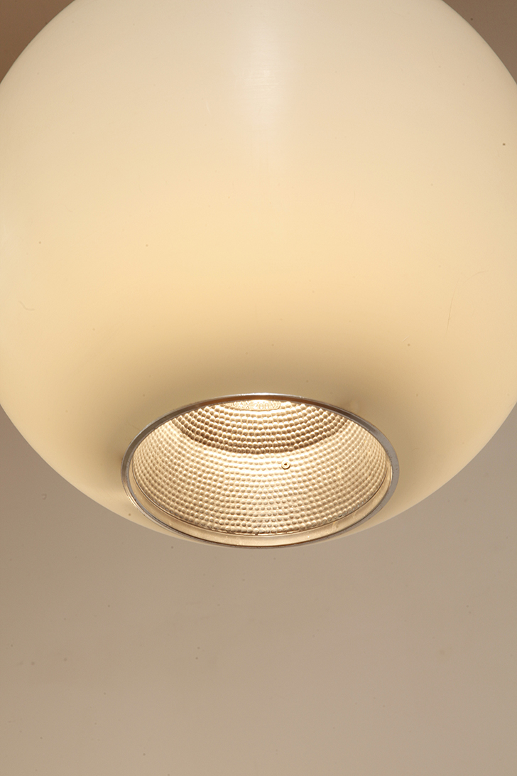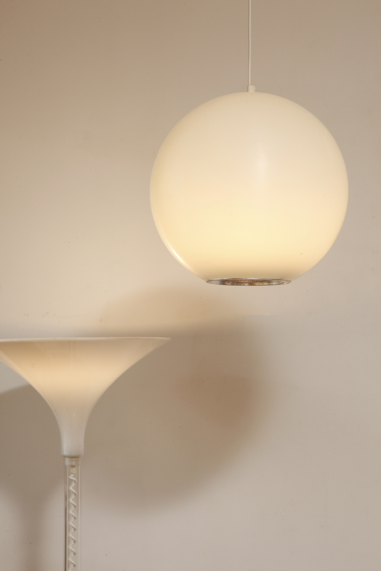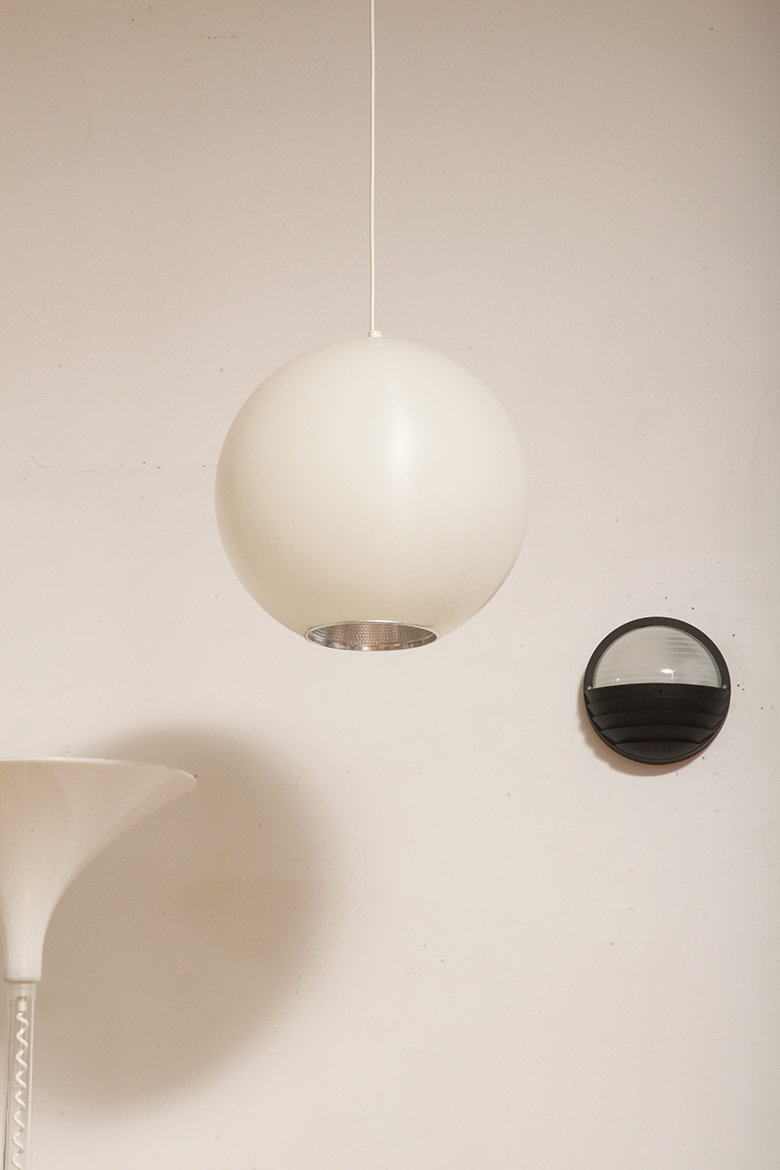 Strona główna » Sklep » Lampy » Jednopunktowa mlecznobiała duża (40 cm) lampa sufitowa z tworzywa w kształcie kuli z aluminiowym srebrnym odbłyśnikiem na dole, Philips, Holandia, lata 90.