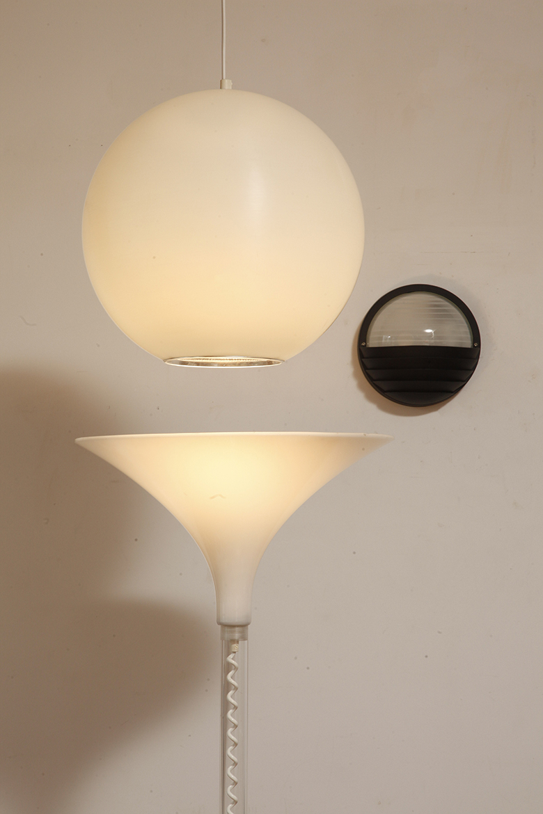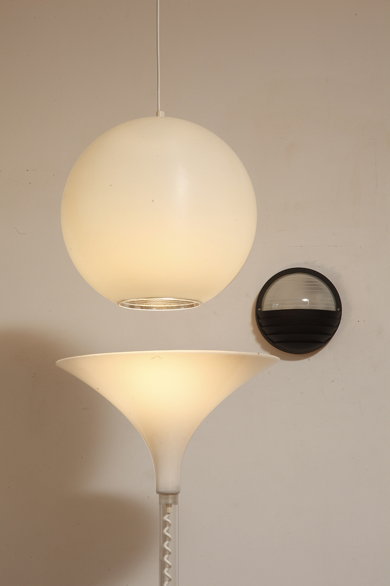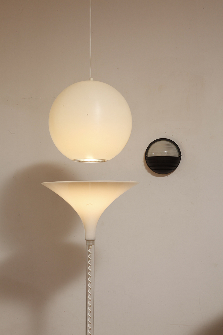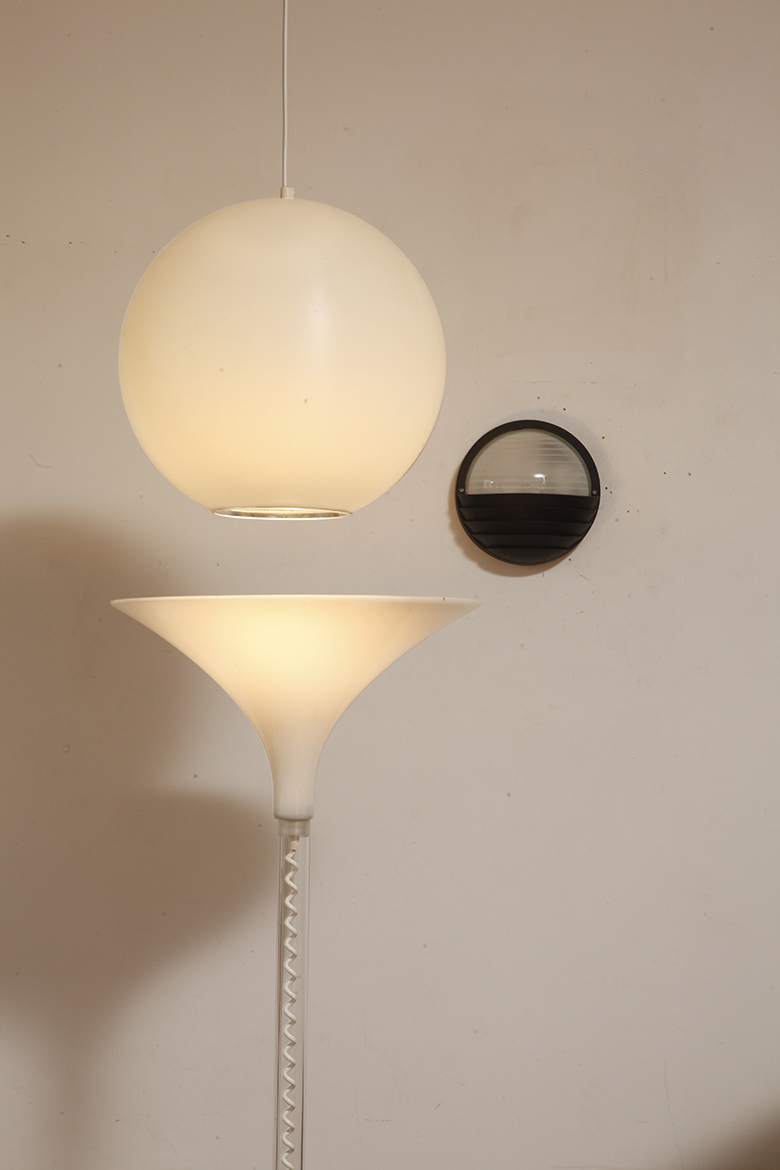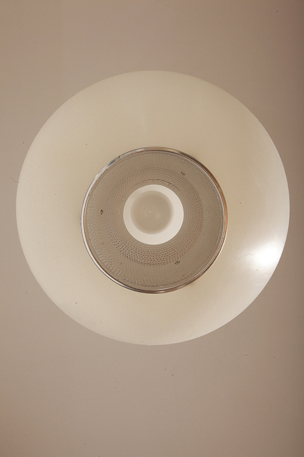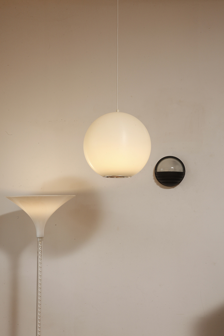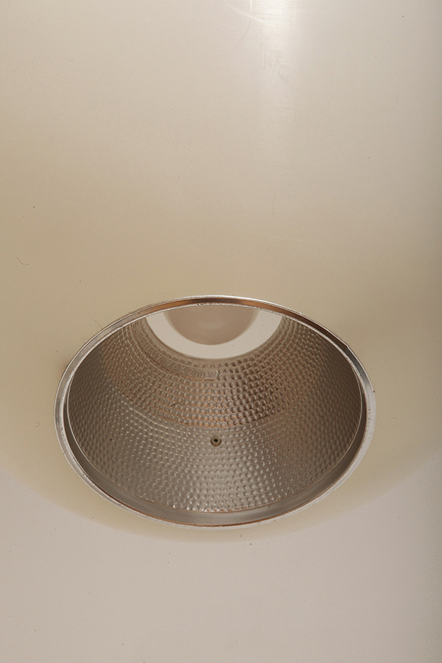 Strona główna » Sklep » Lampy » Jednopunktowa mlecznobiała duża (40 cm) lampa sufitowa z tworzywa w kształcie kuli z aluminiowym srebrnym odbłyśnikiem na dole, Philips, Holandia, lata 90.