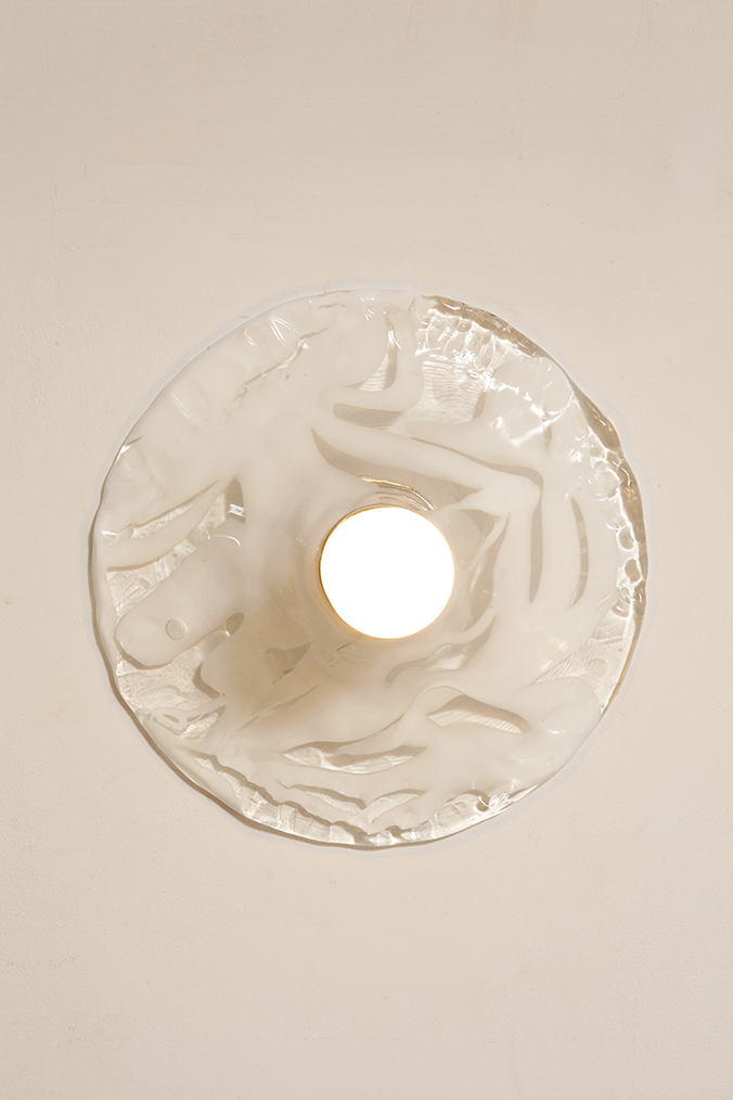 Mleczno białe szkło Murano w niesymetryczne wzory z przestrzeniami prześwitującymi.