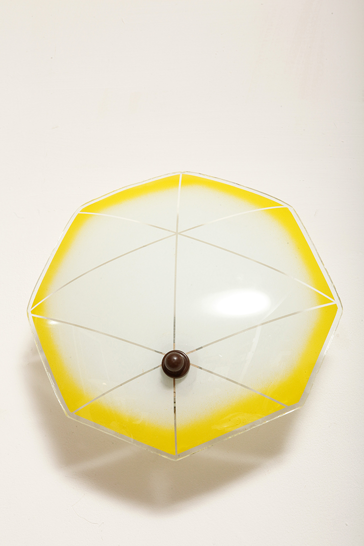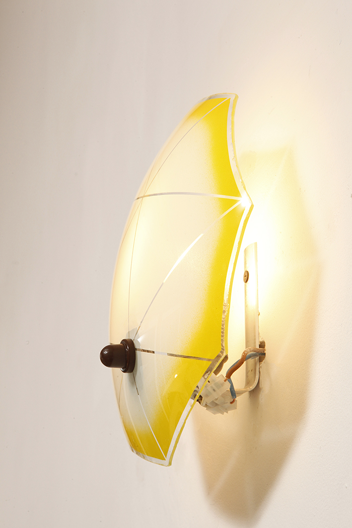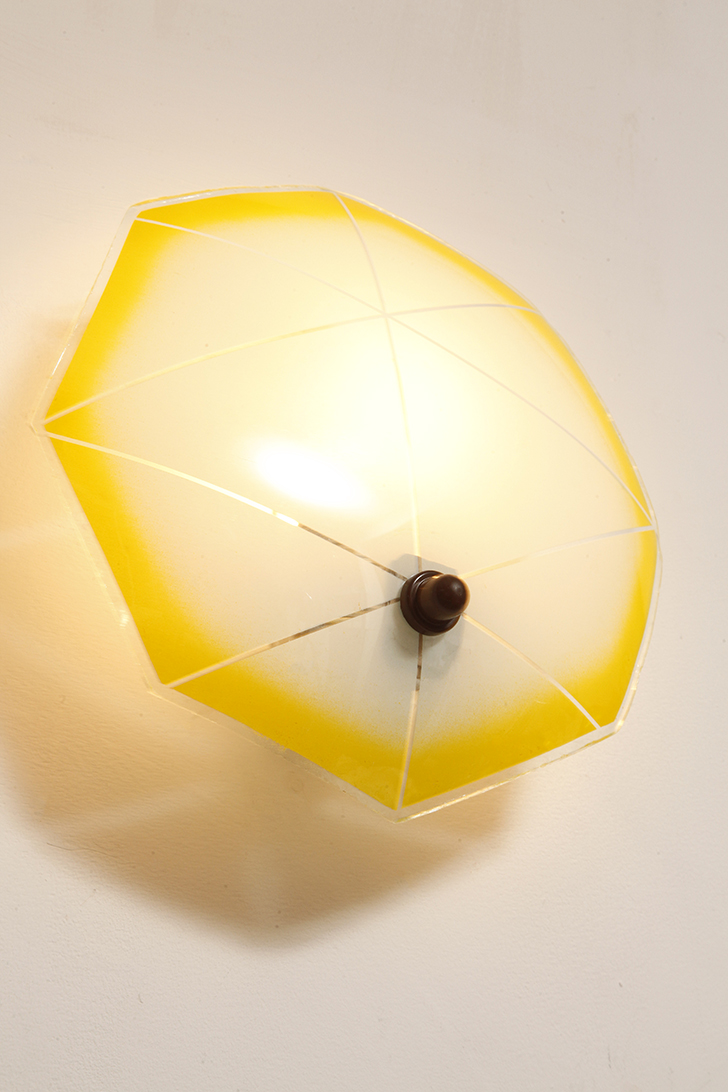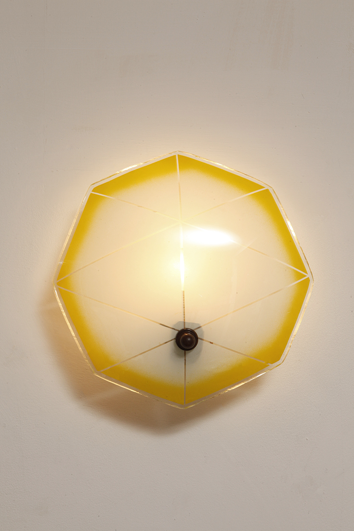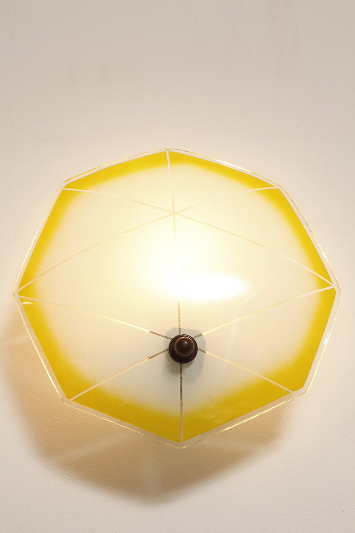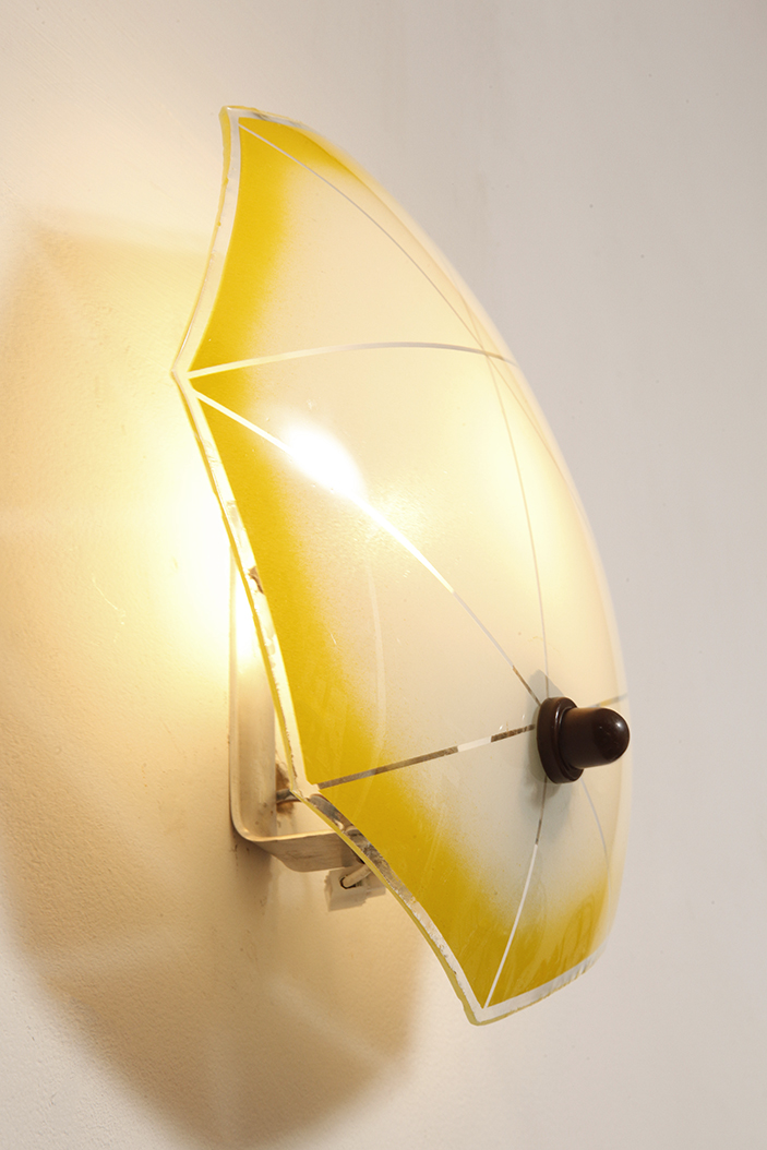 Efektowny mleczno żółty szklany polski kinkiet. Jeden z bardziej charakterystycznych elementów wystroju mieszkania w Polsce Ludowej.