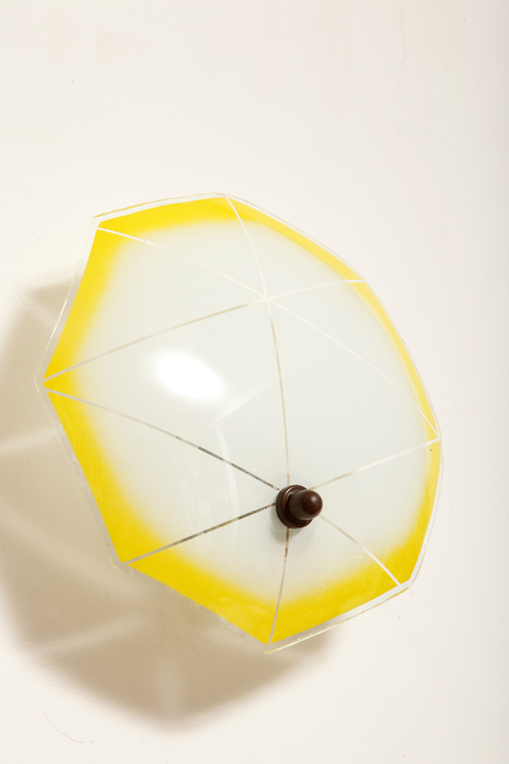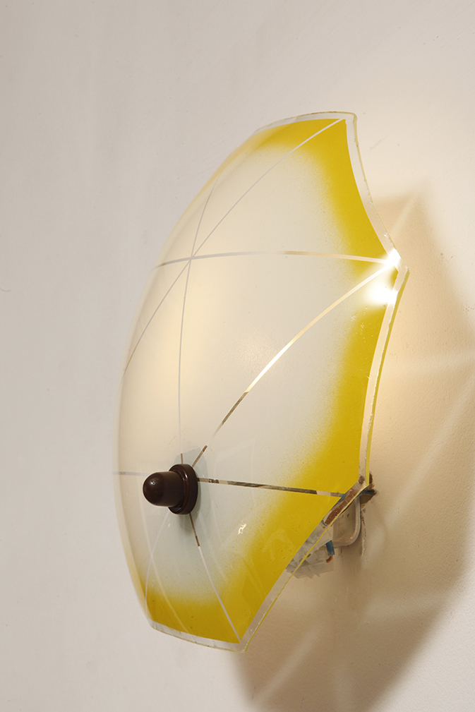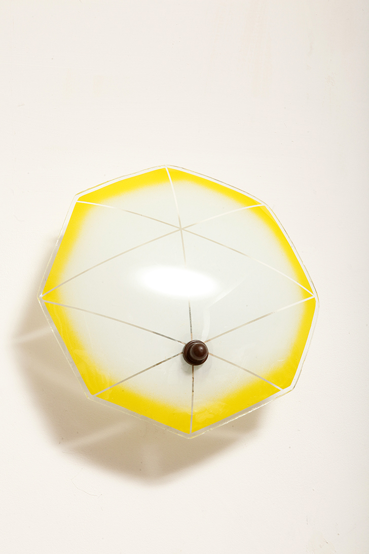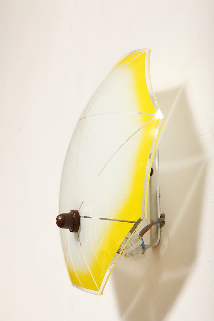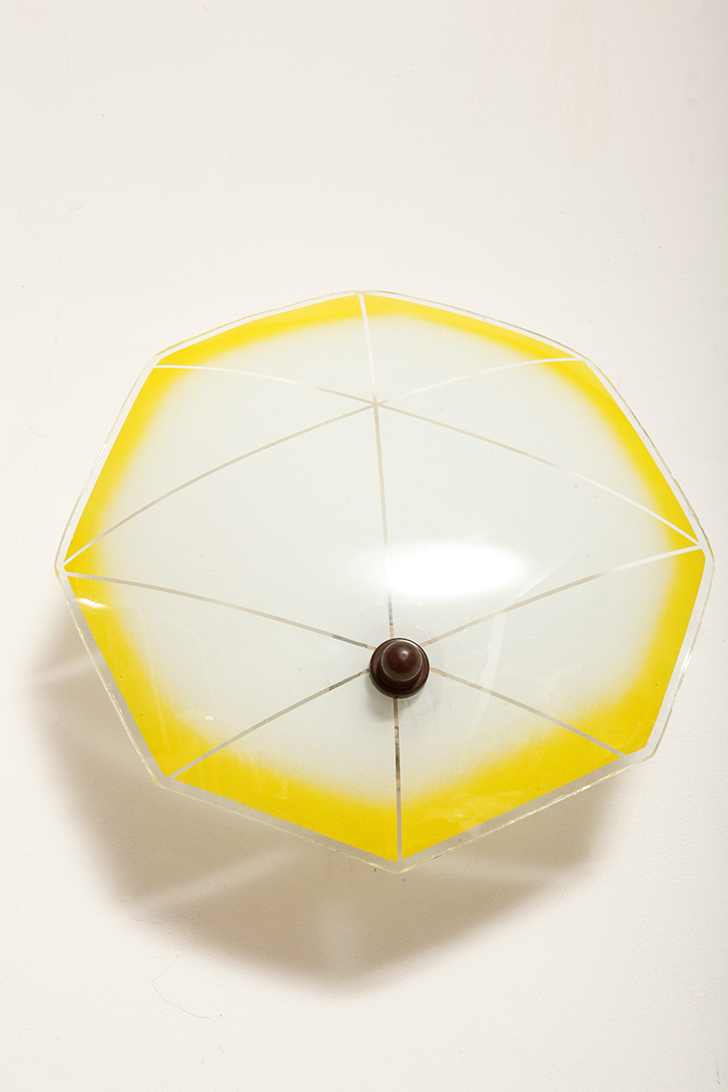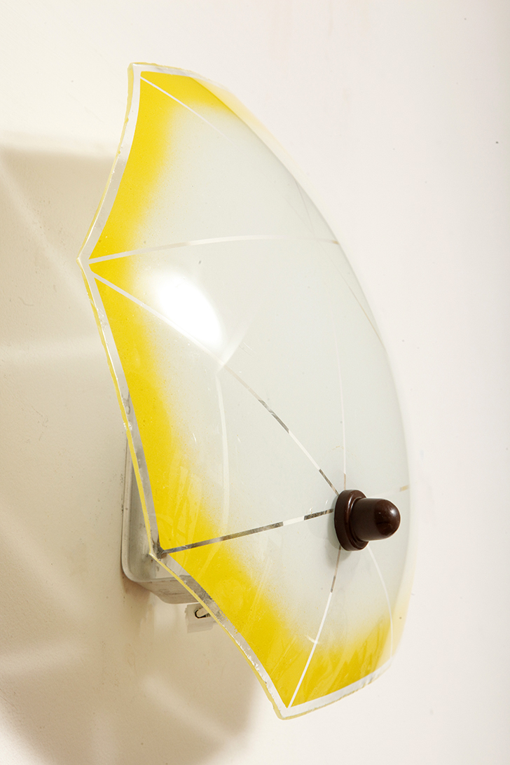 Efektowny mleczno żółty szklany polski kinkiet. Jeden z bardziej charakterystycznych elementów wystroju mieszkania w Polsce Ludowej.