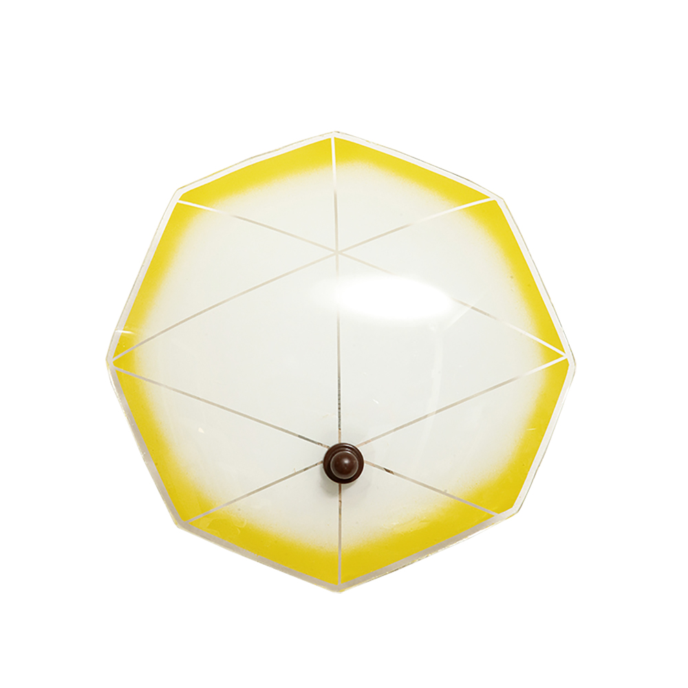 Jednopunktowa mlecznobiała szklana lampa ścienna/kinkiet z żółtym obrysem i symetrycznym ażurowym wzorem, Polska, lata 60.