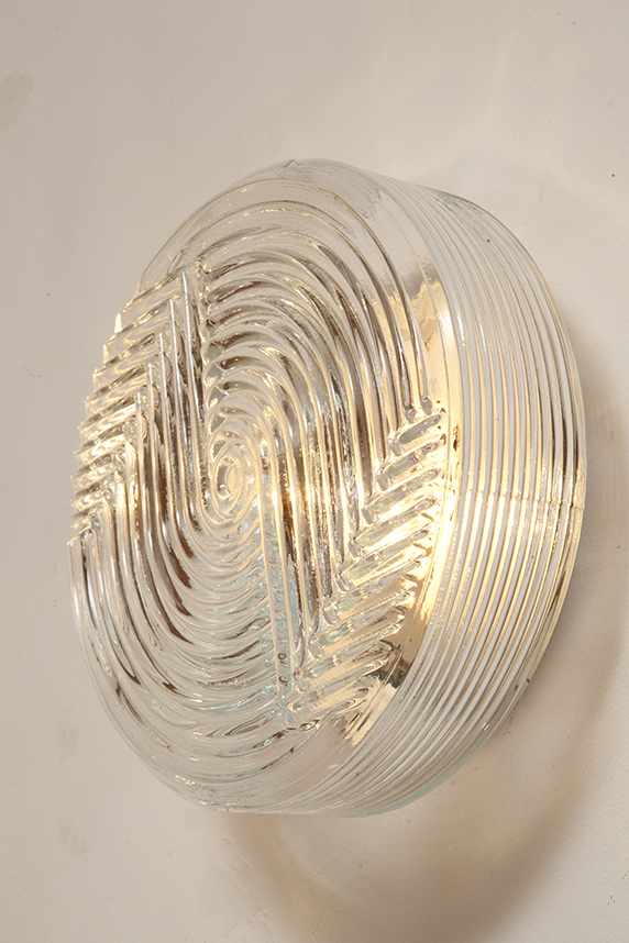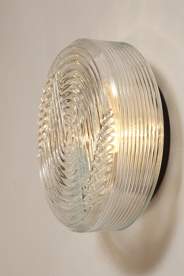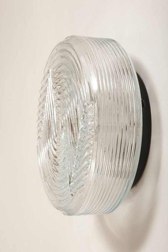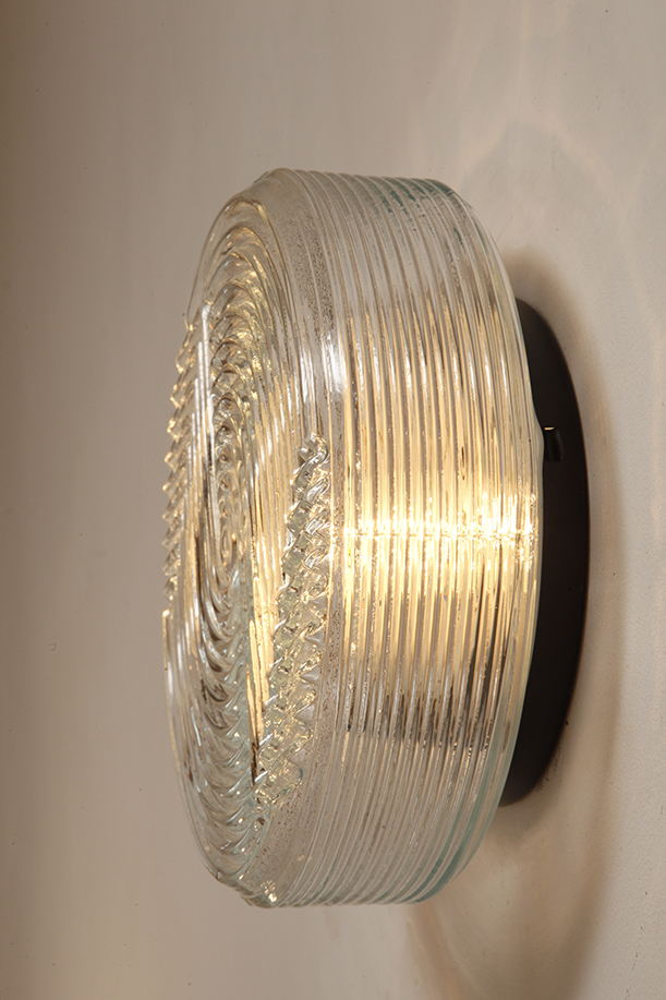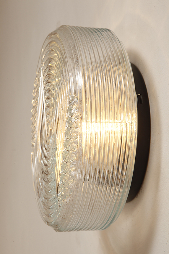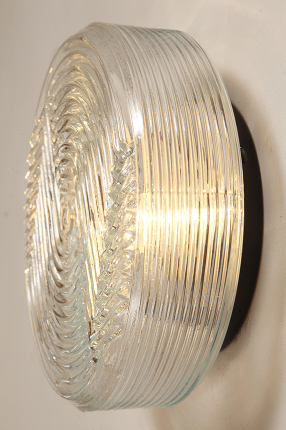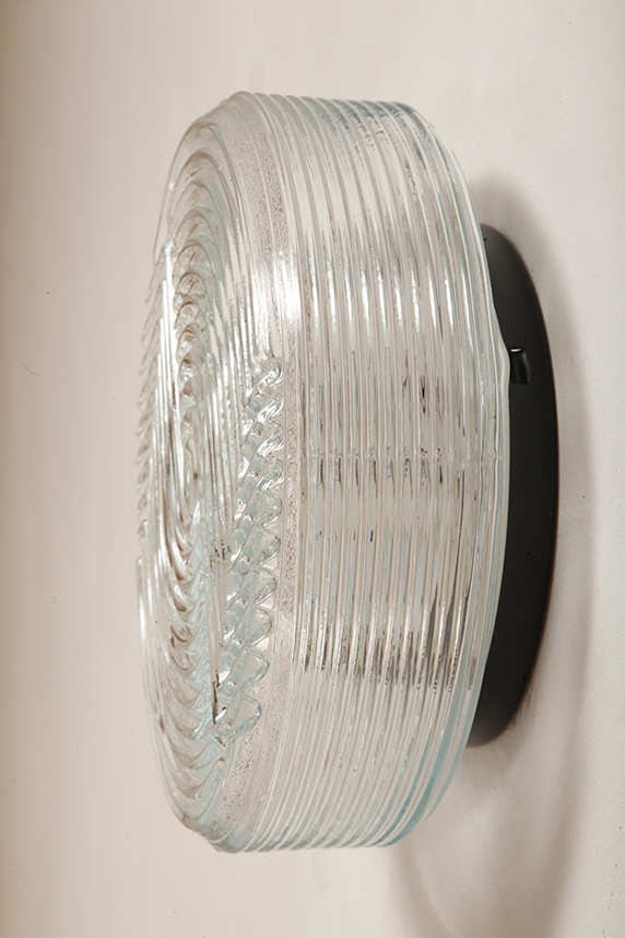 Jednopunktowa okrągła lampa ścienna/kinkiet ze szklanym reliefowym przeźroczystym kloszem w stylu Art Deco w czarnej metalowej oprawie, firma Prisma, Włochy, lata 80.