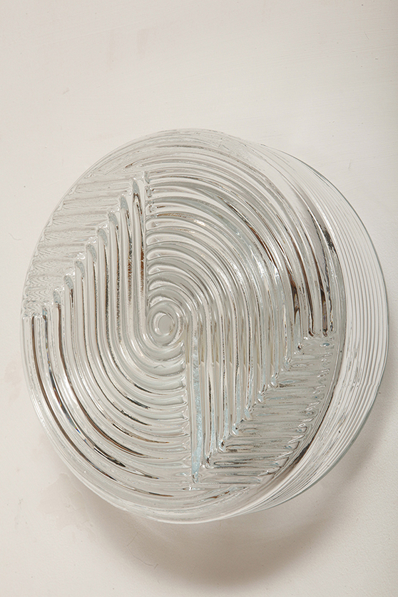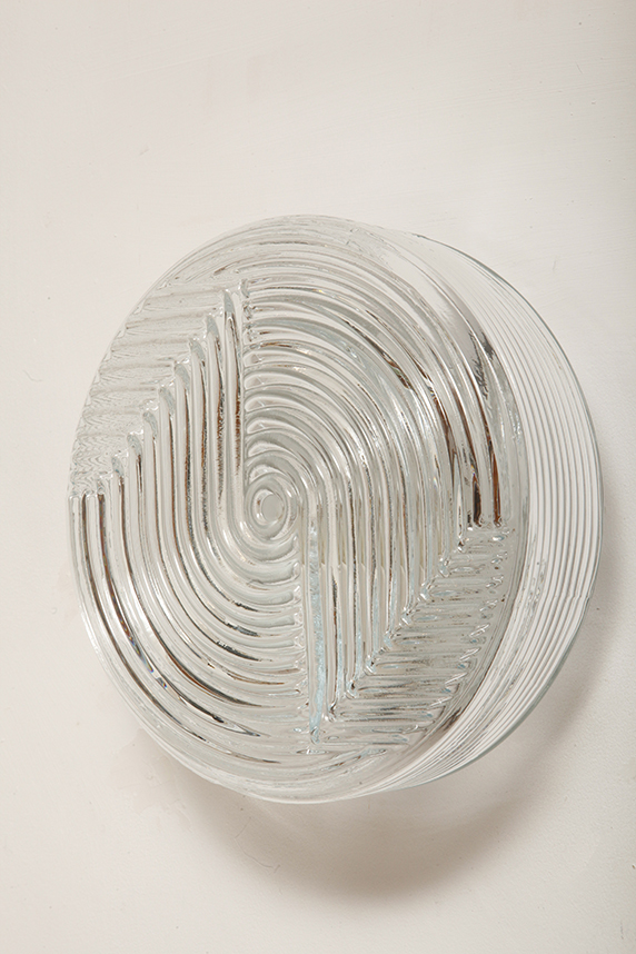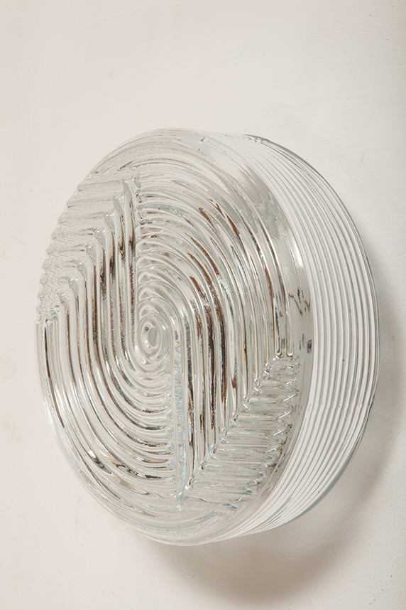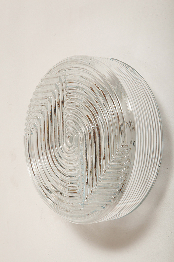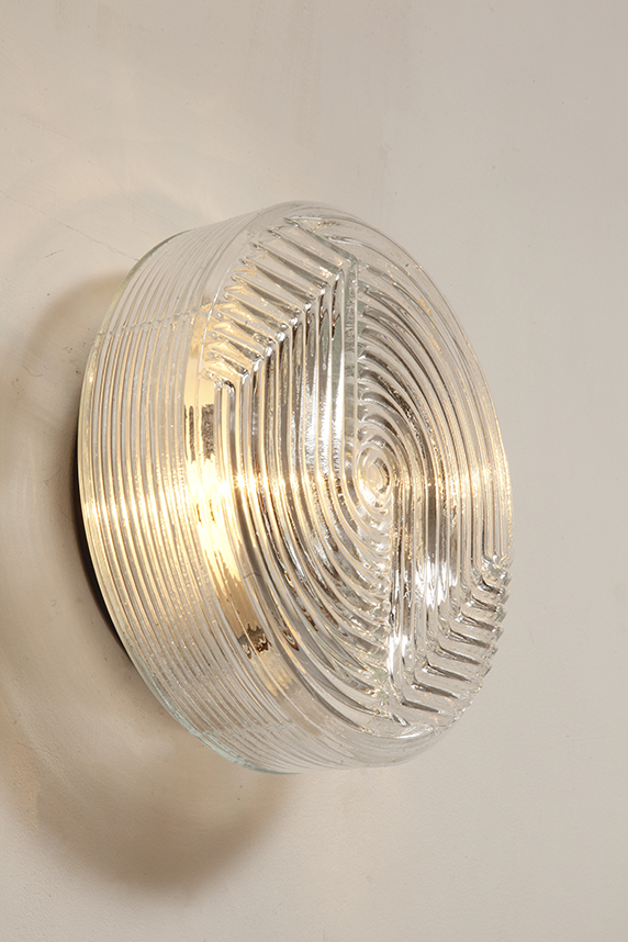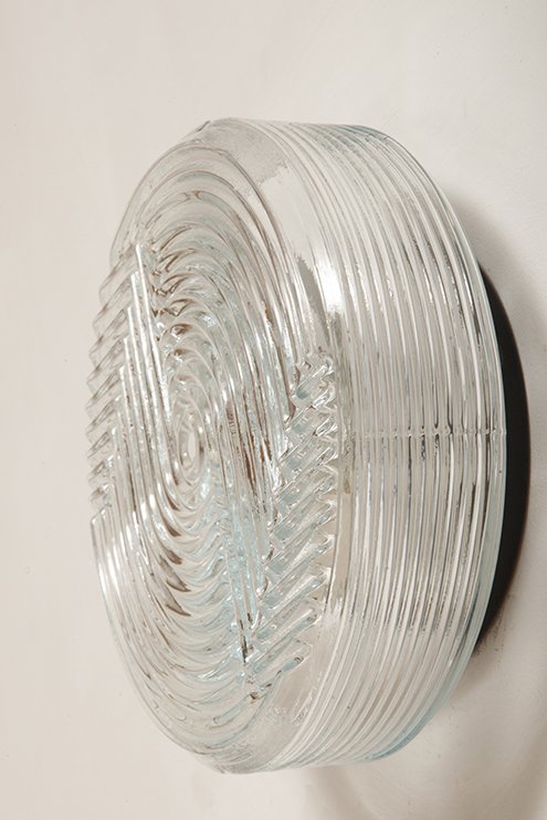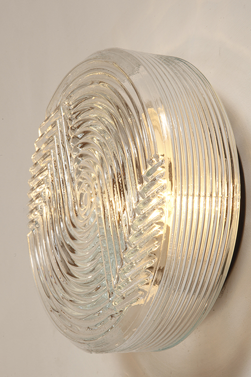 Jednopunktowa okrągła lampa ścienna/kinkiet ze szklanym reliefowym przeźroczystym kloszem w stylu Art Deco w czarnej metalowej oprawie, firma Prisma, Włochy, lata 80.