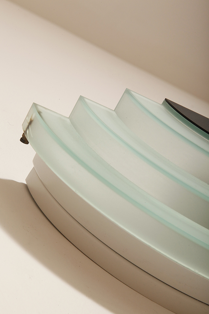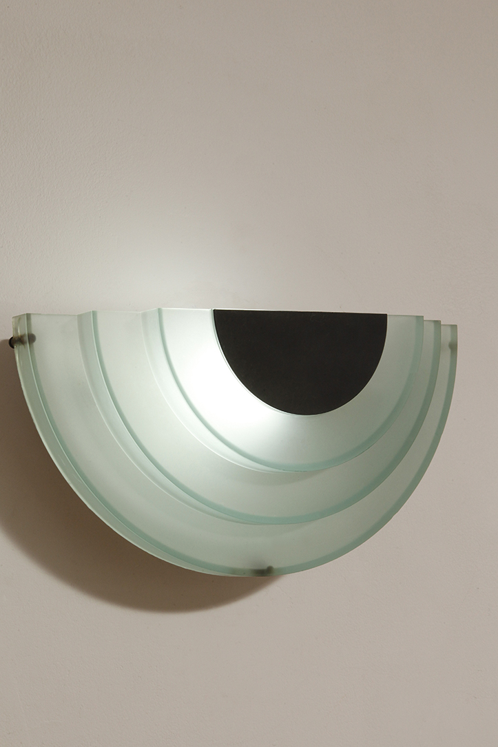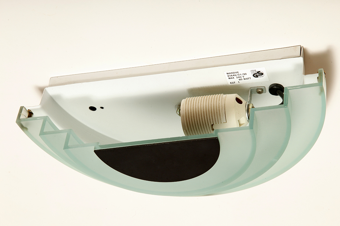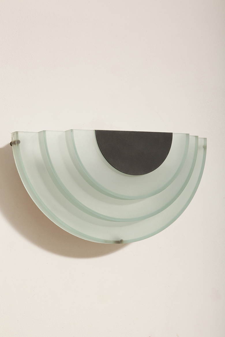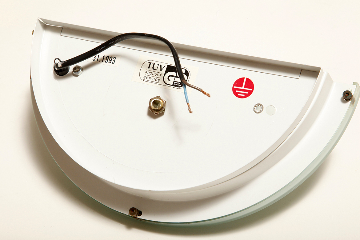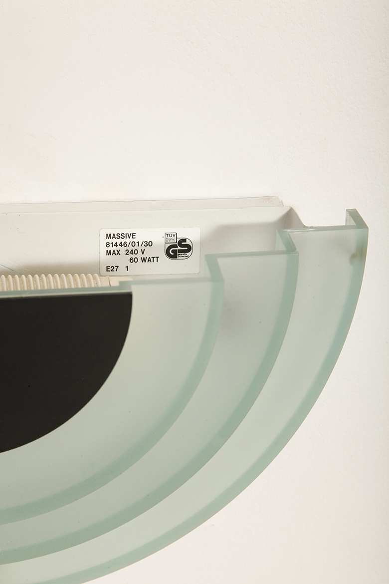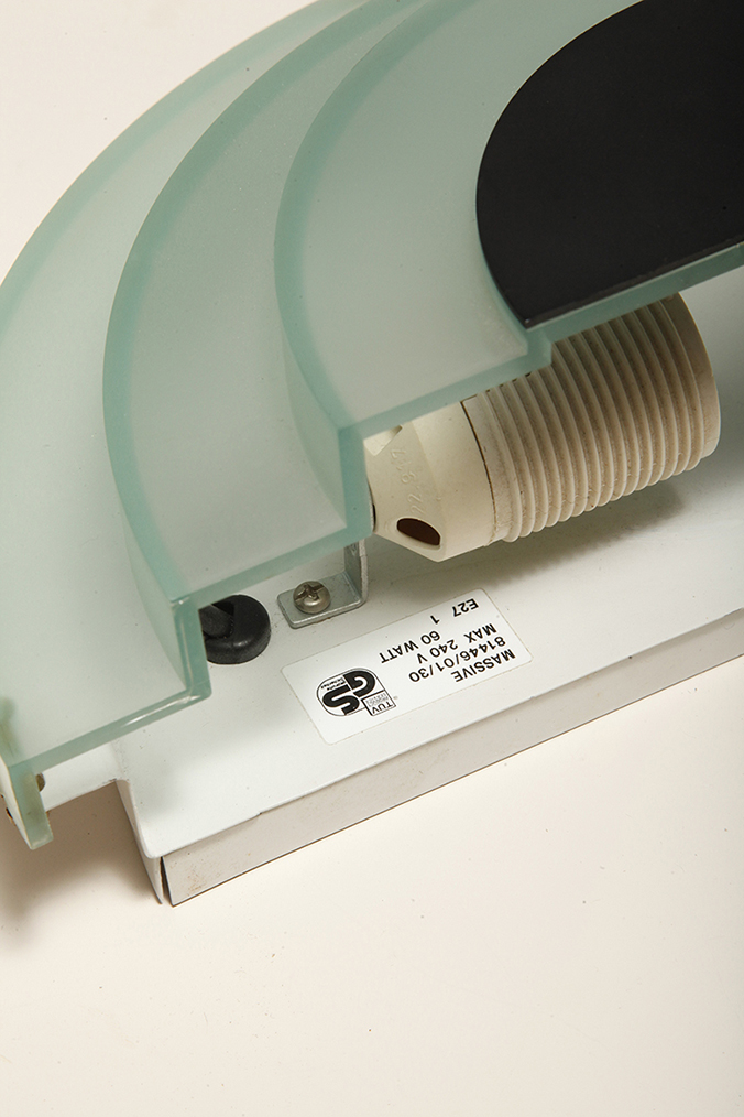 Kaskadowy w pięknym morskim kolorze w zielonym odcieniu klosz akrylowy z czarnym półkolem w środku robi całą lampę. Jest w nich duch memphisowego stylu zrodzonego we włoskim Milanówku (Milano), czyli w Mediolanie. Co trzeba napisać i właśnie to teraz robię, klosze (mamy dwie takie lampy) mają delikatne pęknięcia akrylowego klosza w miejscach mocowania ich na uchwyci ściennym. Tam gdzie wkręcane są nieduże śrubki (zdjęcia). Technicznie to bez znaczenia, bo pęknięcie są jedynie przy samych otworach, a wizualnie zupełnie niewidoczne gdy lampa wisi na ścianie.